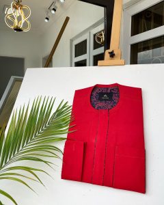 Buy Tomato Red Kaftan With blue and red paisley detailing. Tailors in Lagos Nigeria Canada, United States, Europe, Shop, buy, latest design.