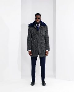 Buy Navy blue and grey tweed funnel neck field jacket in Lagos, Nigeria, Africa, New York, Texas, United Kingdom, USA, Wedding Style