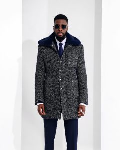 Buy Navy blue and grey tweed funnel neck field jacket in Lagos, Nigeria, Africa, New York, Texas, United Kingdom, USA, Wedding Style