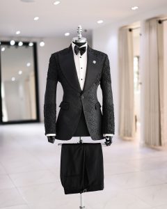 Buy Charcoal Black floral jacquard, peak lapel tuxedo suit in Lagos, Nigeria, Africa, New York, Texas, United Kingdom, USA, Wedding Style