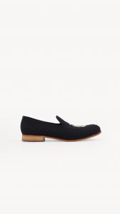 Shop black jacquard – DKLF 09 by Deji & Kola. Black velvet with gold floral accents, handcrafted in Nigeria for weddings and special occasions.