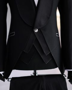 Buy Charcoal black knitted fabric silk-taping tuxedo suit in Lagos, Nigeria, Africa, New York, Texas, United Kingdom, USA, Wedding Style