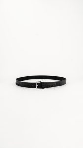 Shop the DKBLT 01 Black Leather Belt by Deji&Kola. Smooth leather, silver logo buckle, cross-stitch details—perfect for casual or tailored looks.