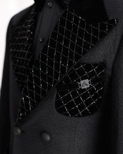 Elevate your style with our Charcoal Black smoking Suit, featuring black floral jacquard, peak lapel and velvet touches. Perfect for weddings and parties, it features sharp lapels and fine detailing.