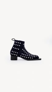 Shop a blue velvet Chelsea boot – the DKBT 03 by Deji & Kola. Featuring squared toes, silver branded studs and a side zipper. Perfect for parties and special occasions.