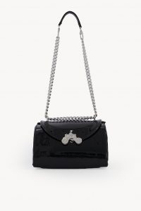 Buy the DKSB-02, a structured black leather shoulder bag with a silver-tone chain strap and signature Deji & Kola clasp. Elegant, modern, and versatile.