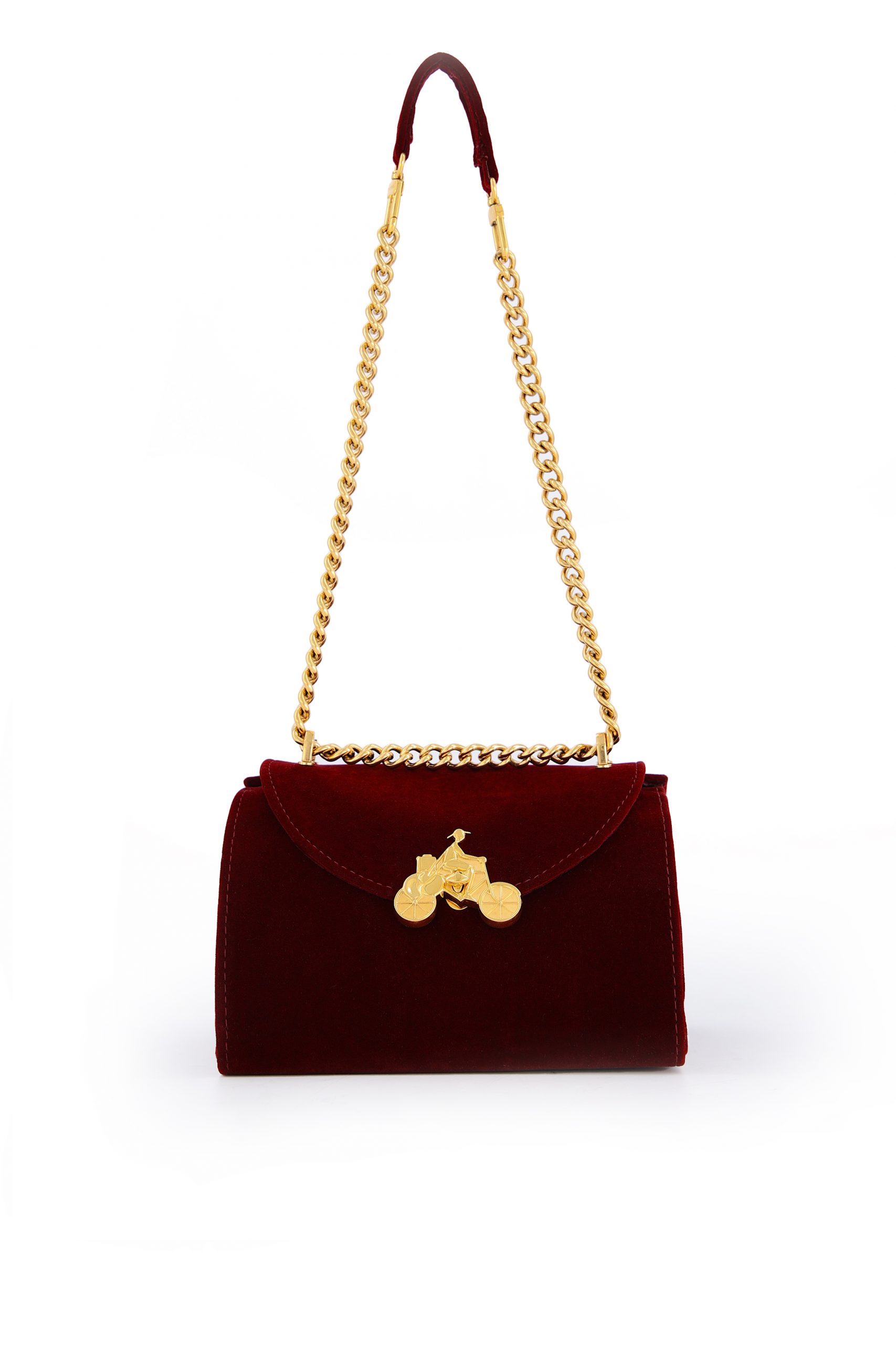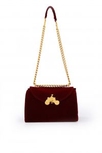 Shop the DKSB-05, a structured burgundy velvet shoulder bag with a gold-tone chain strap and signature Deji & Kola clasp. Elegant, modern, and versatile.