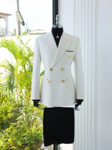 Buy HEA 4 vs 4 Suit an ivory jacquard double-breasted tuxedo featuring peak lapels, custom buttons, and a signature brooch.