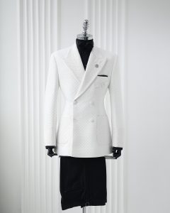 Buy HEA 4 vs 5 Suit in an ivory jacquard double-breasted tuxedo featuring peak lapels, custom buttons, and a signature brooch.