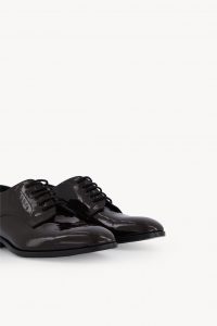 Buy a Brown lace-up shoe – DKDB 07. Made from brown patent leather in Nigeria, this comfortable low-heeled derby is perfect for work, events, or everyday wear.