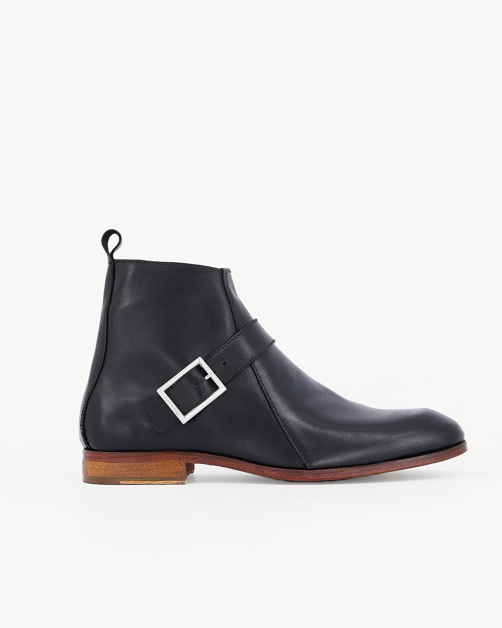 The DKBT 01 is crafted from smooth black leather, perfect for formal occasions and smart-casual looks. It features a slightly pointed toe, a streamlined silhouette, a side zipper for easy wear, and a decorative buckle strap. The flat, durable sole ensures lasting comfort and stability.
