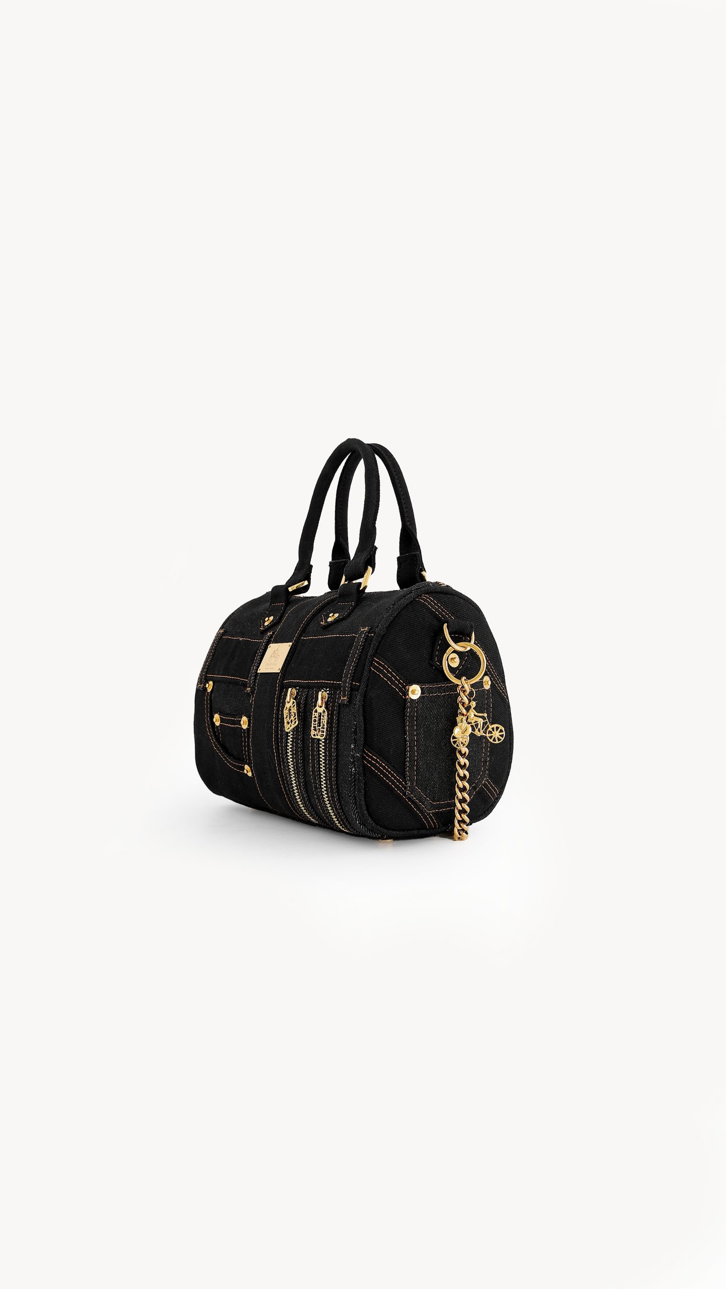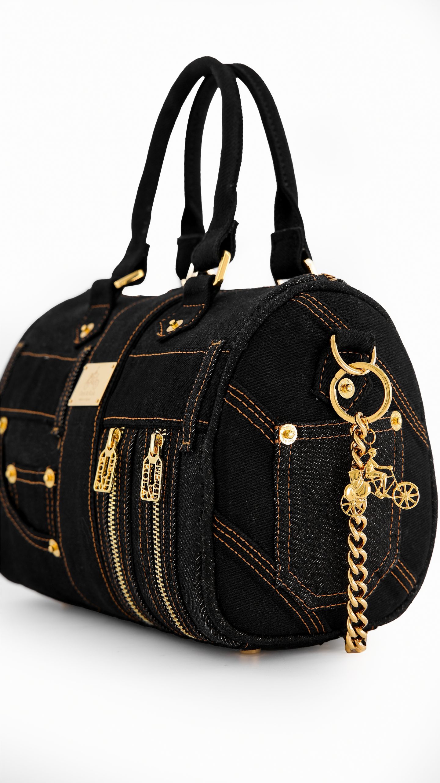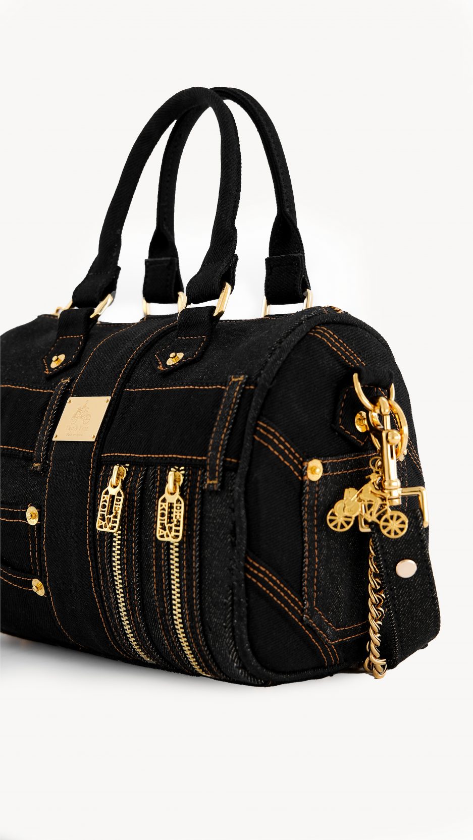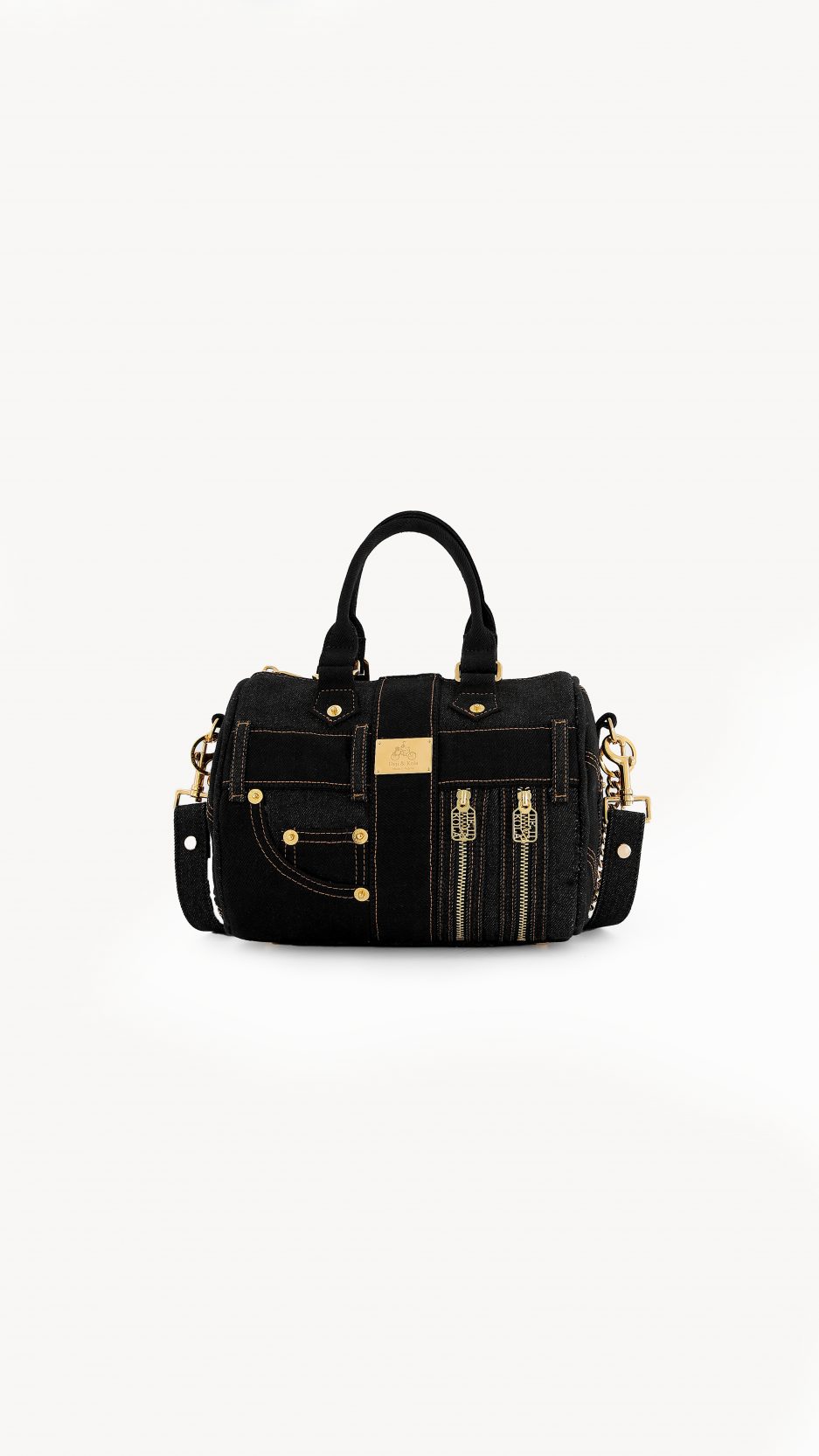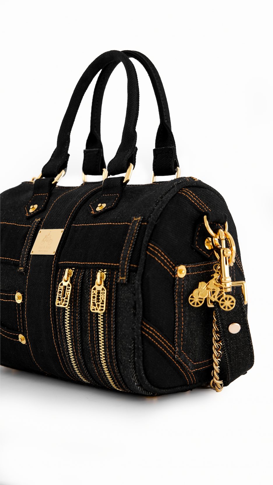 The DKDB-03 is Made from durable black denim, this mini duffel is both functional and stylish. It features the Deji & Kola logo, gold hardware, and a detachable chain for when you want to go hands-free. With plenty of space inside and extra outer partings for quick grabs, it’s a bag you can count on every day, from work runs to casual hangouts.