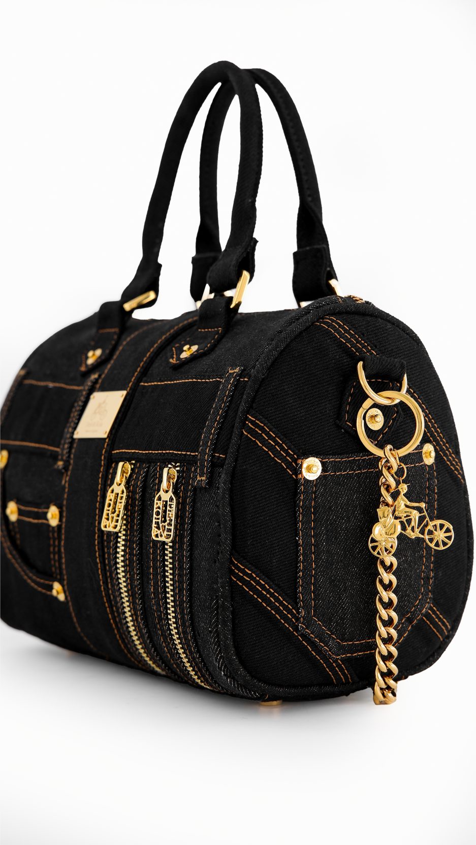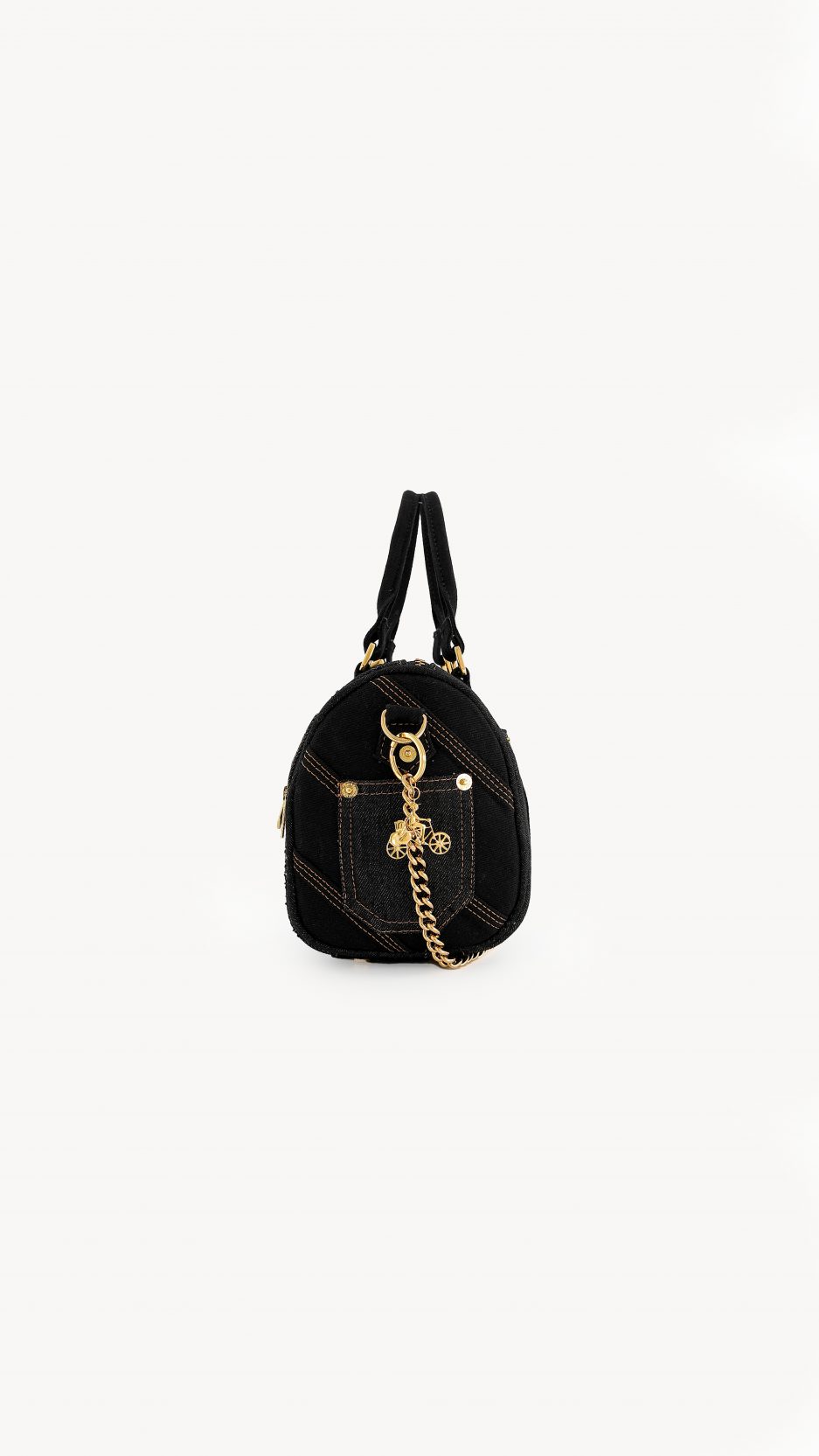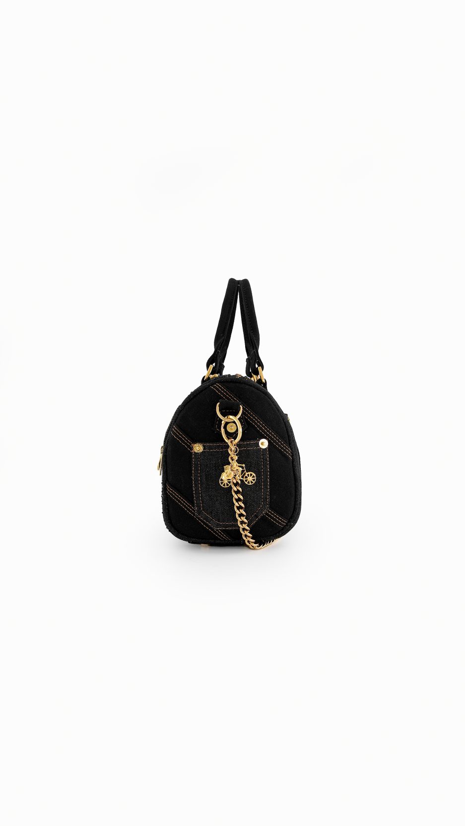 - Black denim body.