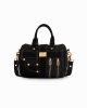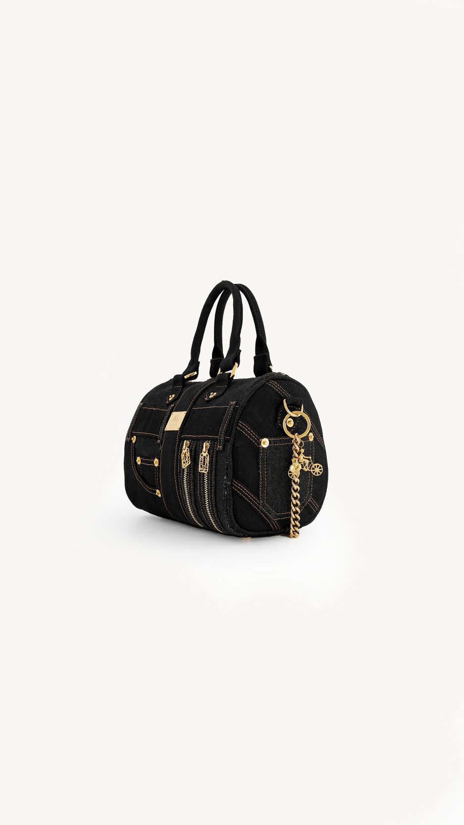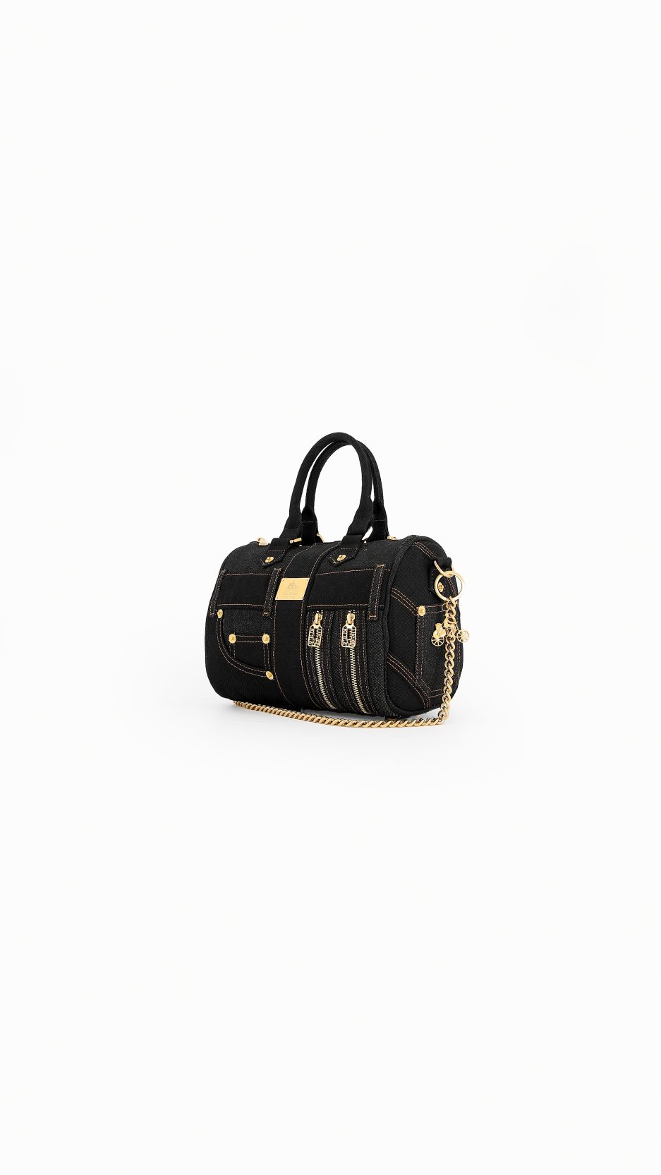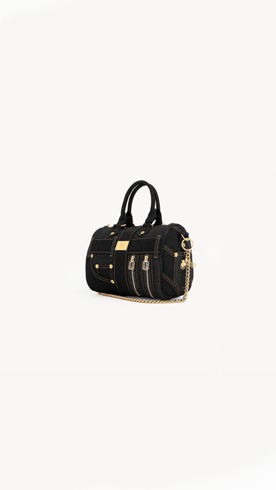 - Black denim body.