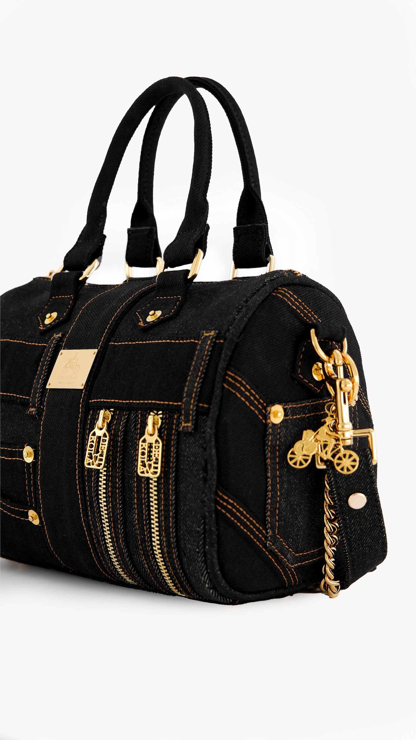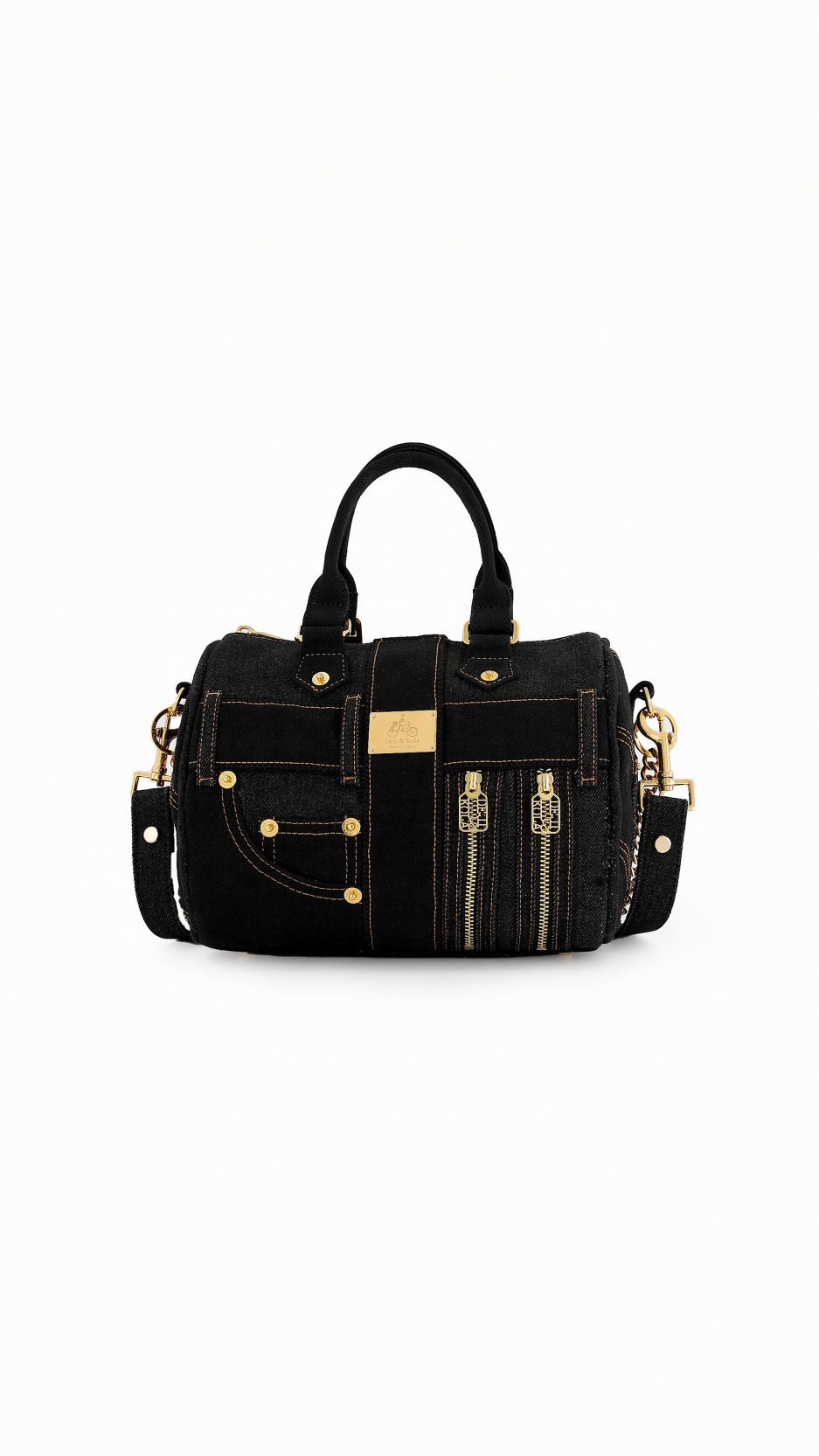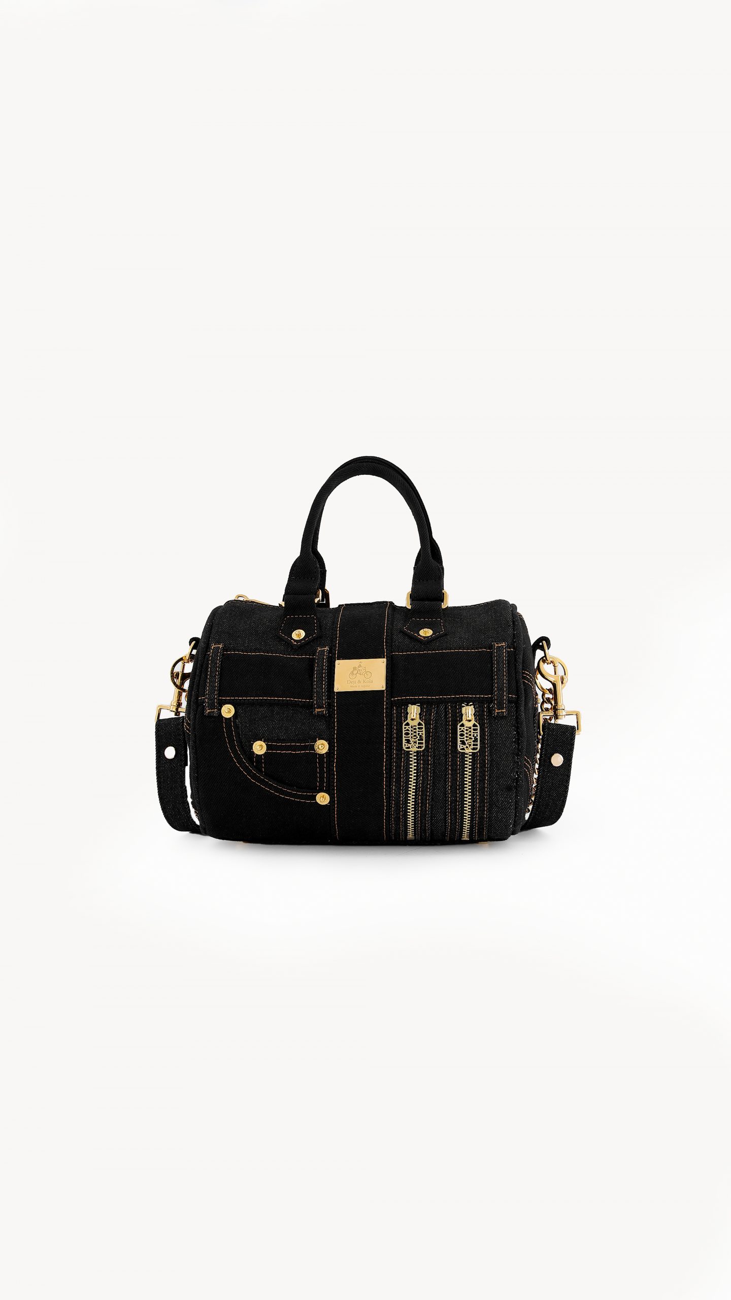 - Gold-toned hardware with Deji & Kola logo.
