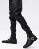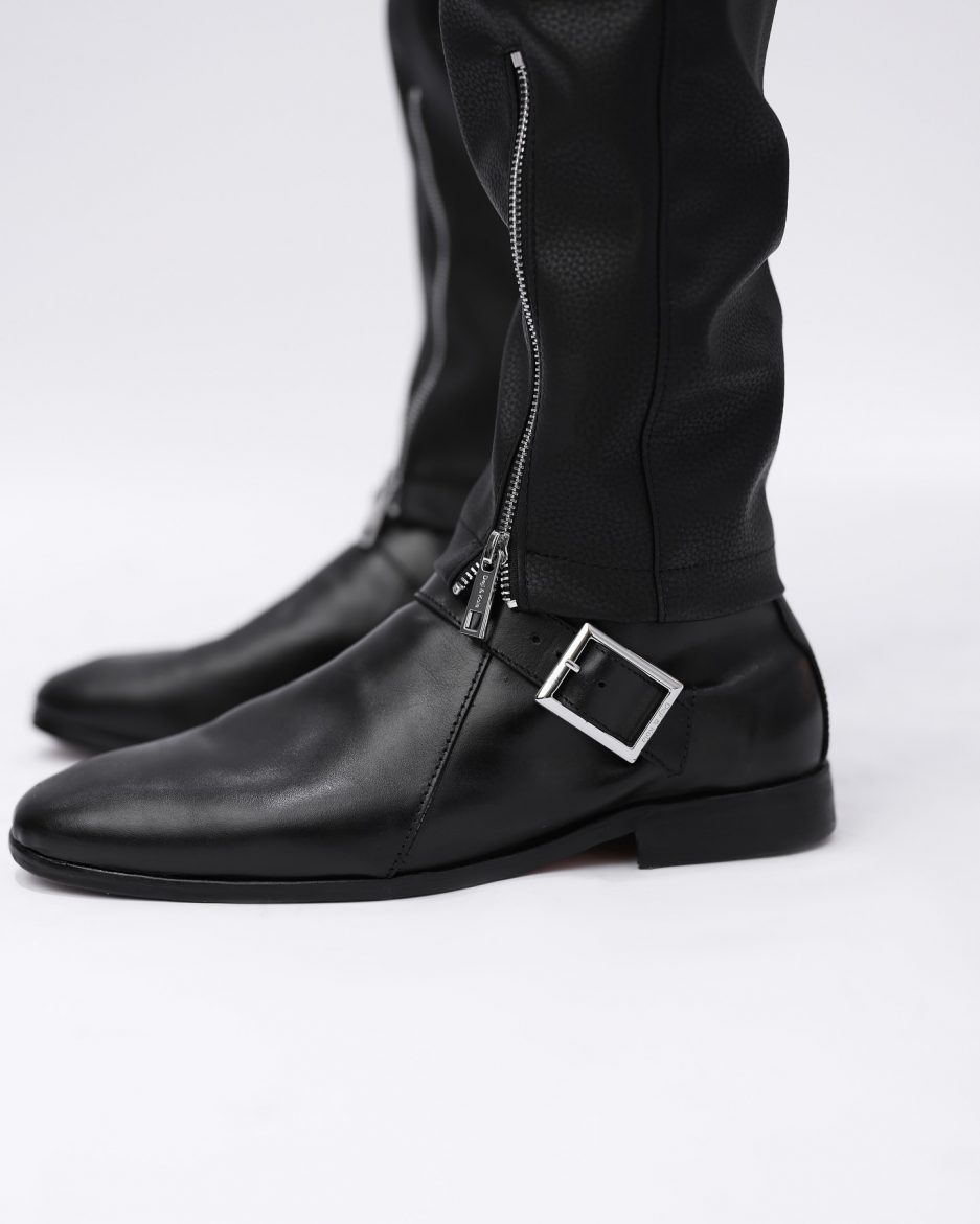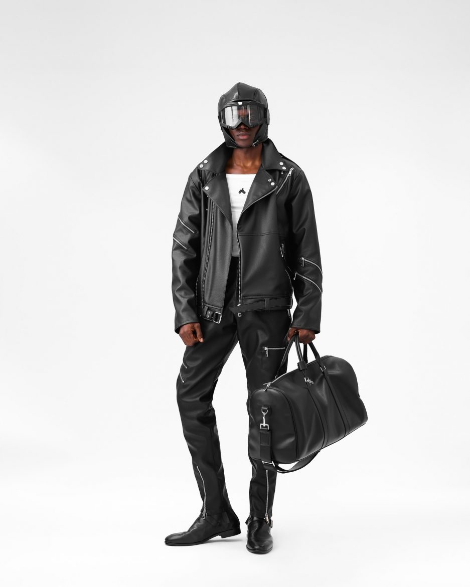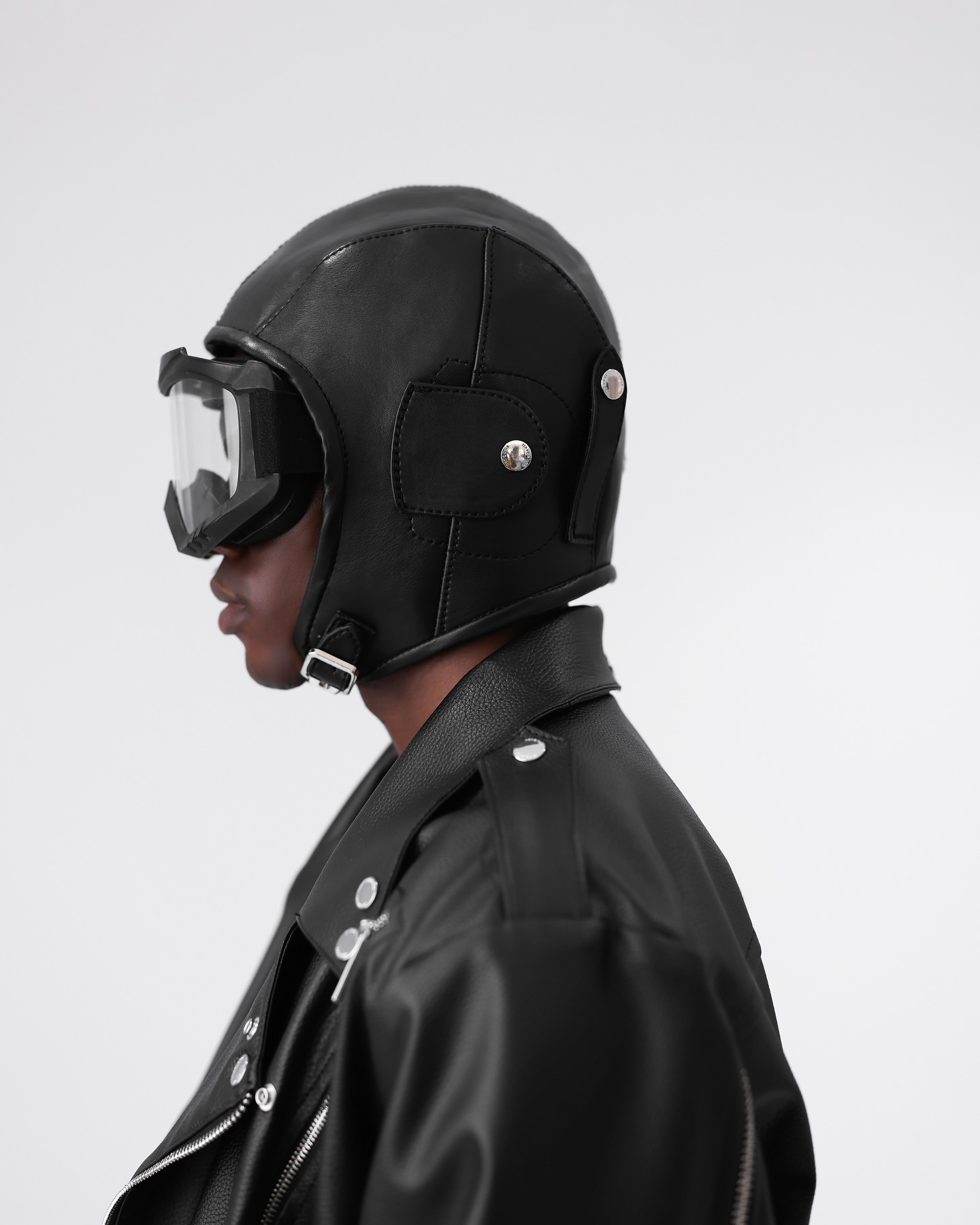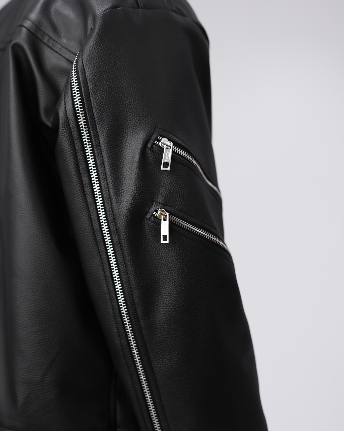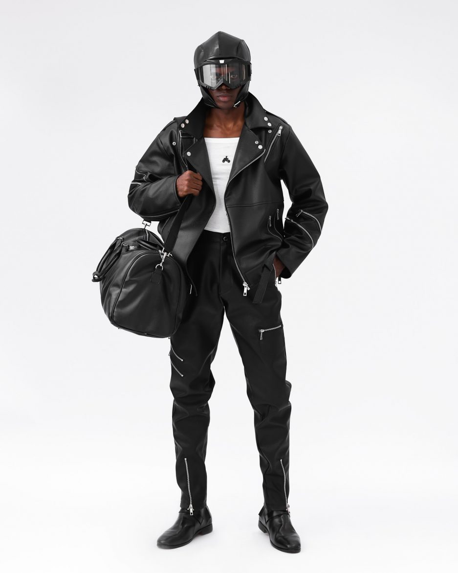 The UCS 2 – Leather Jacket is A charcoal black jacket crafted from grained leather that feels sturdy yet comfortable. It features multiple Deji & Kola-branded zippers and snap buttons, an asymmetric zip closure, a belted waist, and silver-tone hardware that elevate the classic biker aesthetic. Functional zippered pockets and cuffs add both style and utility, while shoulder epaulettes and a sharp collar give it a commanding presence. Perfect for casual outings, traveling, and fashion events.