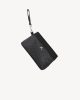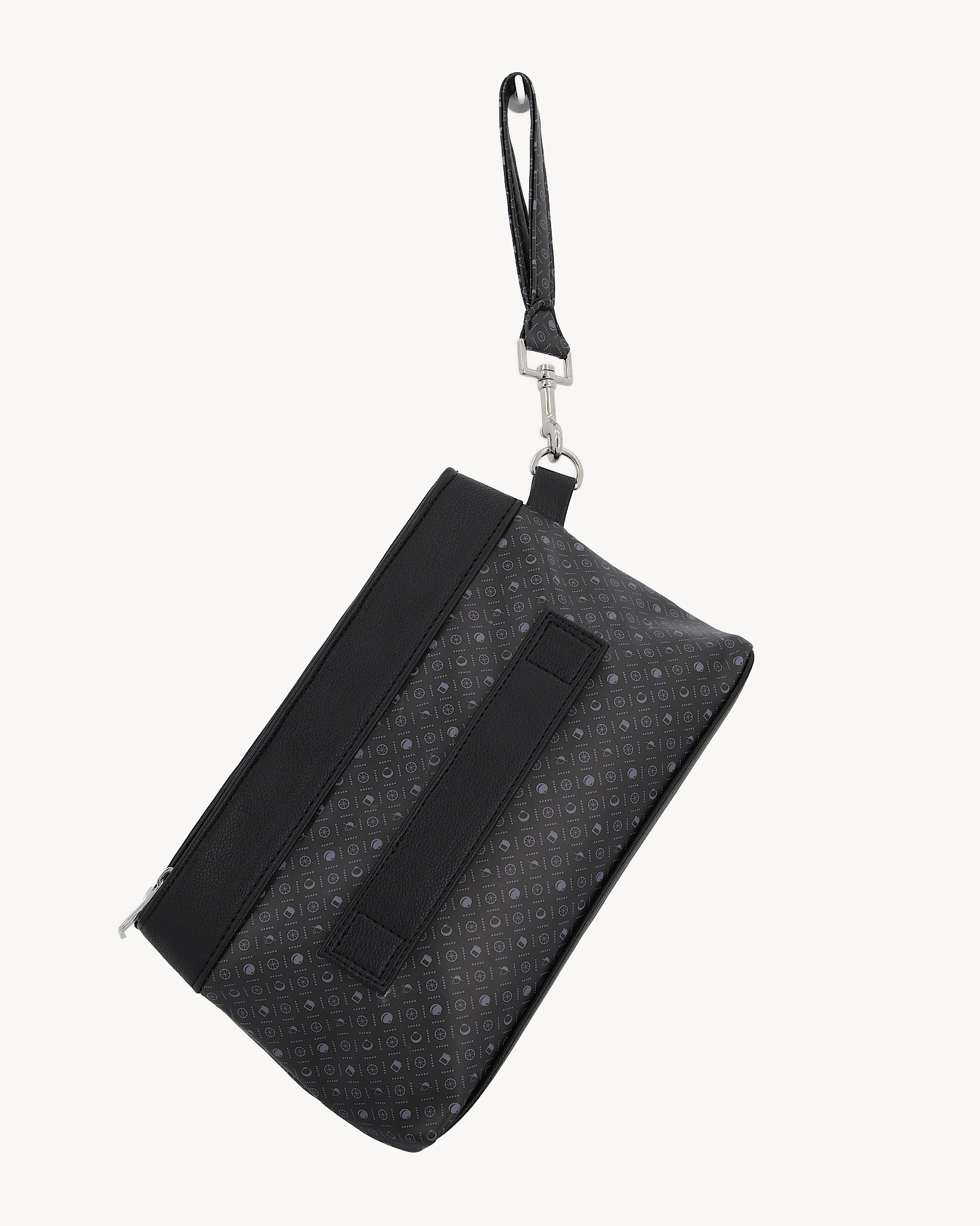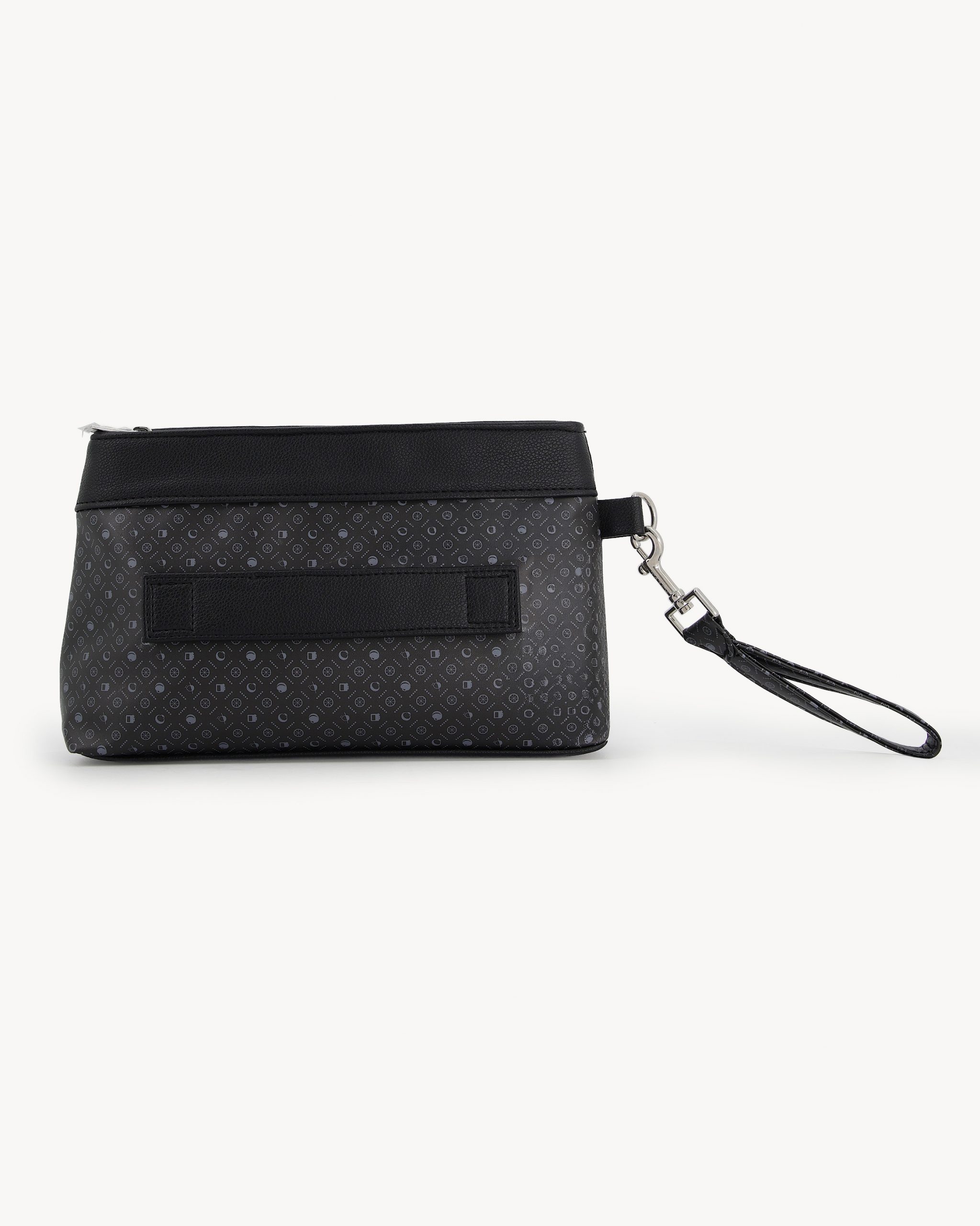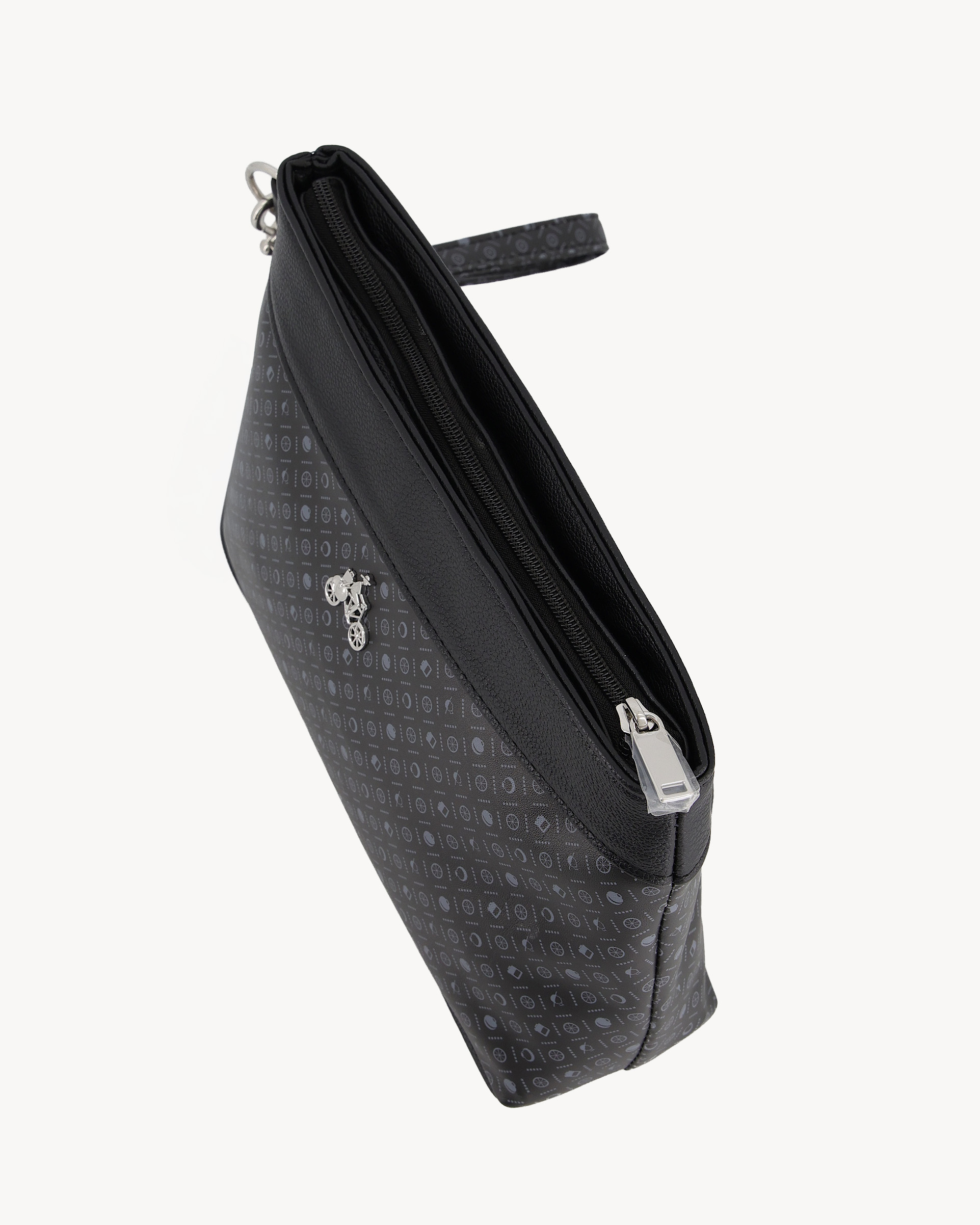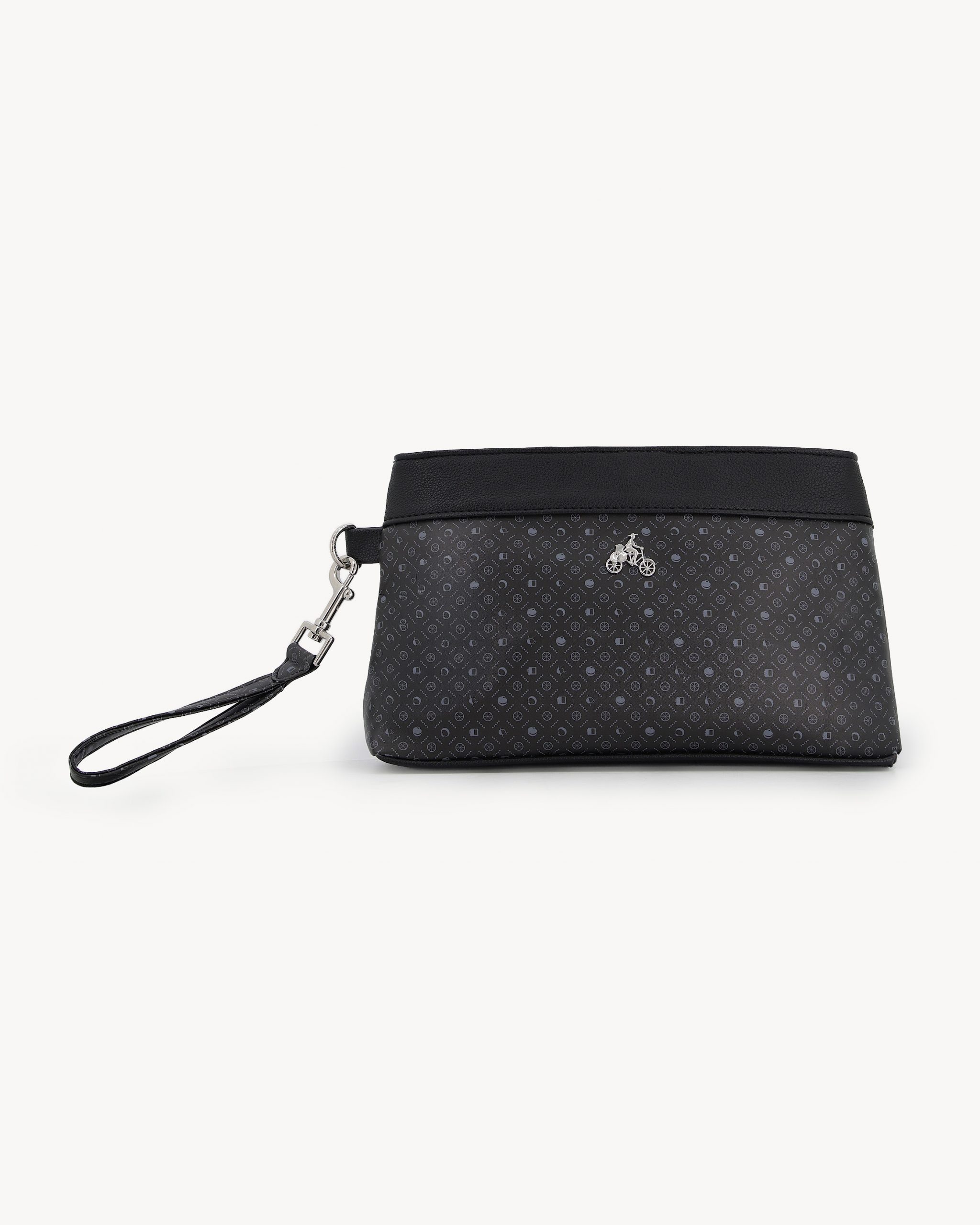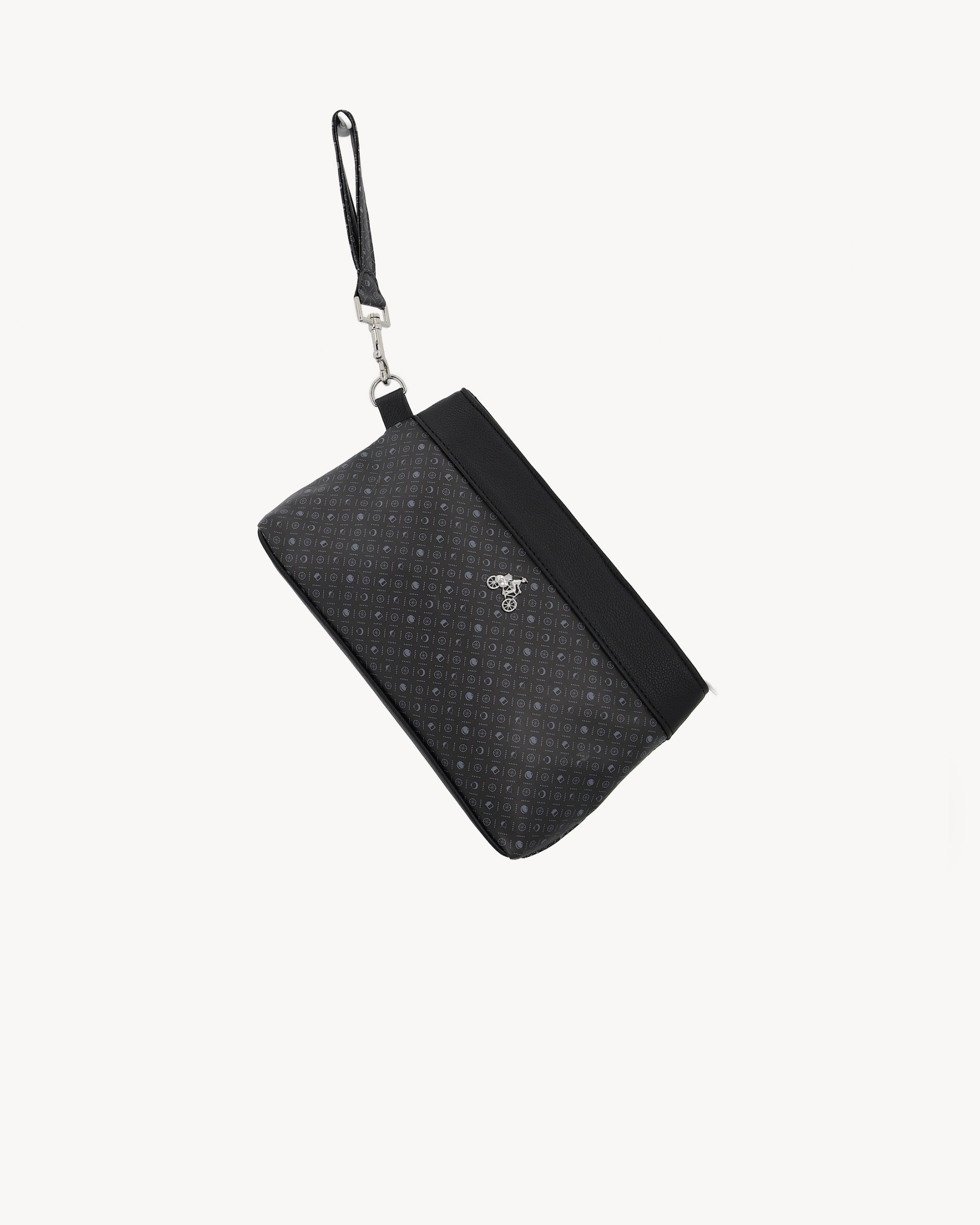 The DKWR 01 is crafted in a black monogram finish with smooth black leather trim, defined by a structured pouch silhouette and clean zip closure. It is finished with a silver-tone bicycle emblem and a detachable wrist strap for flexible carry. Designed for travel, events, and everyday use.