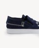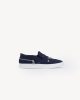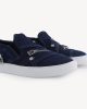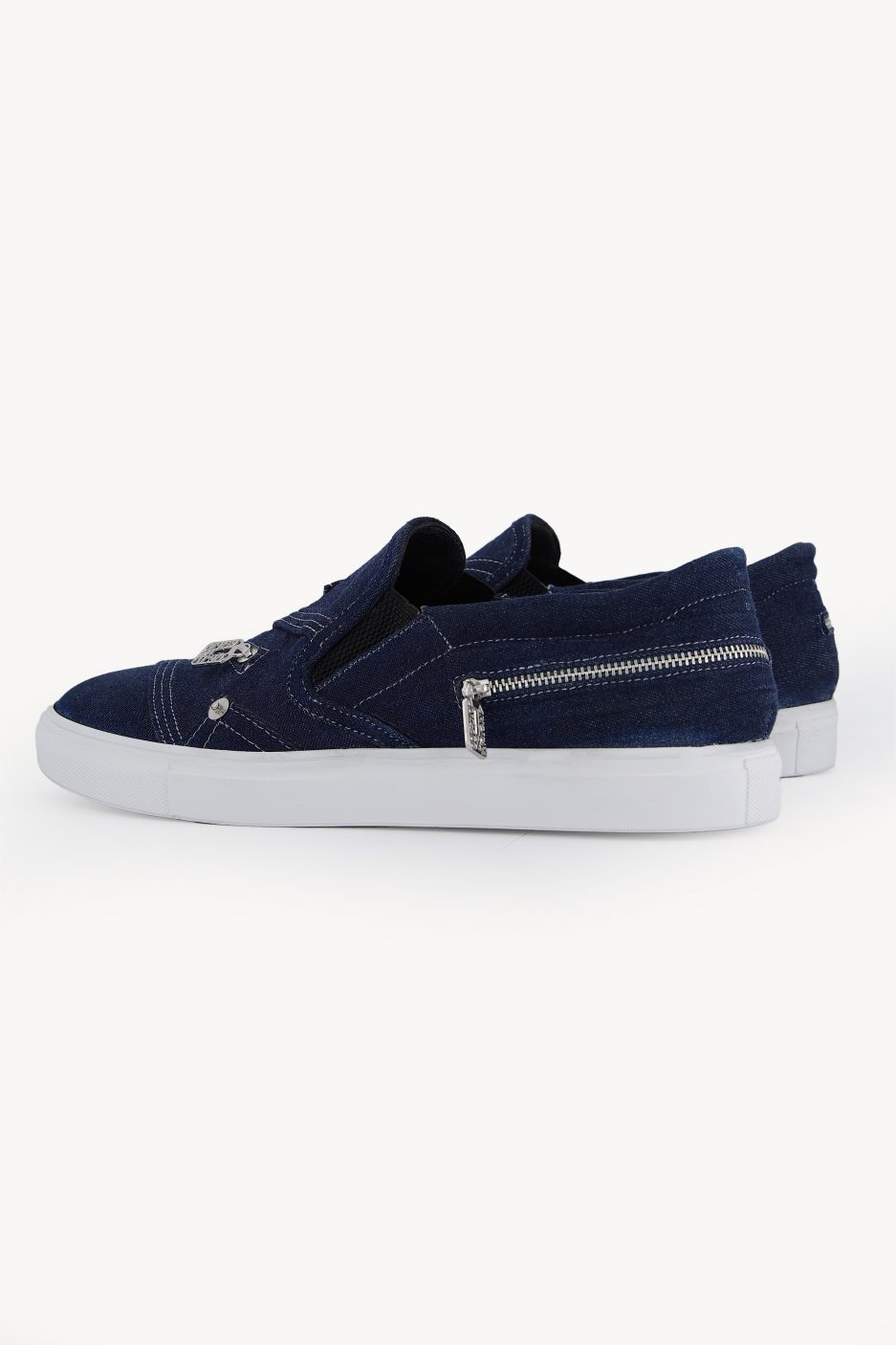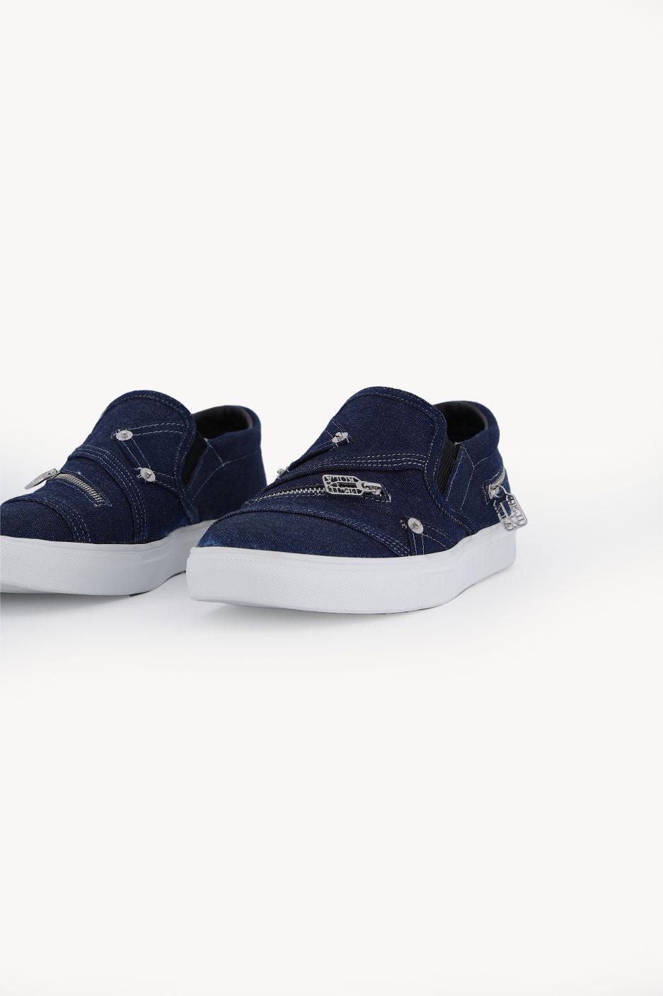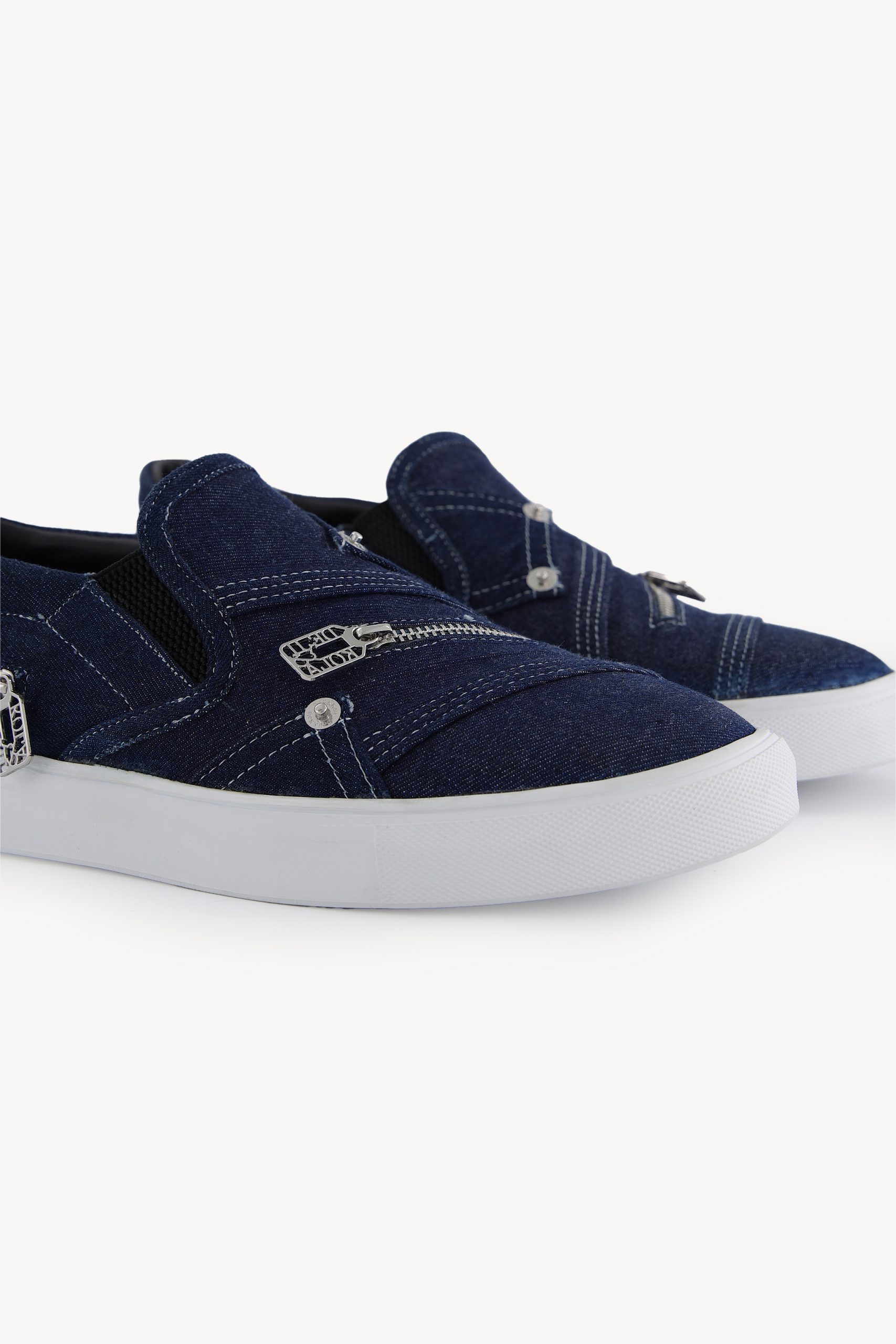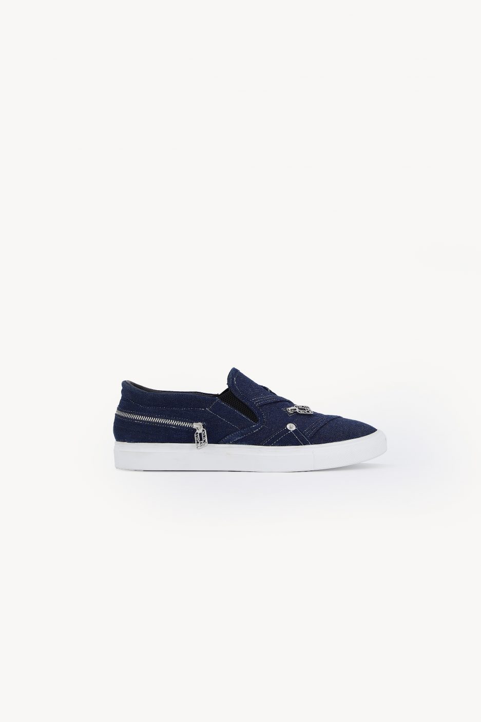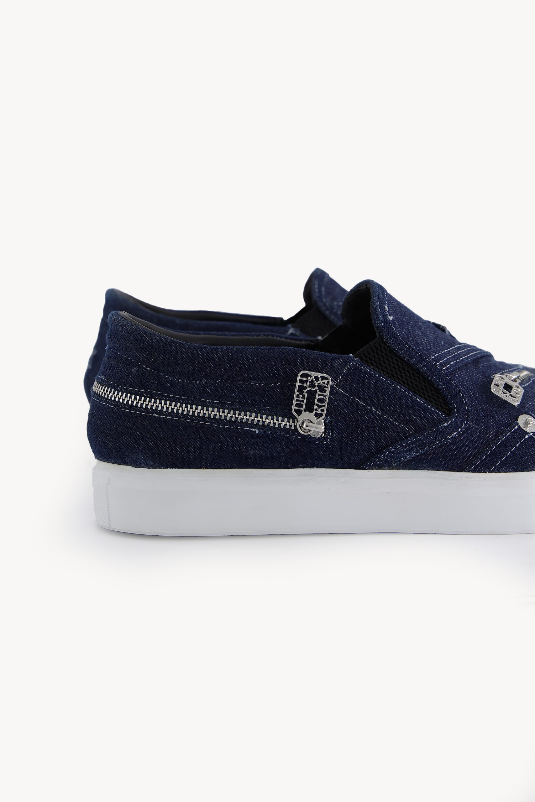 The DKSN-01 is a slip-on sneaker made from blue denim. It features silver zippers on the top and back, and a white rubber sole for comfort. An easy, versatile shoe for everyday wear.