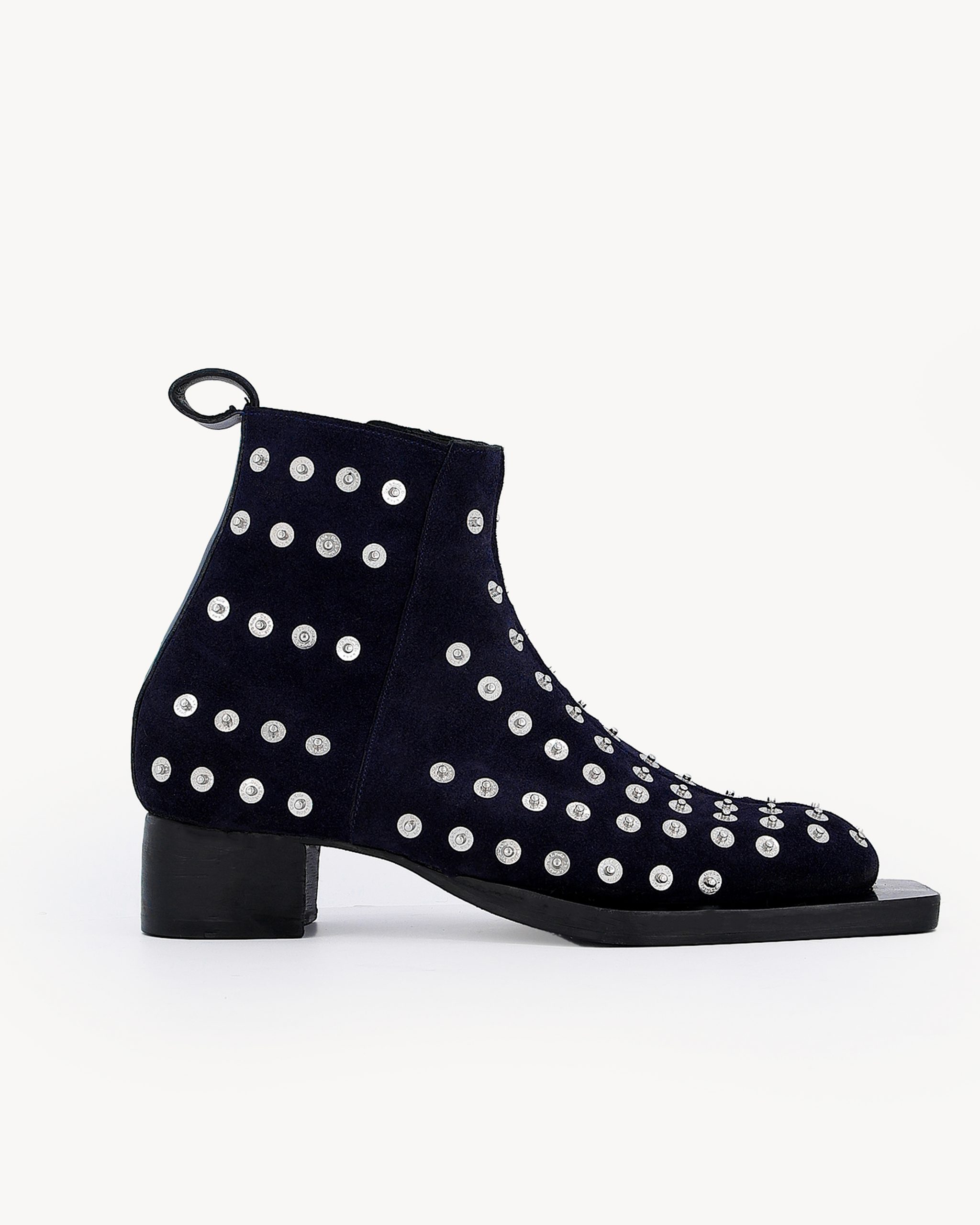 The DKBT 03 is crafted from blue velvet and designed with a squared toe and elevated heel for a sleek finish. Silver signature rivets add a touch of detail, while a side zipper ensures easy wear. This pair is perfect for parties and special occasions.