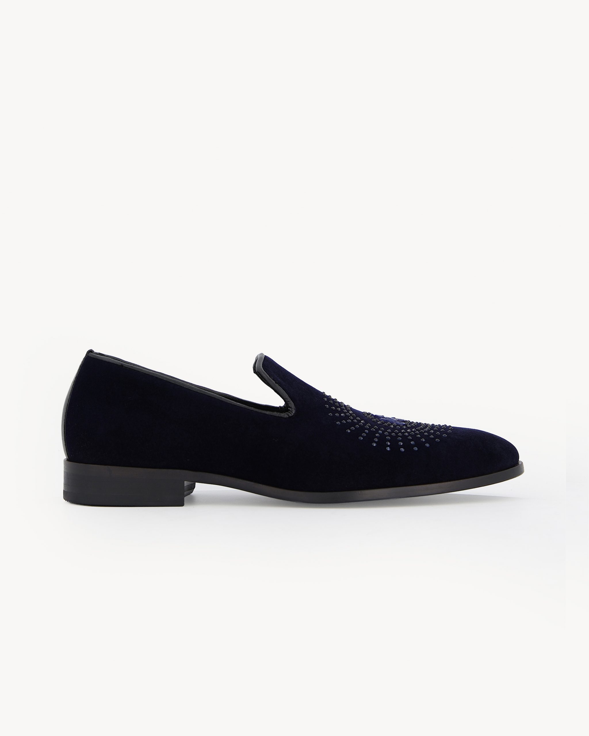 DKLF 19 – Loafer – This blue velvet slip-on shoe has a soft feel and a clean look, finished with circular stones arranged neatly on the upper. It’s comfortable on the inside and has a low, easy-to-wear shape. Simple, stylish, and a good match for both native and casual outfits.