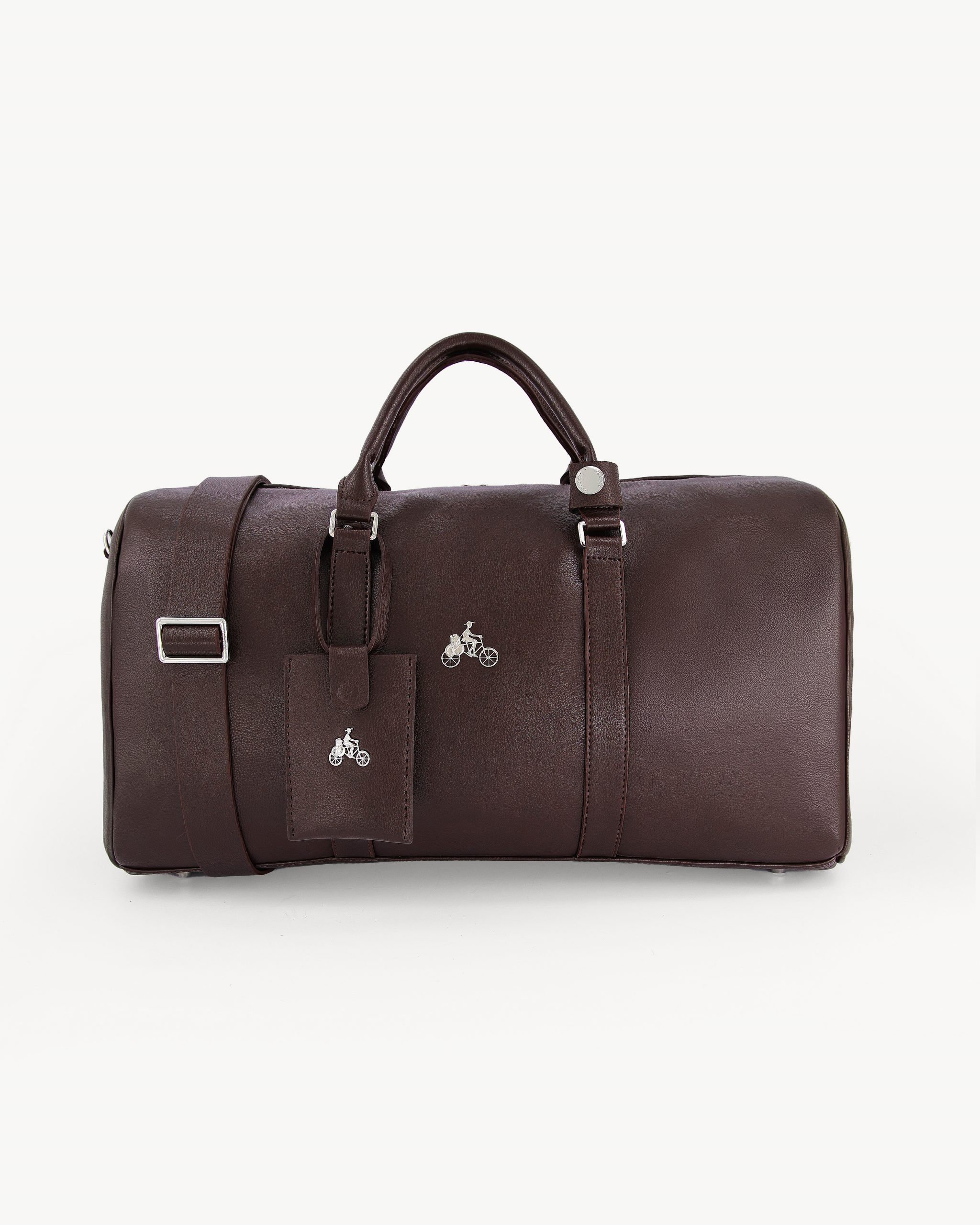 The DKDB 01 duffle bag is made entirely from premium brown leather. It features a stainless-steel logo at the front and polished silver-toned hardware. A spacious main compartment with internal zip and slip pockets keeps essentials secure, while top handles and a detachable strap allow both hand and crossbody carry.