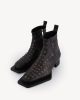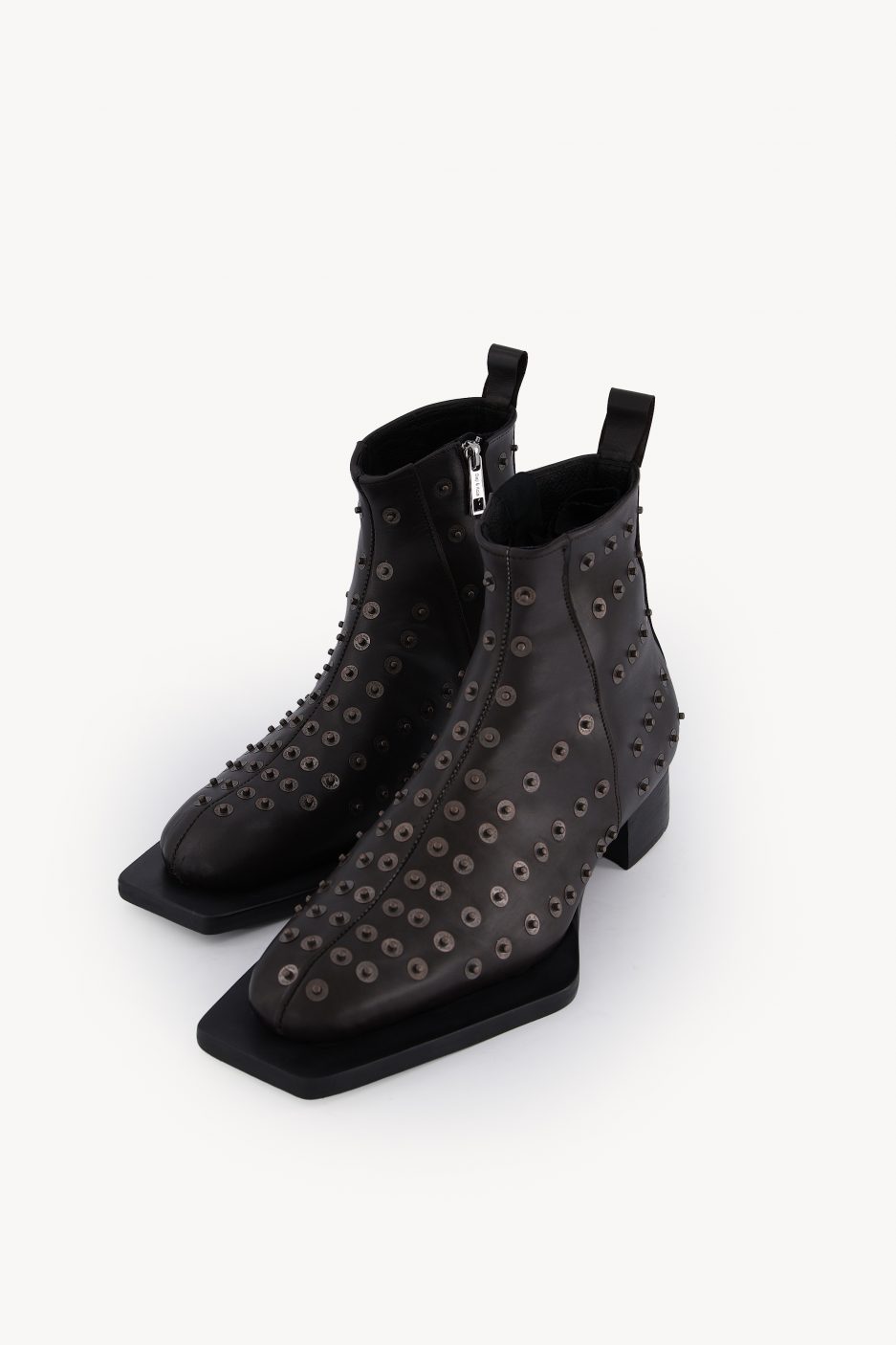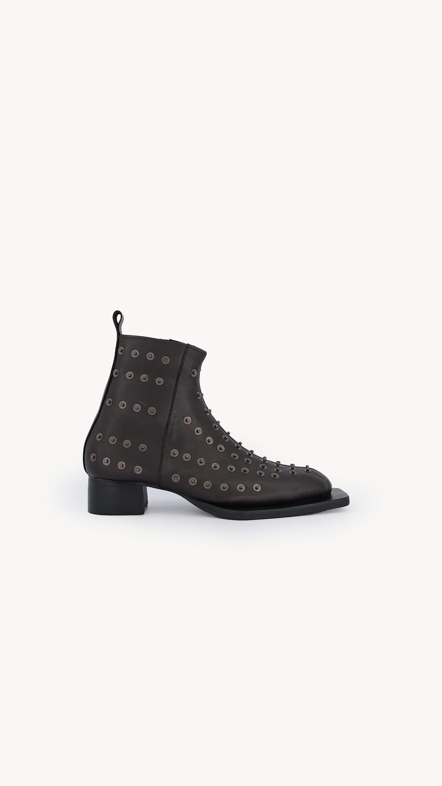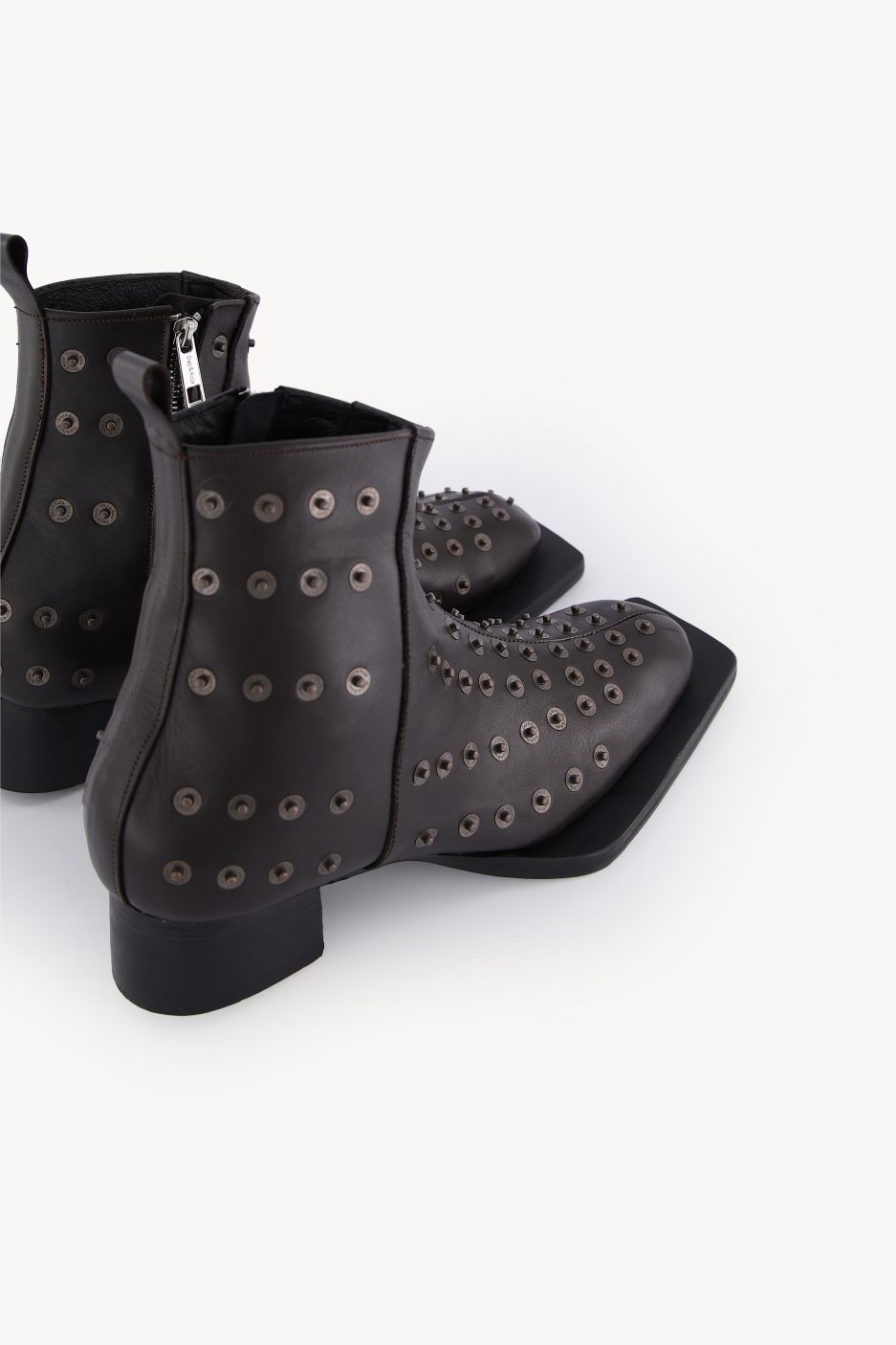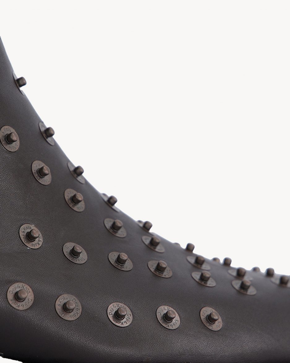 The DKBT 03 is crafted from brown leather and designed with a squared toe and elevated heel for a sleek finish. Brown branded snap studs add a touch of detail, while a side zipper ensures easy wear. This pair is perfect for parties and special occasions.