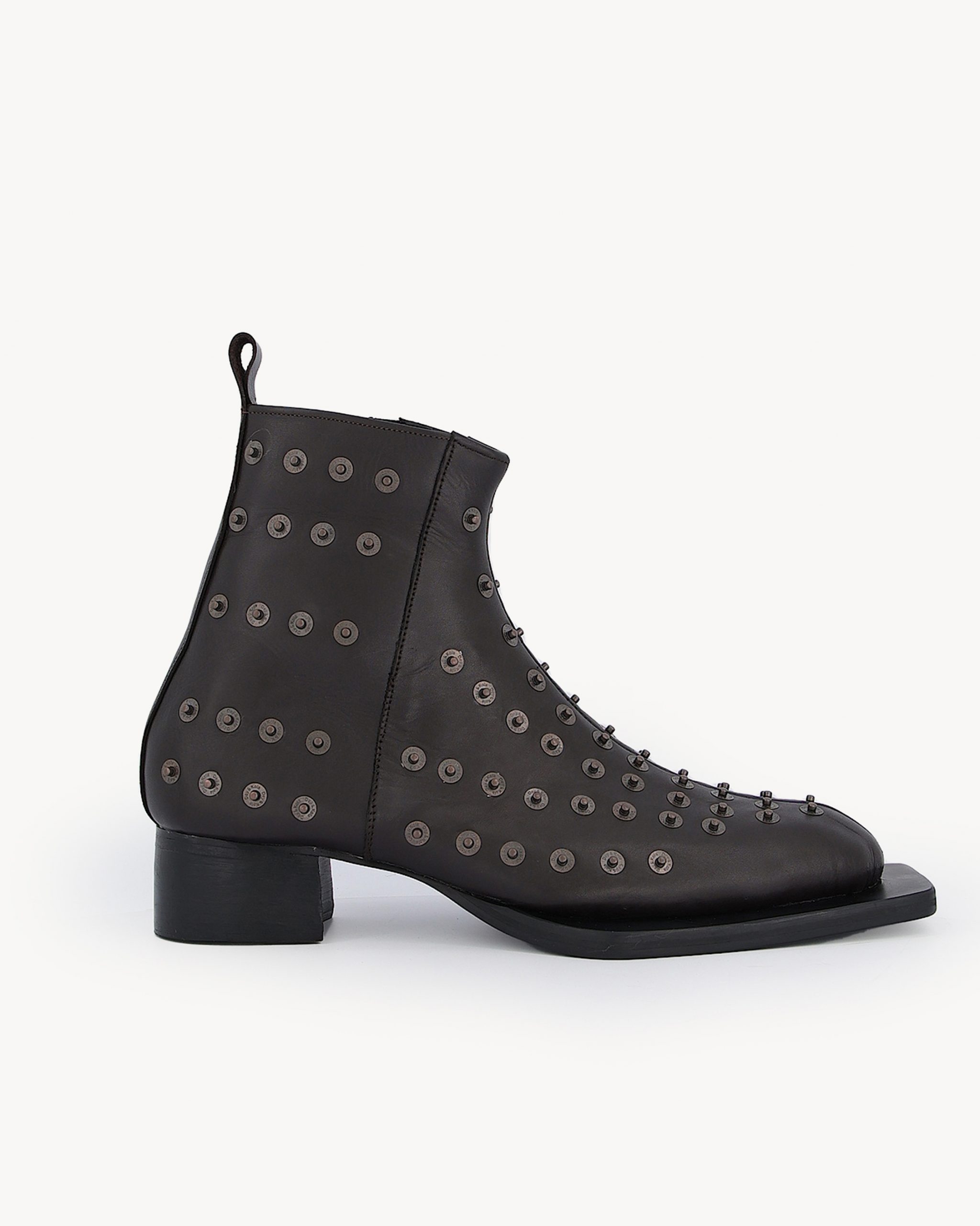 The DKBT 03 is crafted from brown leather and designed with a squared toe and elevated heel for a sleek finish. Brown branded snap studs add a touch of detail, while a side zipper ensures easy wear. This pair is perfect for parties and special occasions.