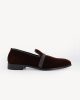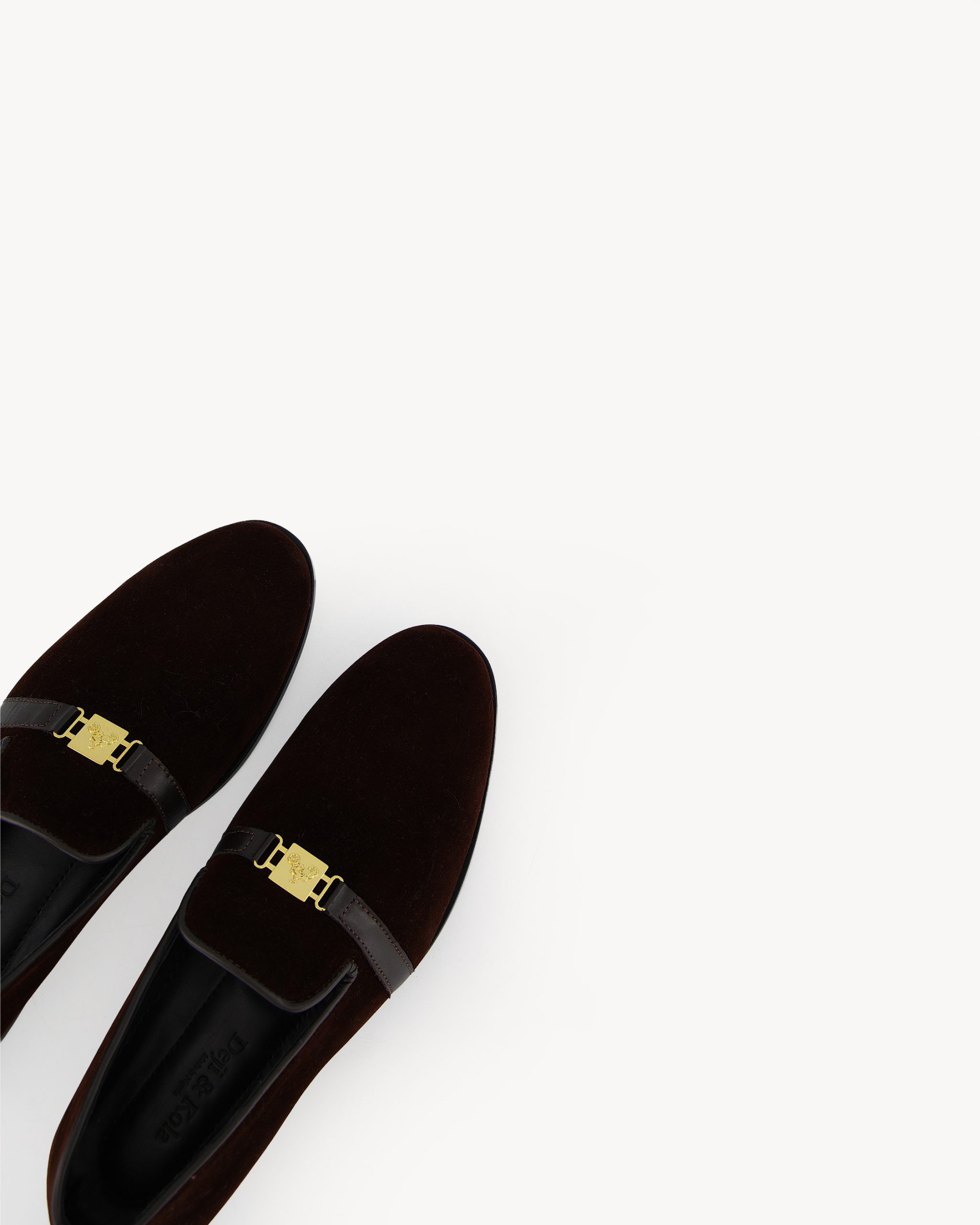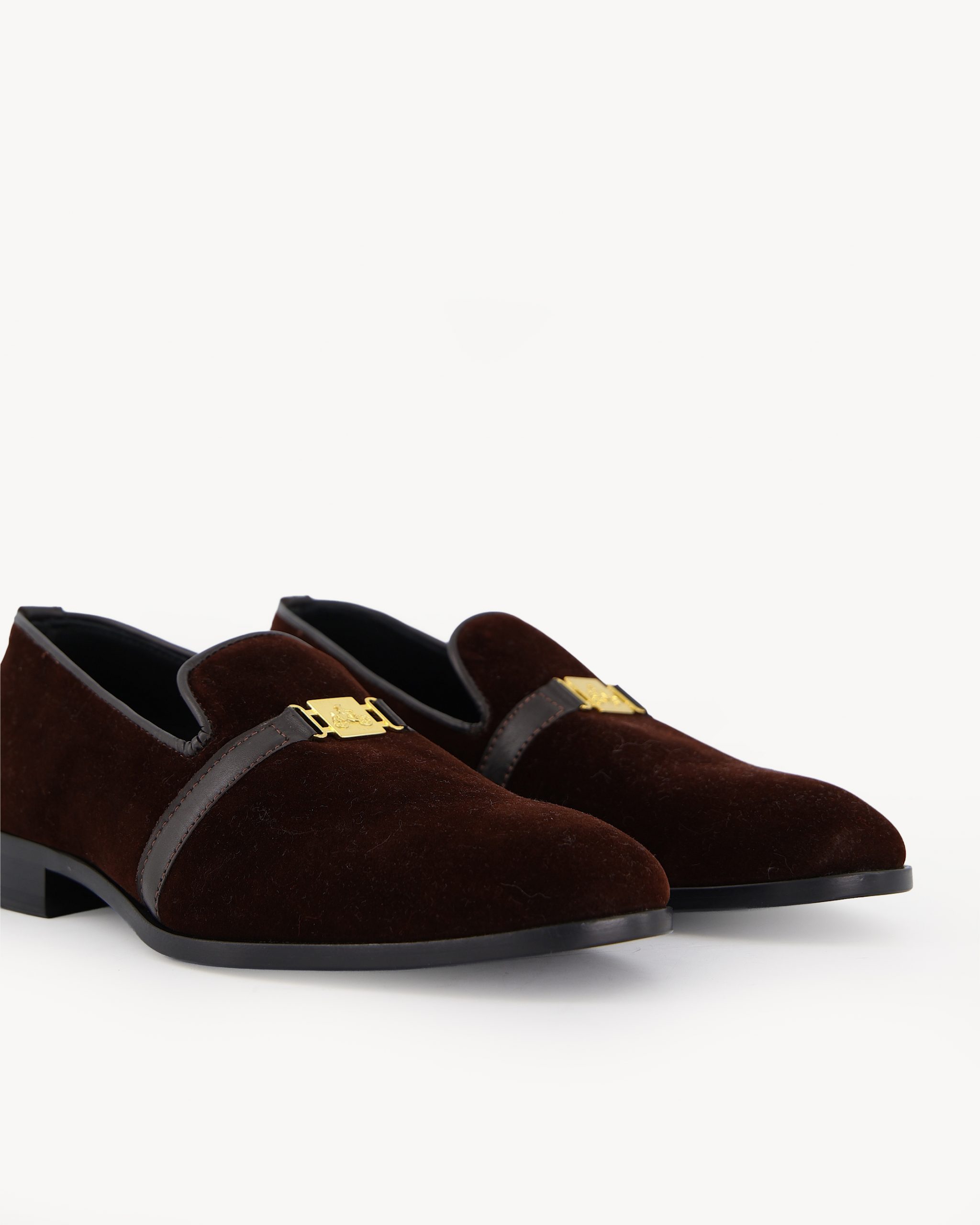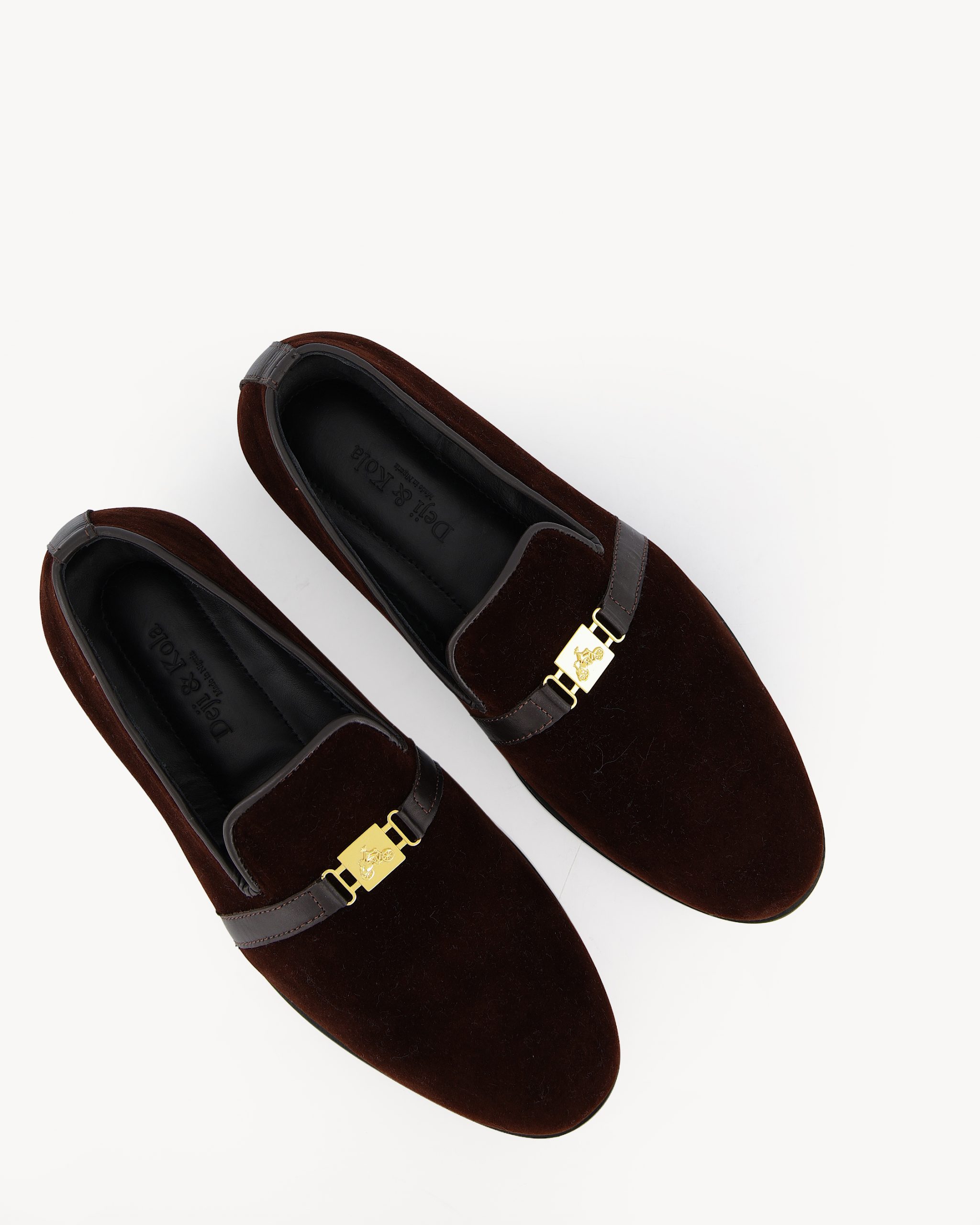 DKLF 21 – Loafer – Crafted from burgundy velvet, this loafer features a brown strap leather that crosses over the upper for a clean, classic look. It is finished with a flat gold Deji&Kola signature logo for a subtle touch of elegance. Perfect for formal events, cultural gatherings, or smart everyday wear.