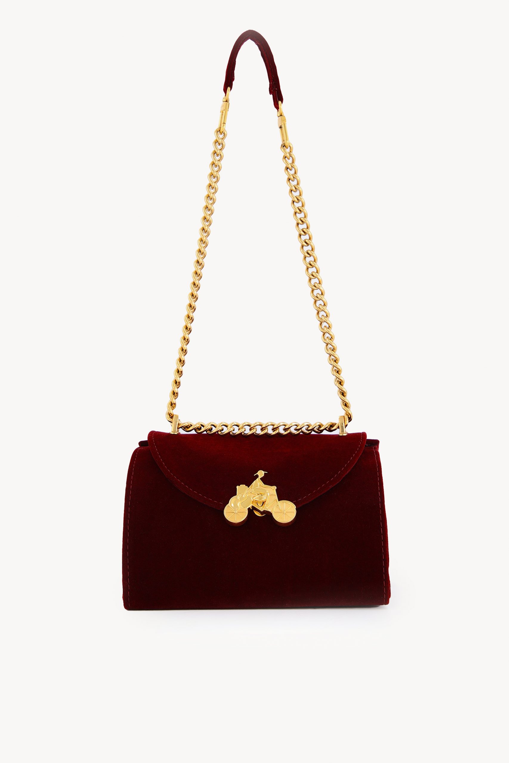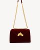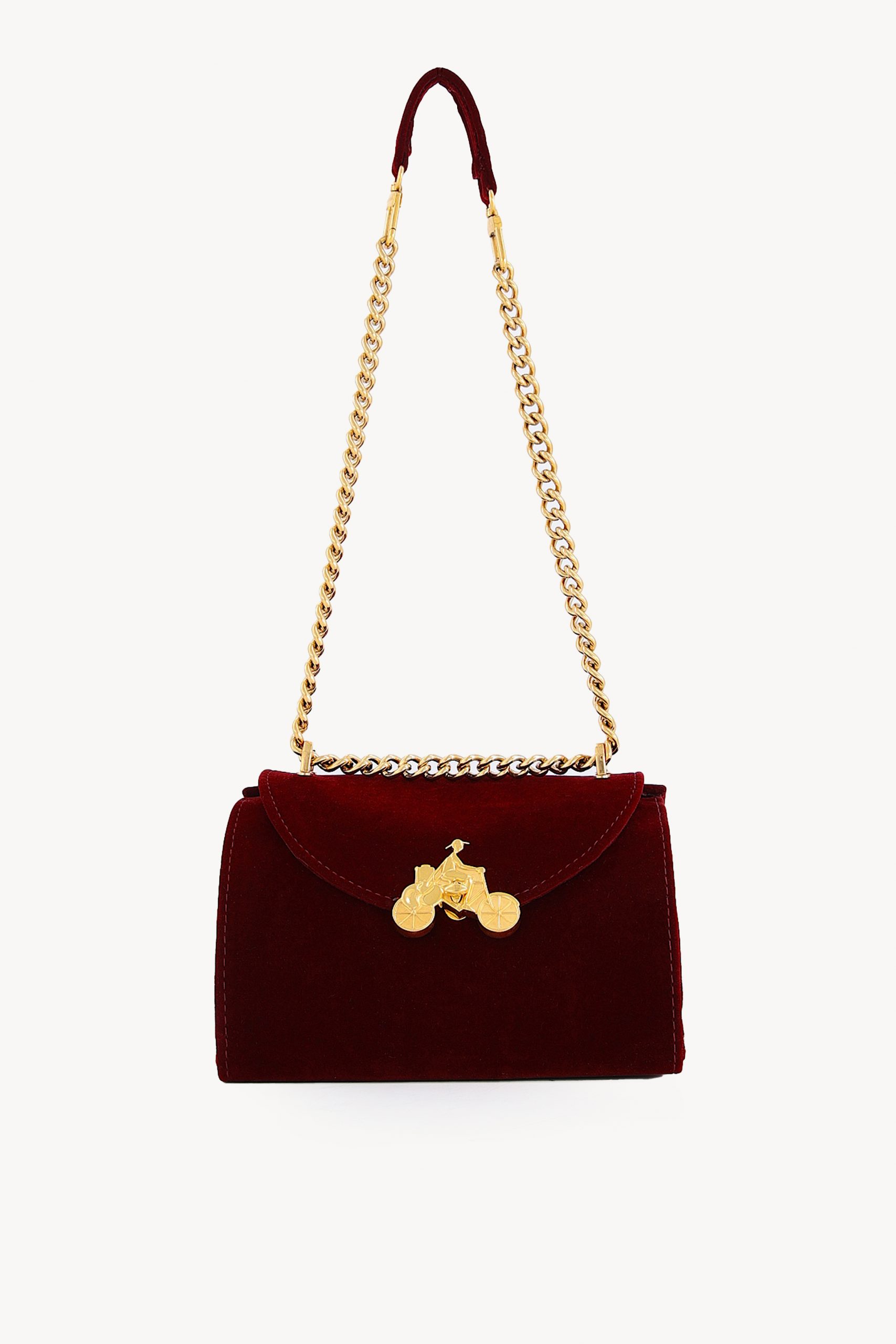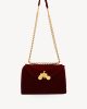 - Gold chain strap with leather shoulder detail.