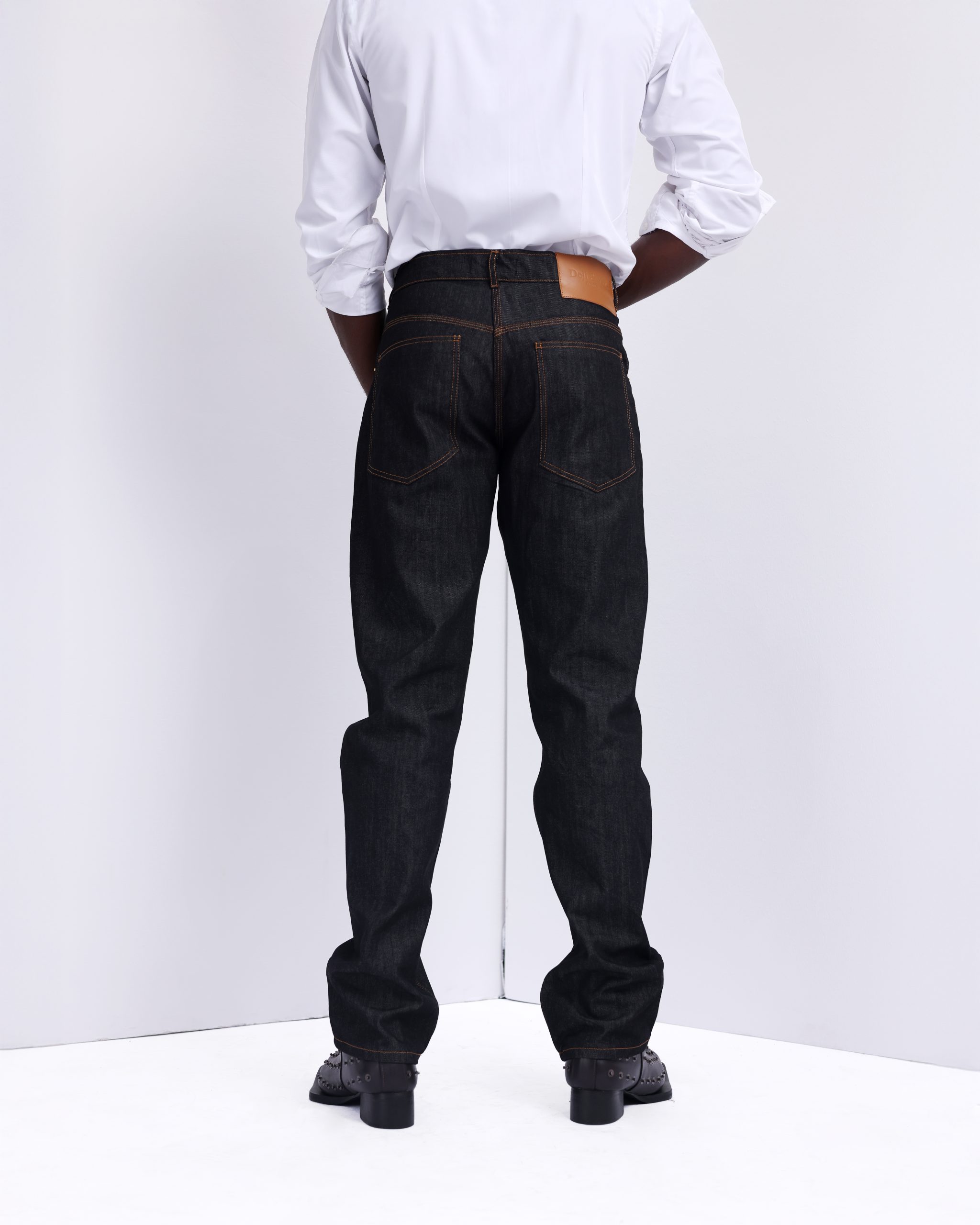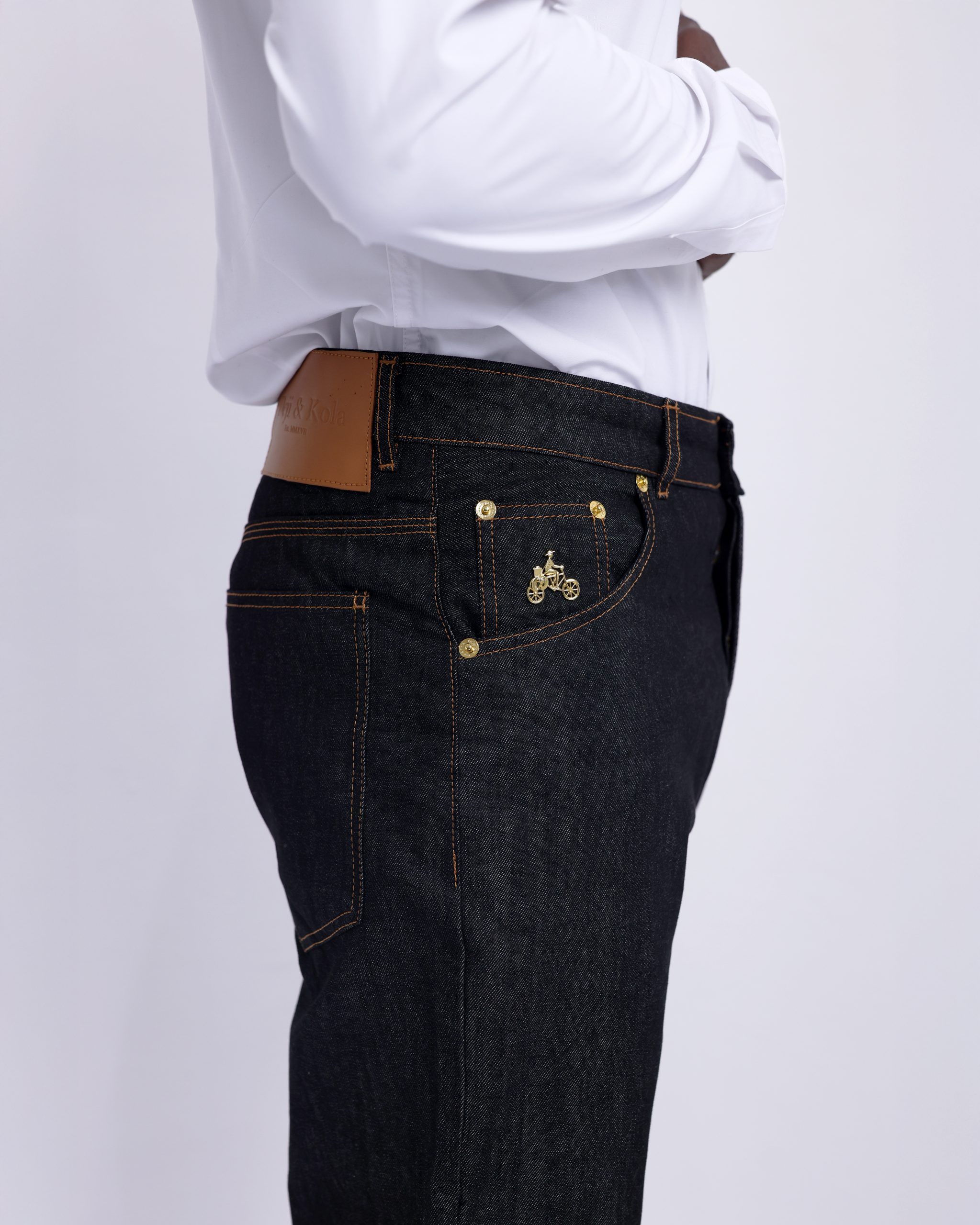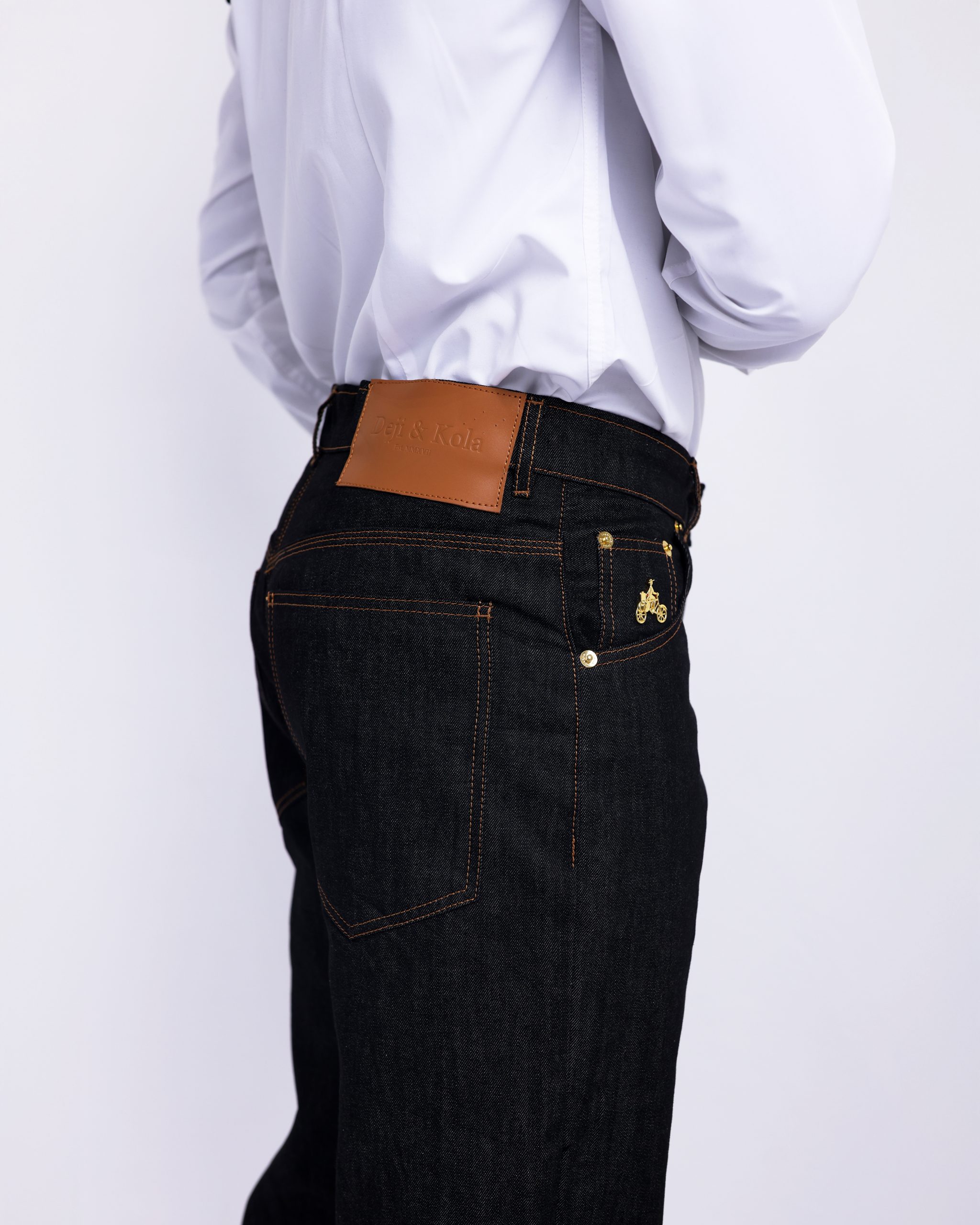 The UC3-LK 7 Denim Trousers are crafted from a rich, dark wash denim. These trousers feature custom gold-tone hardware, rivets, and buttons, our signature logo placed on the coin pocket. Finished with a large, embossed tan leather Deji & Kola patch on the rear waistband, these trousers are perfect for smart-casual events or as an elevated replacement for standard daily denim.