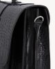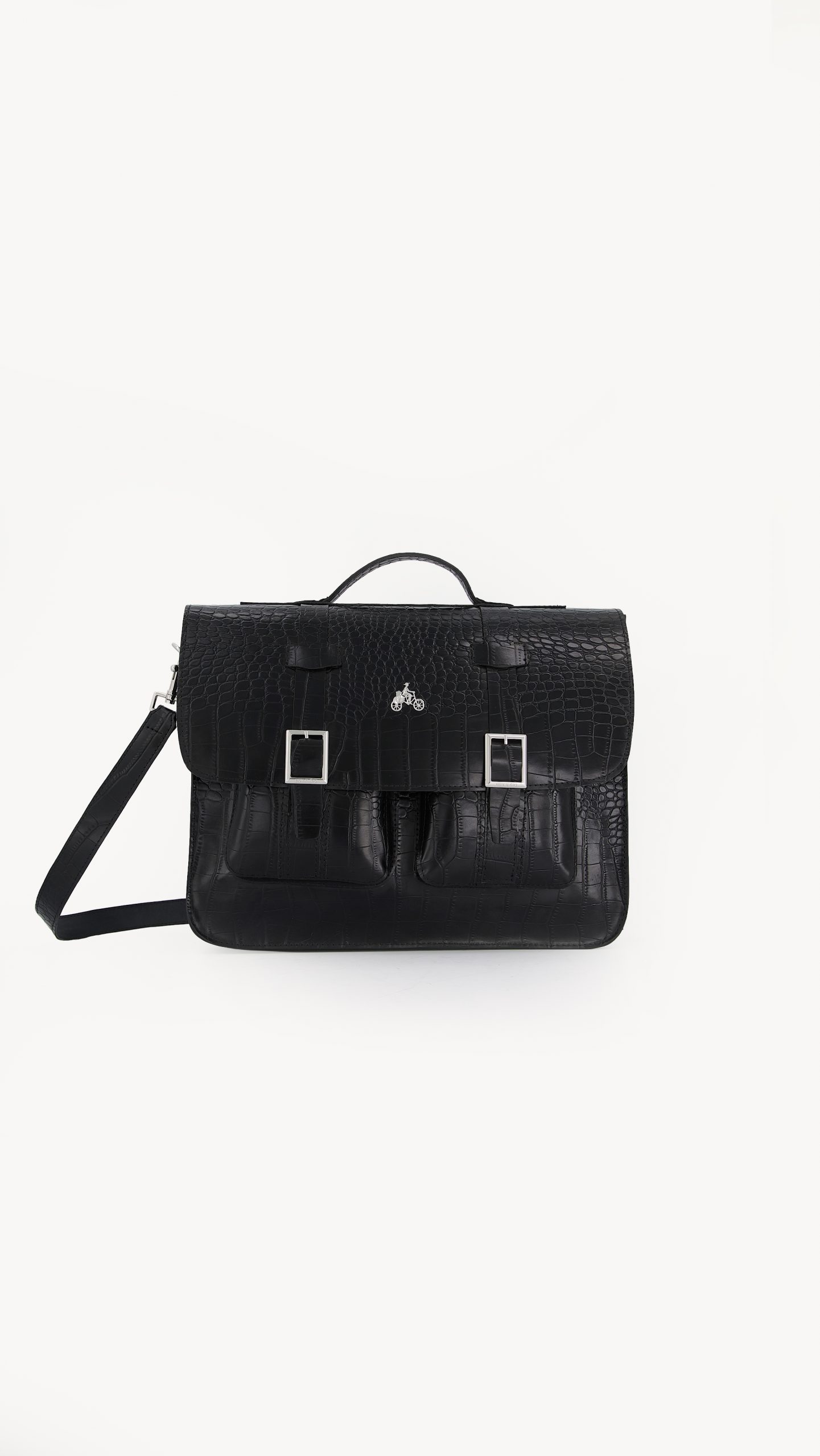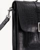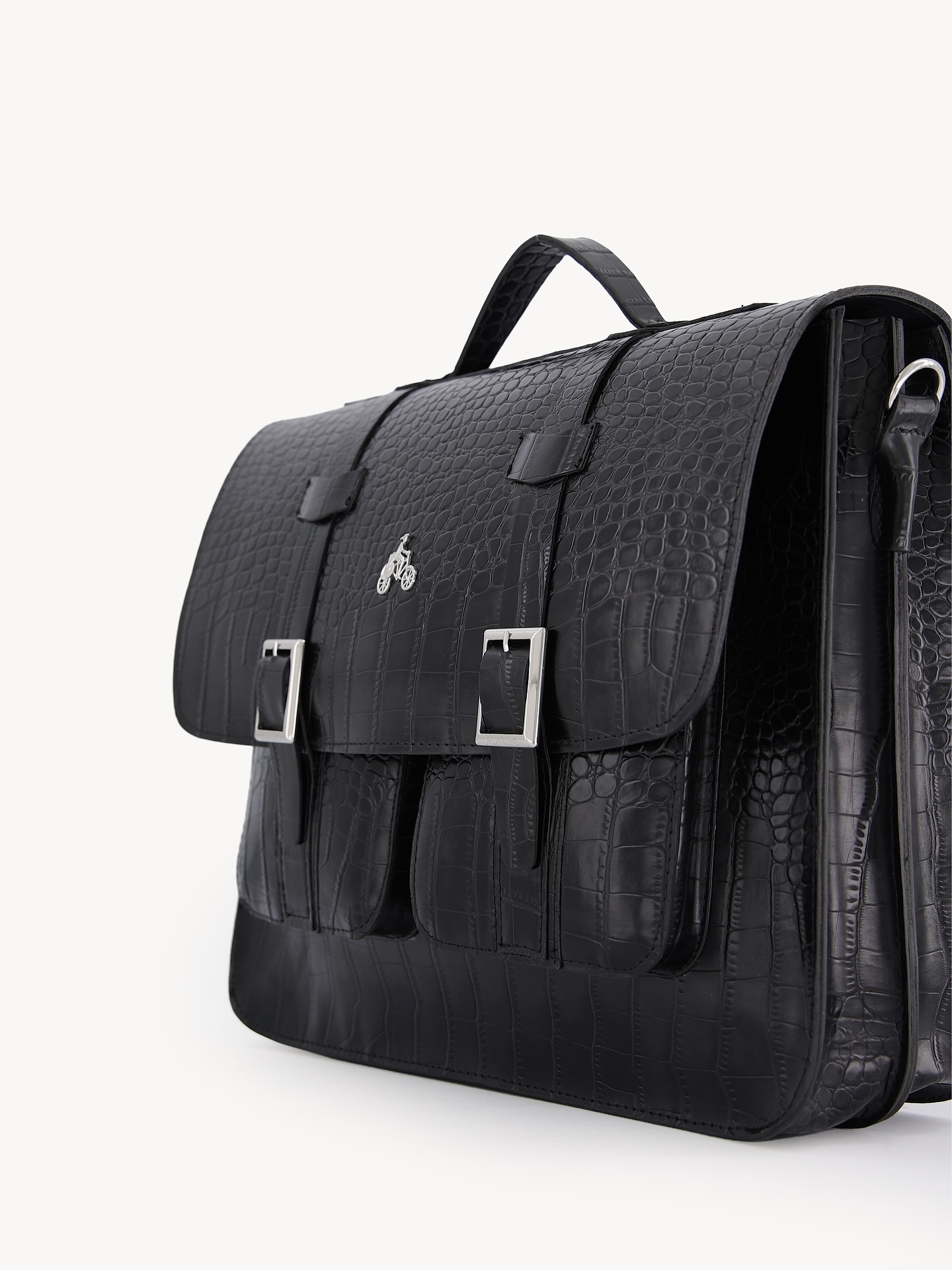 The DKBF 02 is A black crocodile-embossed leather briefcase with a structured shape. It has two buckle straps, three front pockets for quick storage, and a firm top handle for daily use. The main compartment is spacious enough for a laptop, documents, and work essentials. Finished with the Deji & Kola logo.