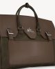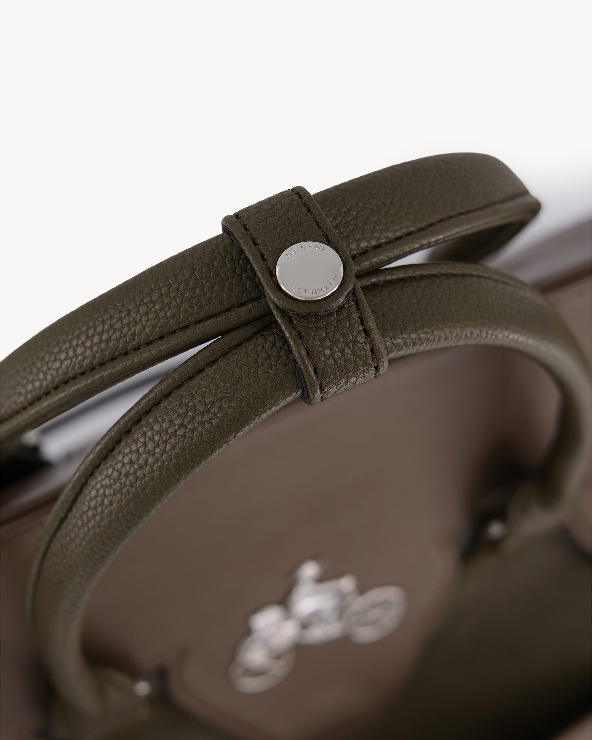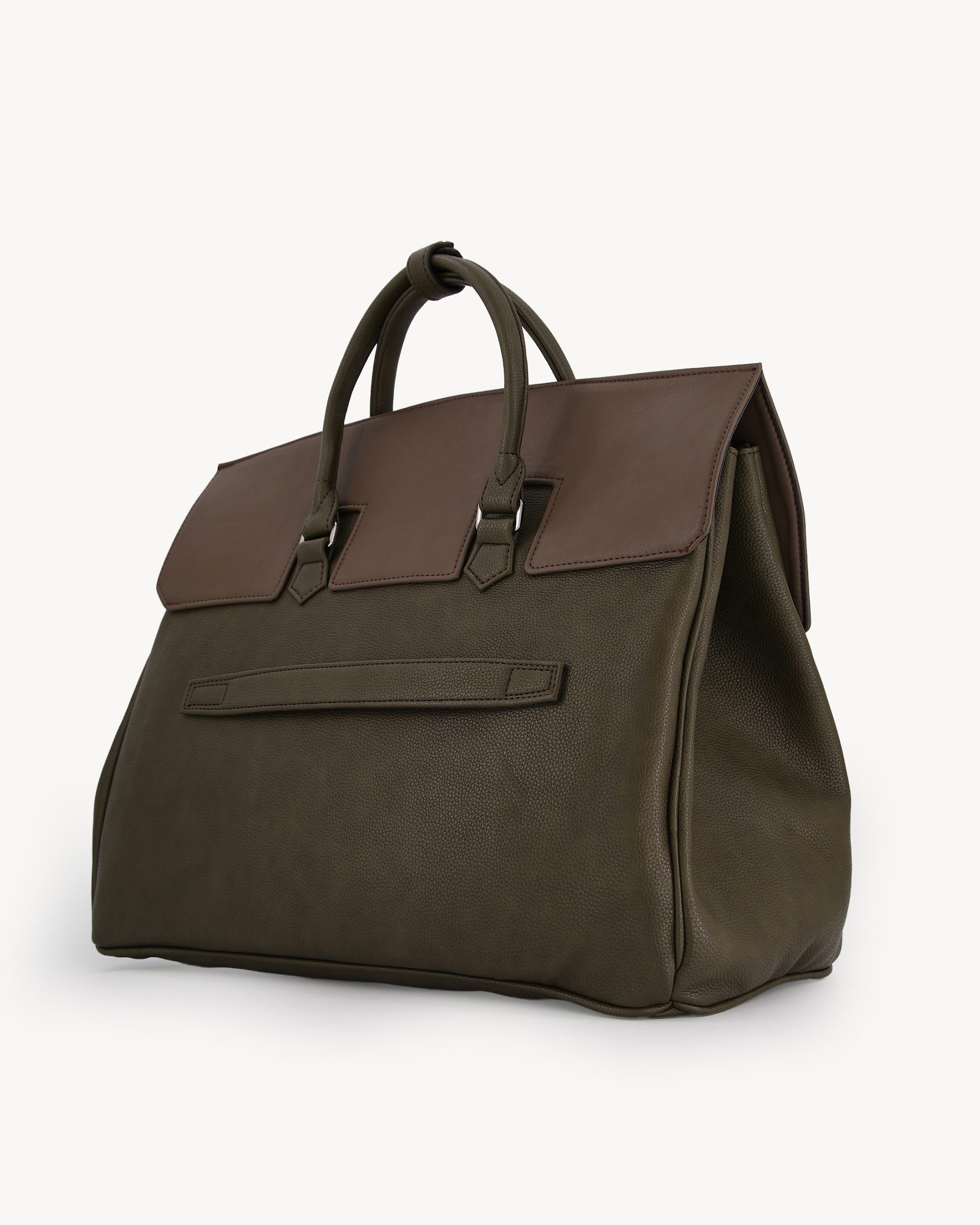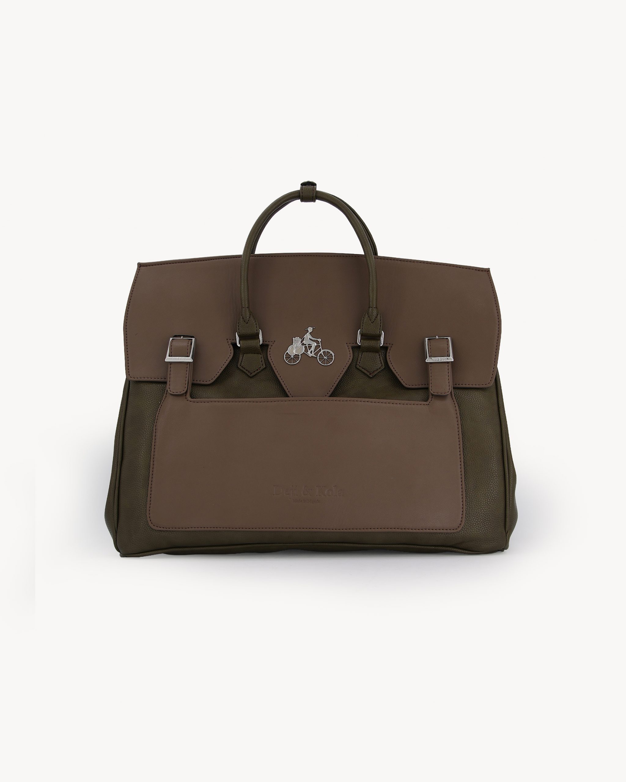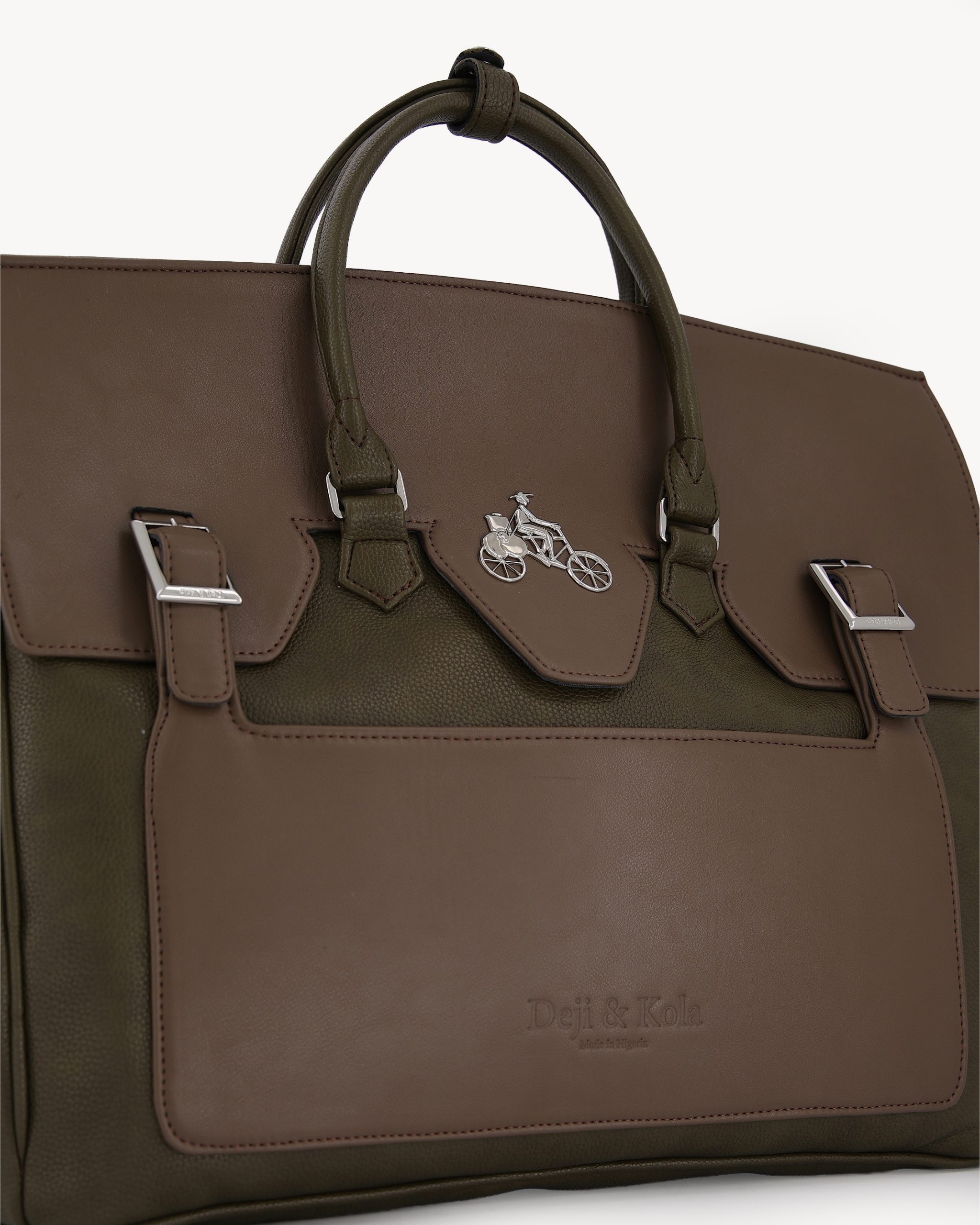 The DKDB 03 is made from high-quality leather with a two-tone finish in olive green and brown. It has a structured shape, a front flap with the Deji & Kola logo, and two buckle straps for security. The interior is spacious enough for daily use or short trips, and the reinforced base helps the bag keep its shape.