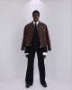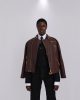The DKJKT 05 is a biker jacket made from a shade of brown leather with a midweight feel. It features two straight zip closures at the front, eight snap buttons around the sleeves and body, and a minimal collar. The jacket is lined and includes an interior pocket for convenience.