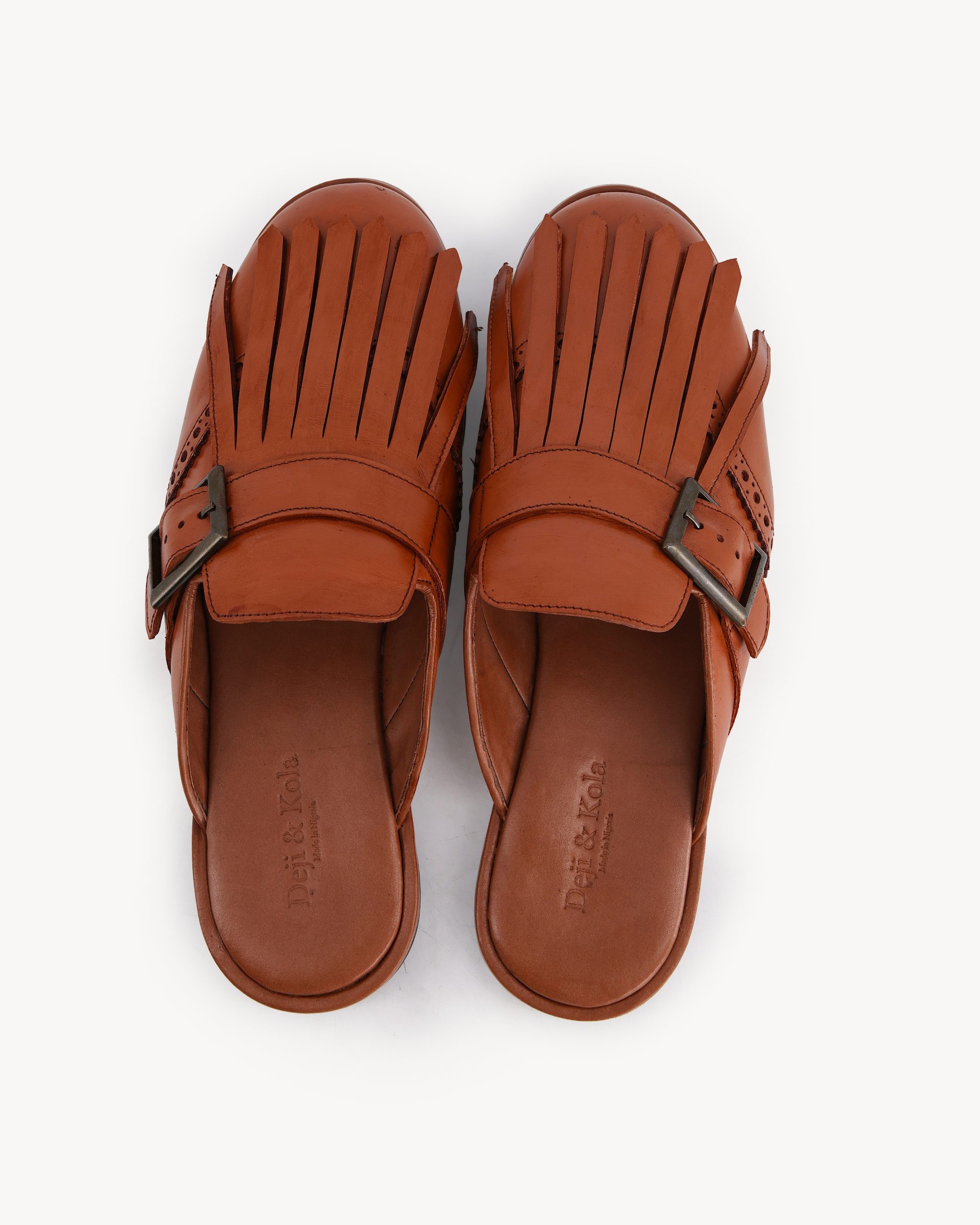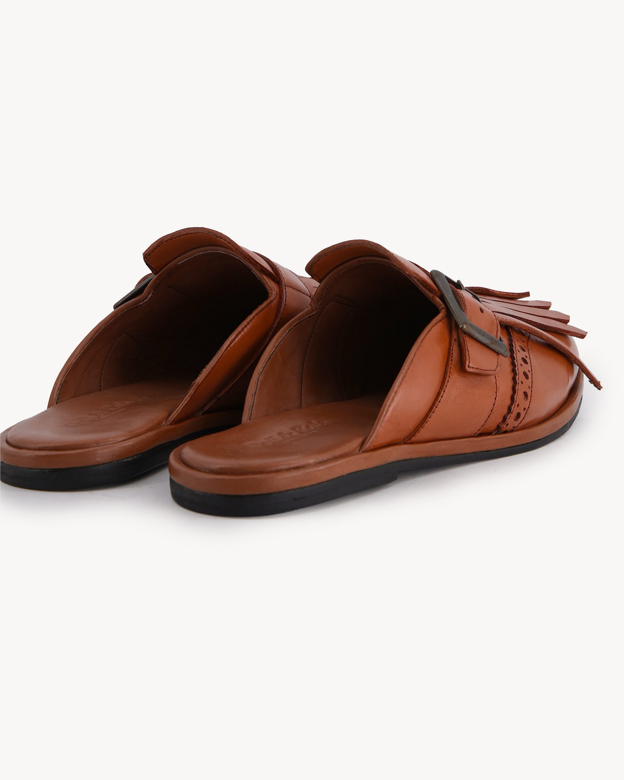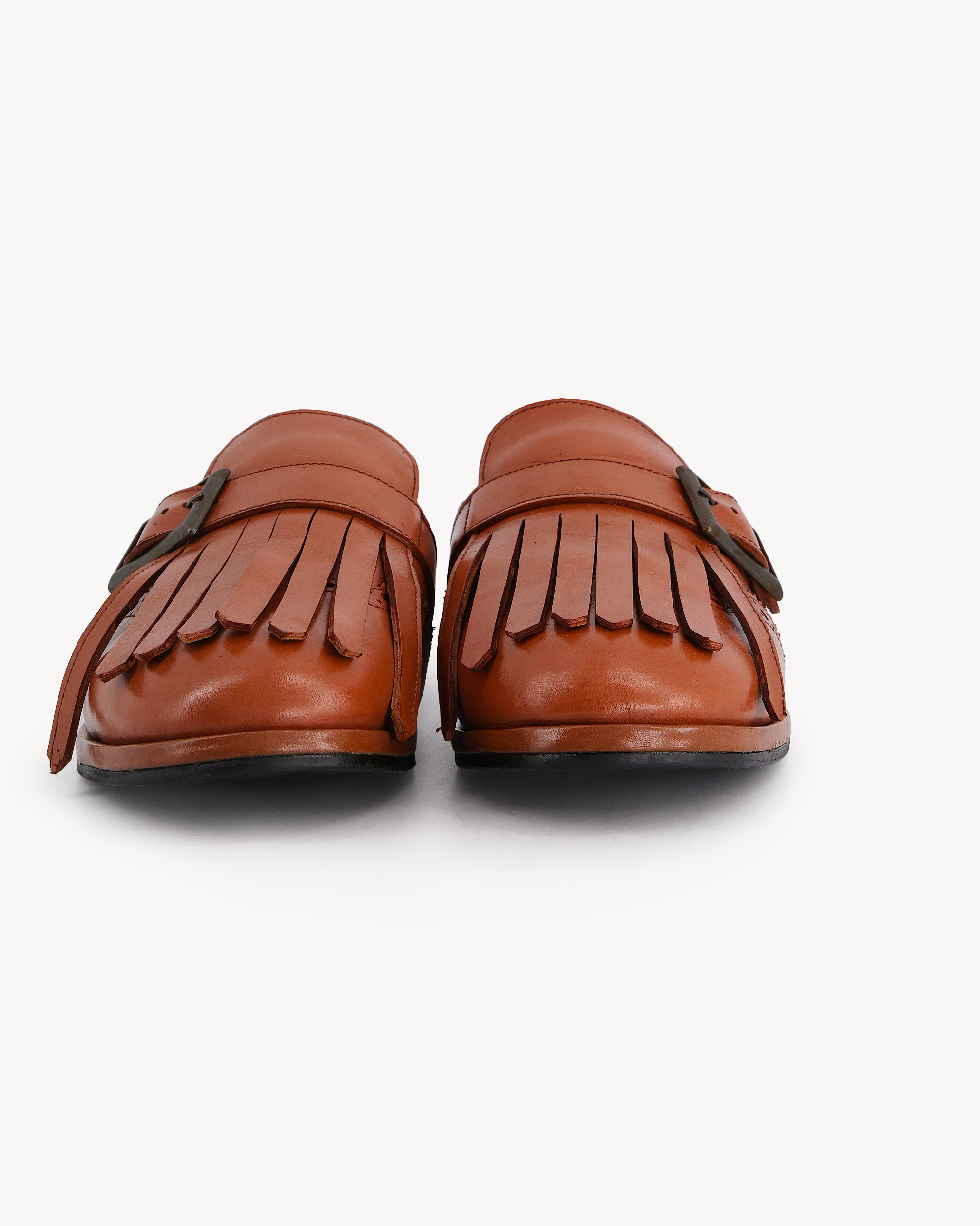 DKLF 31 – Mule – These tan leather slip-on Loafer are effortless and versatile. Made from smooth, soft leather, they feel comfortable from the moment you put them on. The subtle fringe across the front adds a touch of personality, while the side buckle ensures a secure fit with a bit of edge. With a cushioned insole and a sturdy sole, they’re perfect for everyday wear.