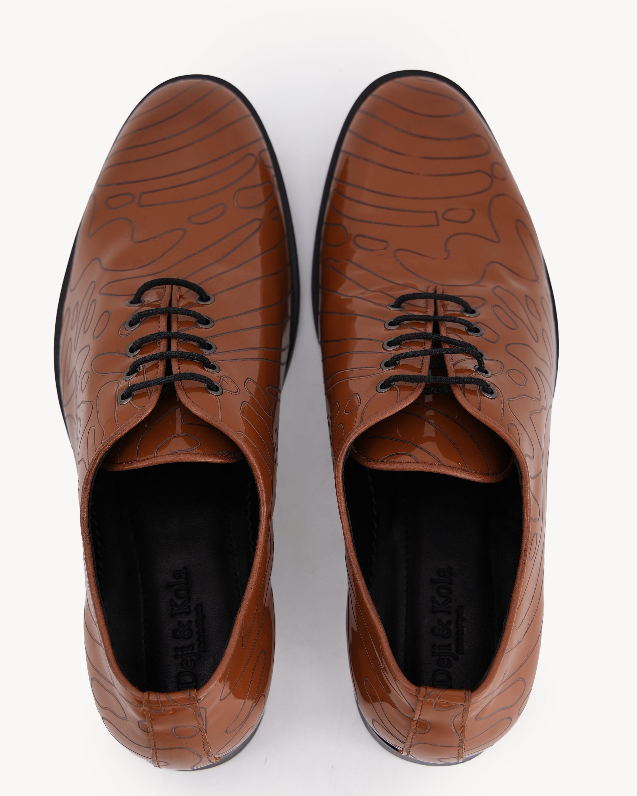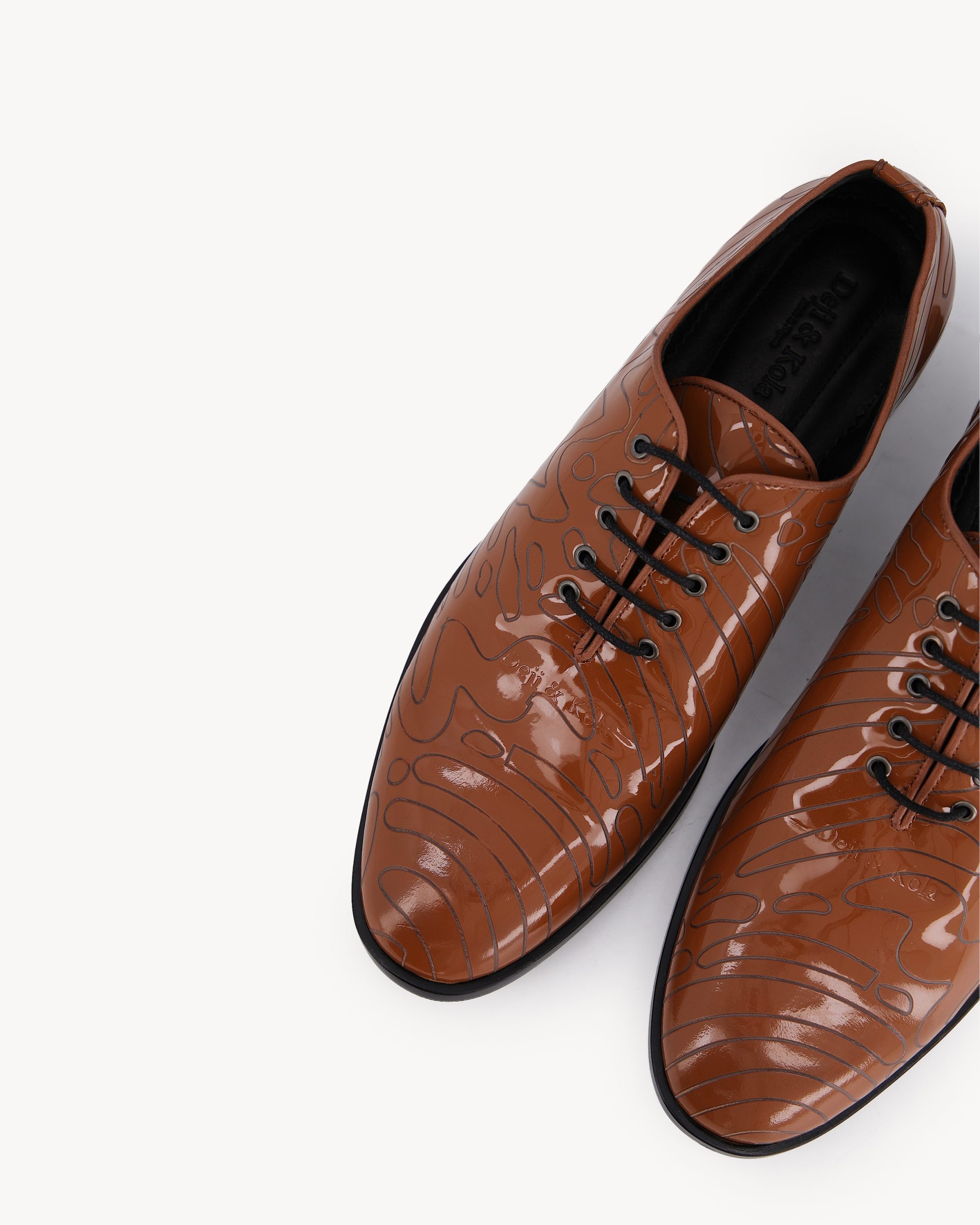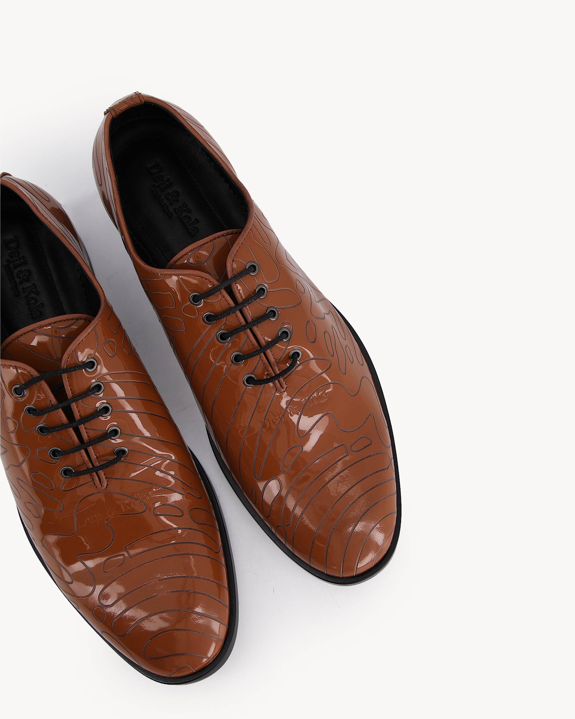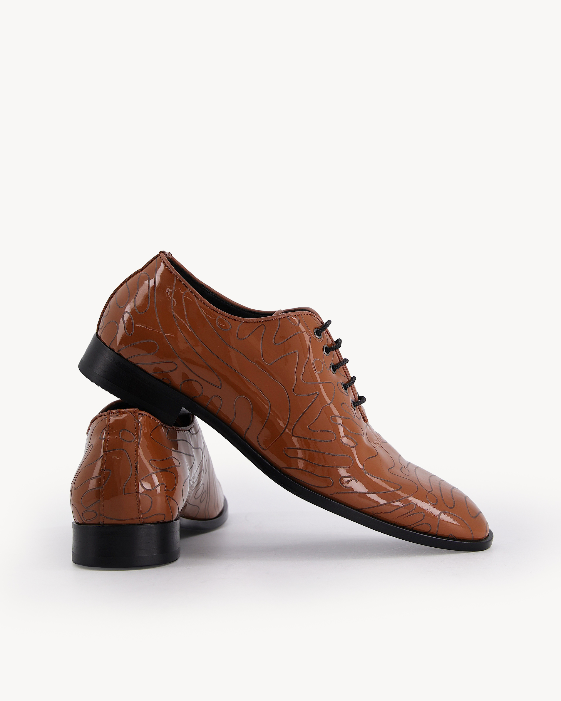 The DKOX 08 vs 1 – Crafted from light brown patent leather, this Oxford shoe blends classic style with a modern edge. The glossy finish is elevated with a subtle abstract line pattern across the body, giving it a bold yet refined look. Designed with a rounded toe and easy lace-up closure, it offers a clean fit and all-day comfort.