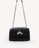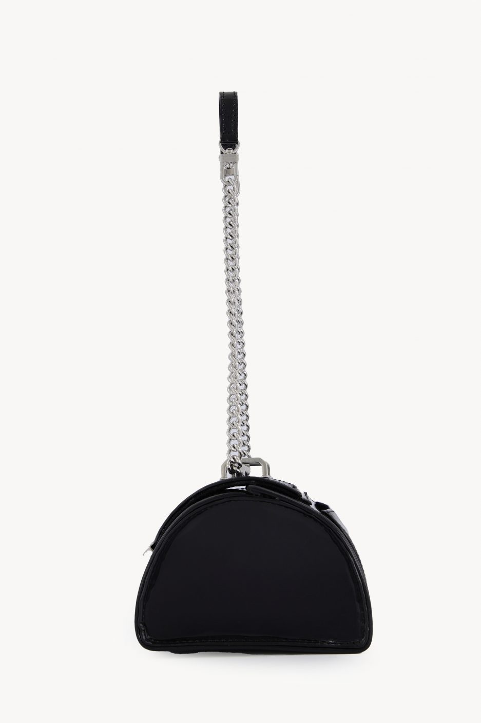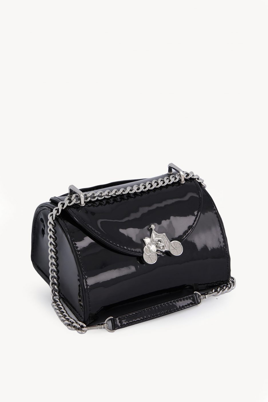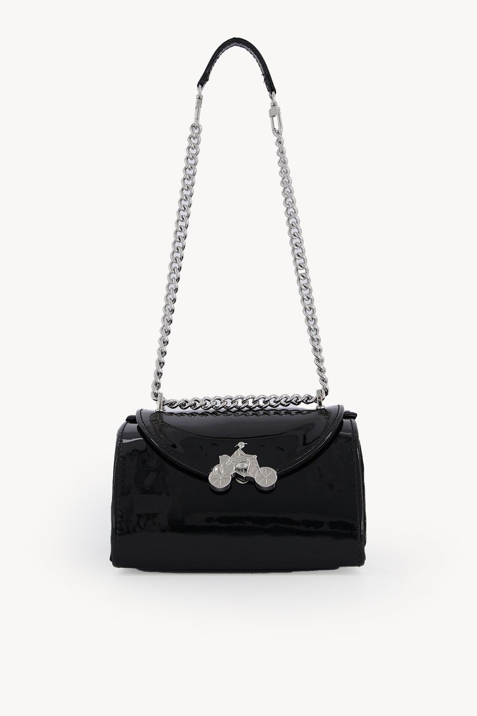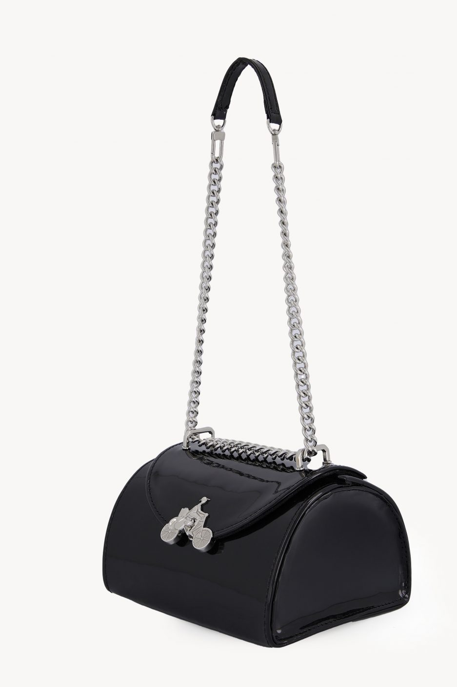 The DKSB–01 is a structured black shoulder bag, crafted from patent leather. Its flap-top silhouette is accented with a silver-tone chain strap and finished with the signature Deji & Kola clasp. With its sleek form and sturdy build, this piece transitions effortlessly from daytime polish to evening edge.