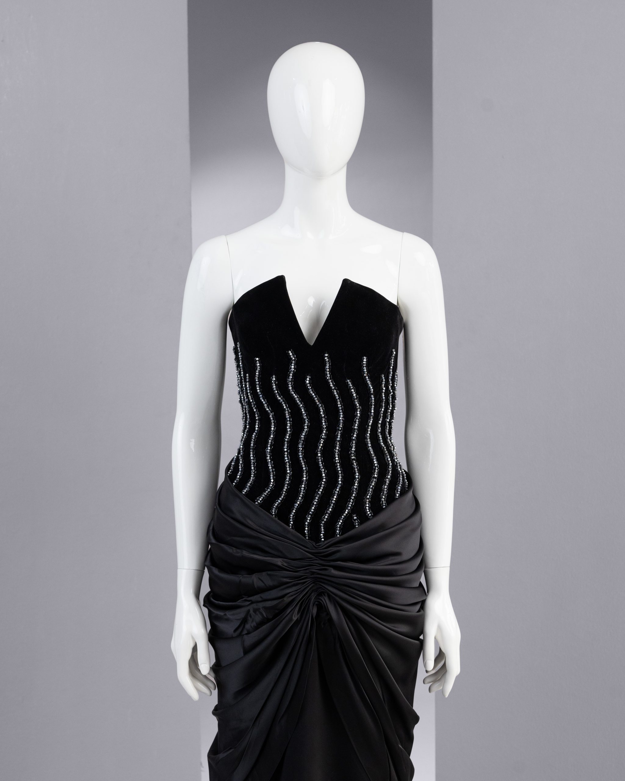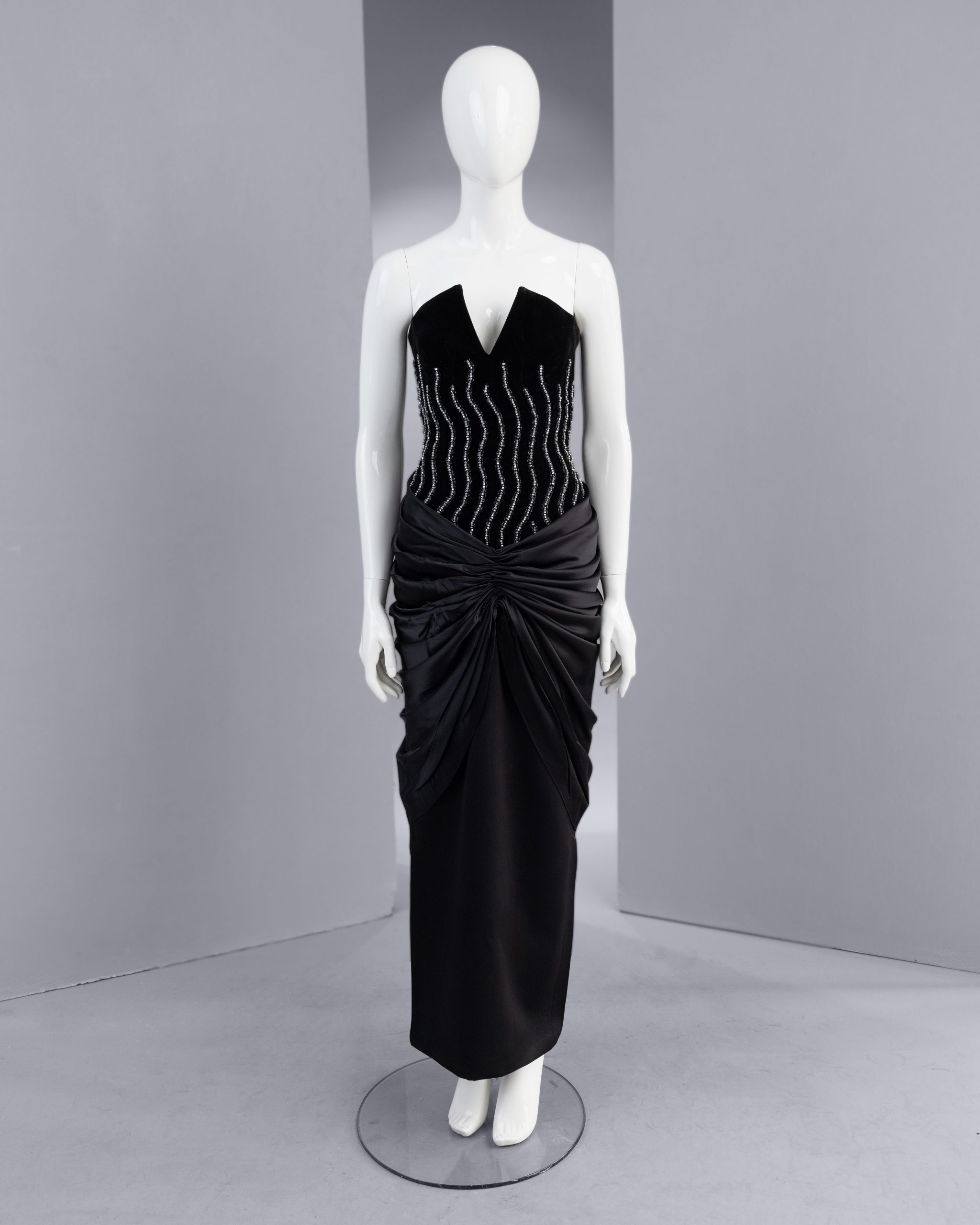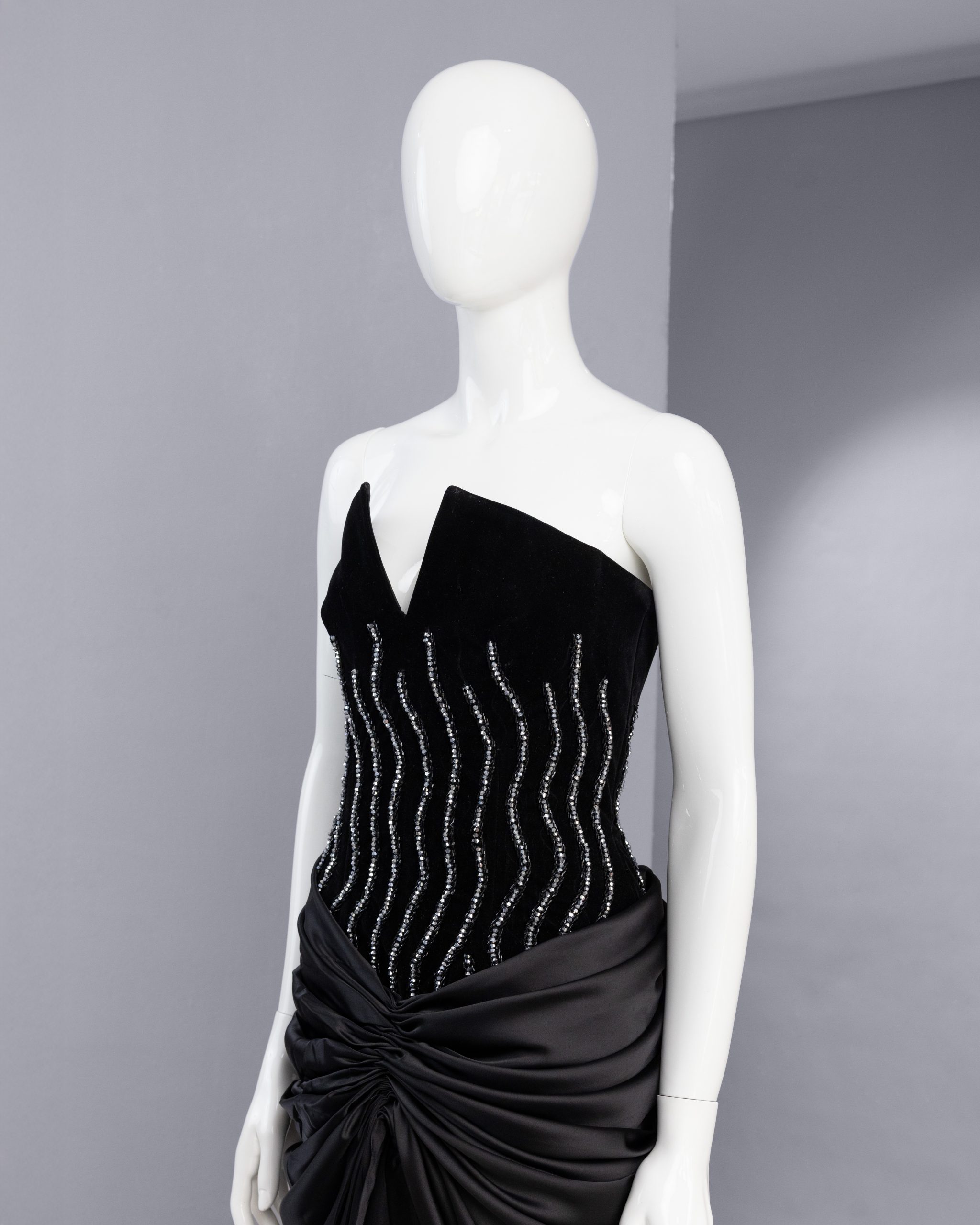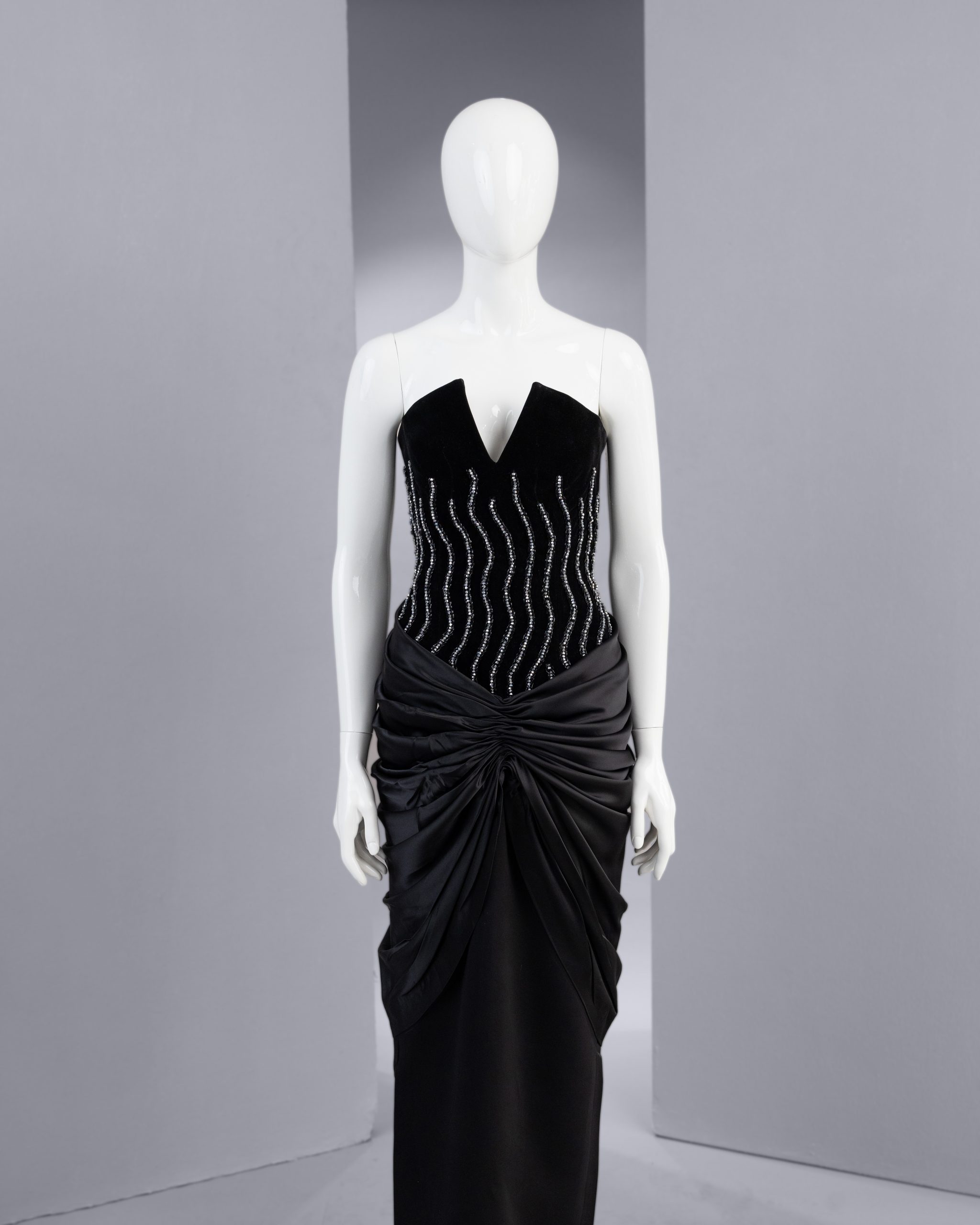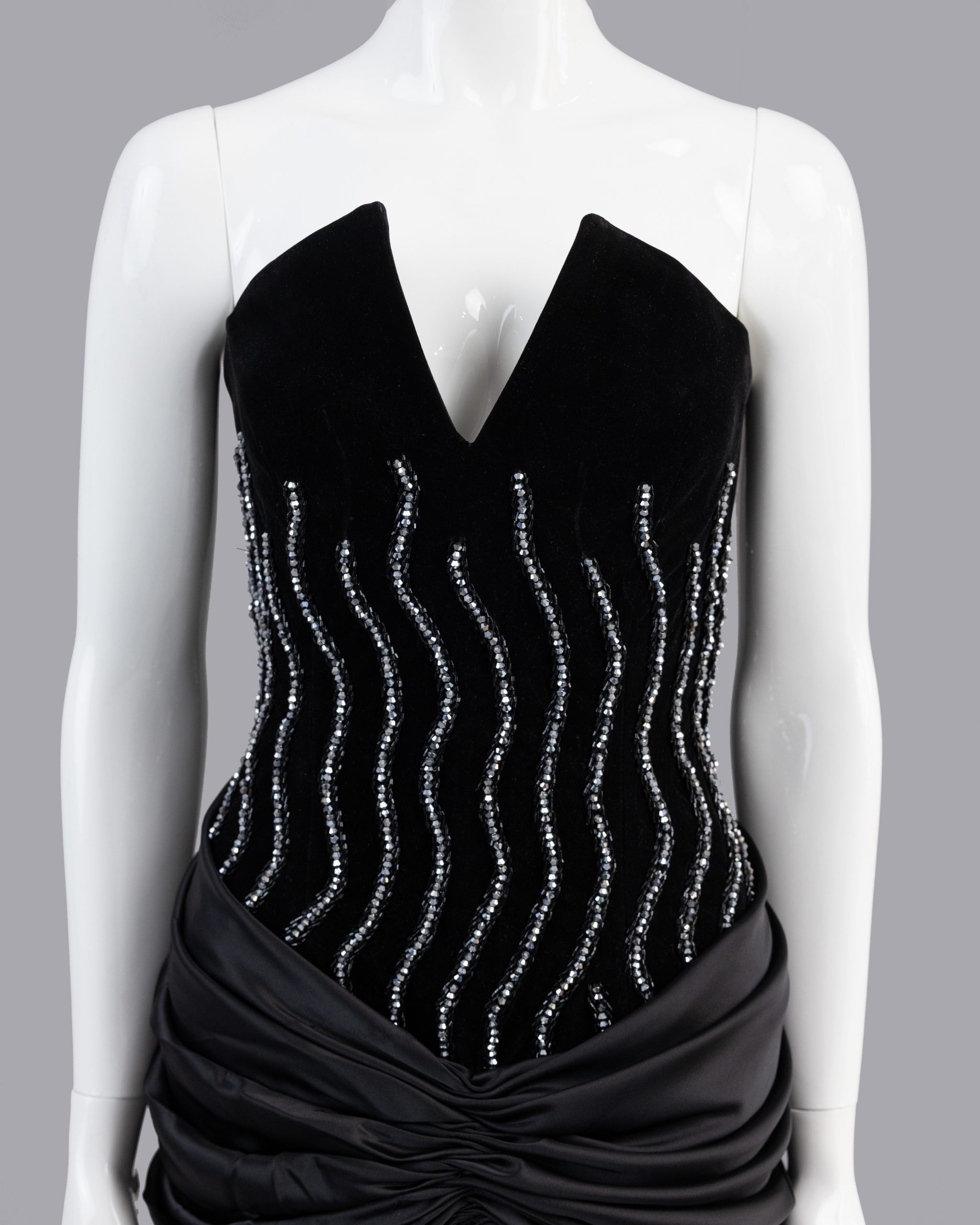 A black deep V neckline, adorned dress with subtle vertical bead embellishments.