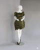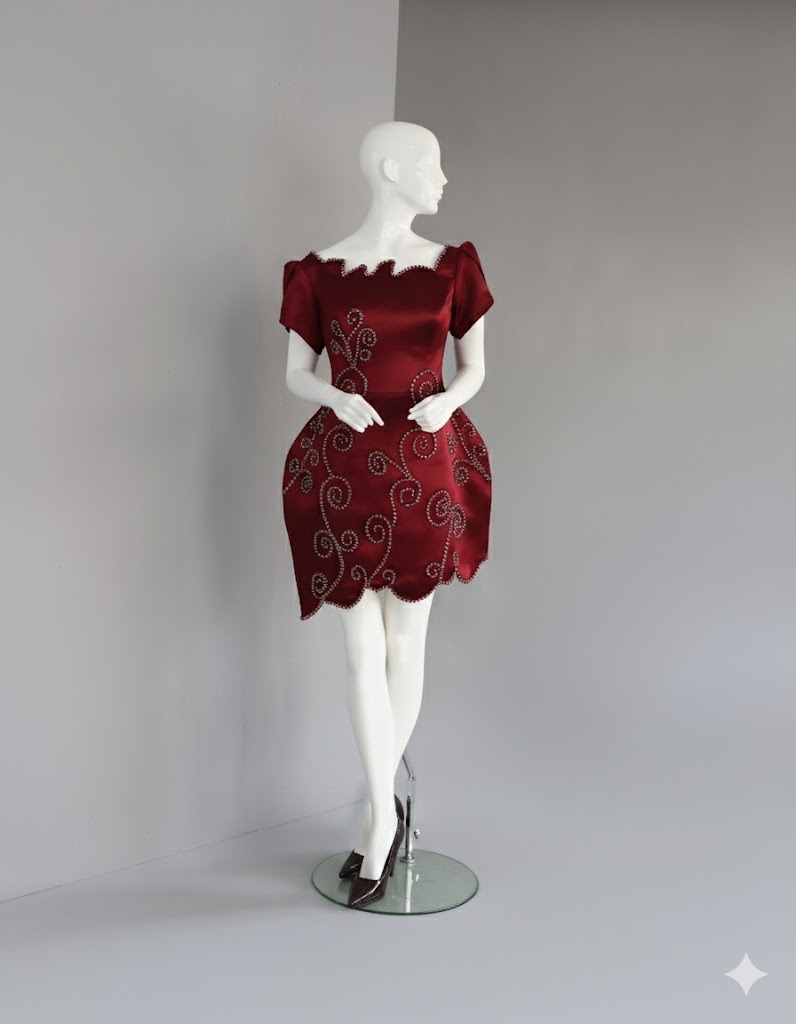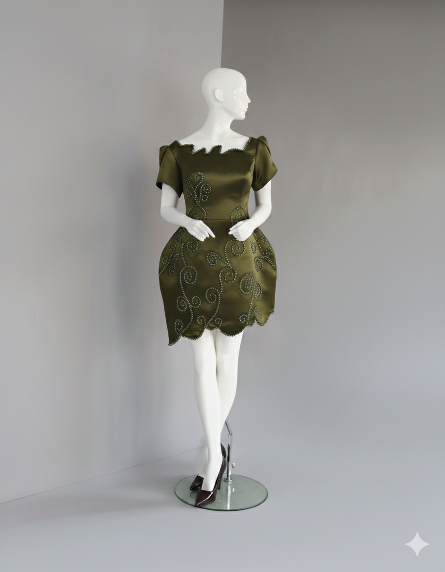 A structured mini dress with wide, scallop off-the-shoulder neck line and hem adorned with beads.