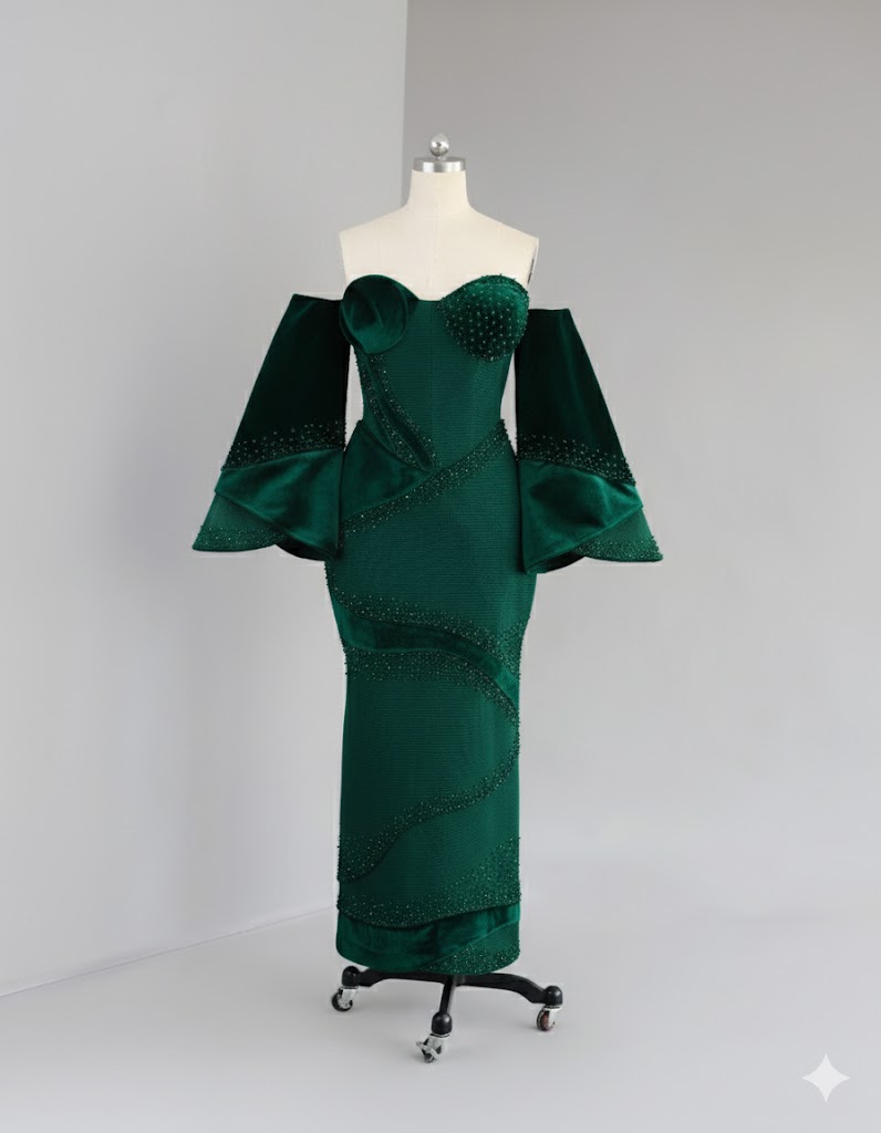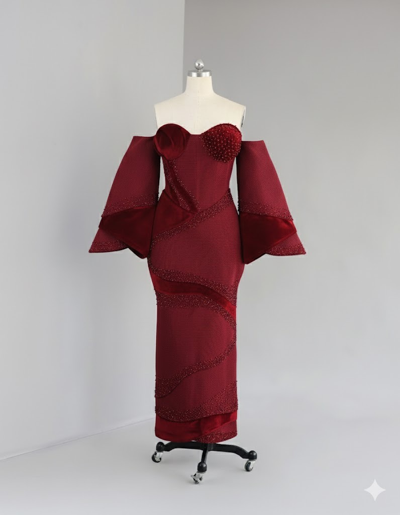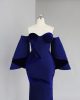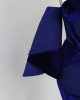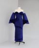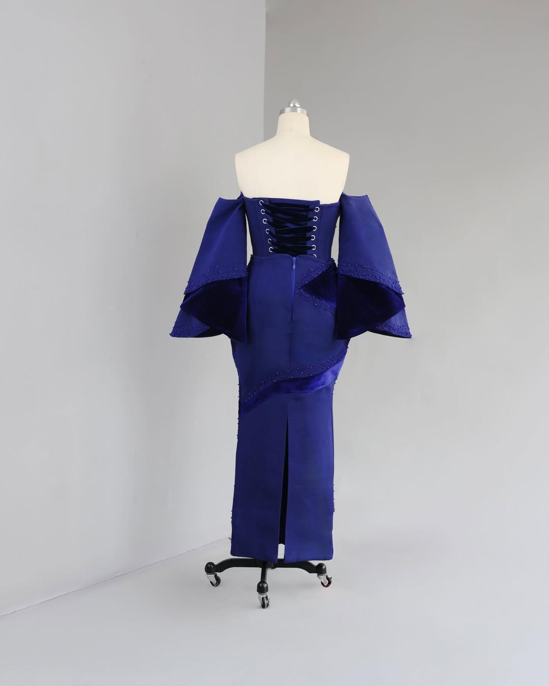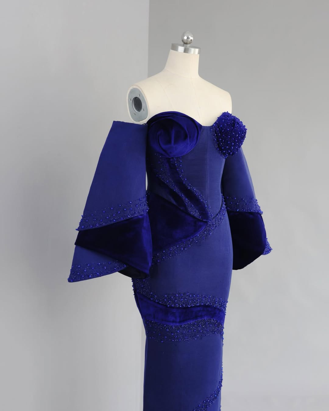 A Royal Blue off-shoulder Aso Oke Dress, with a Structured neckline, dramatic sculpted sleeves,