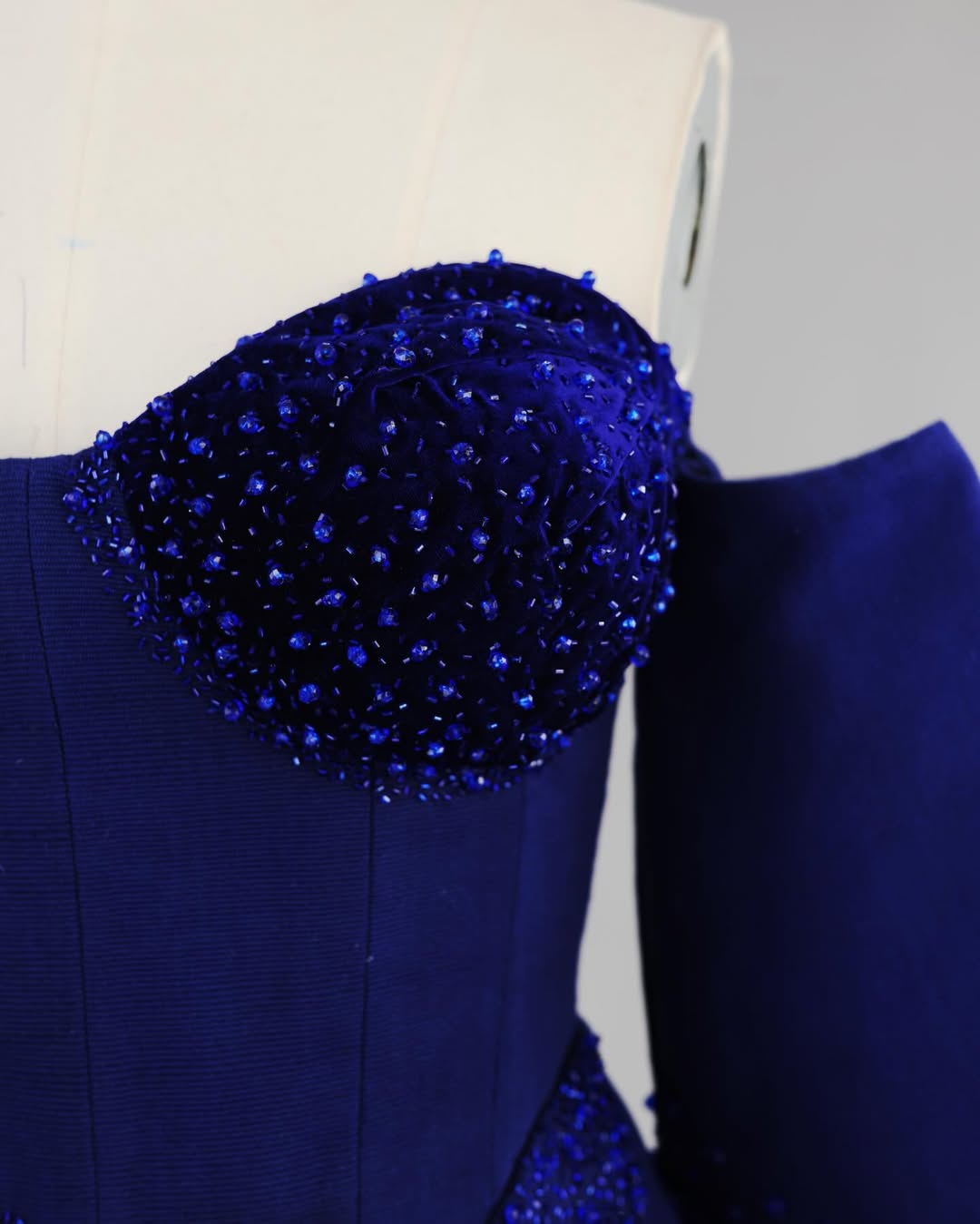 Details : Off shouler with sculpted sleeves embellished with royal blue beads