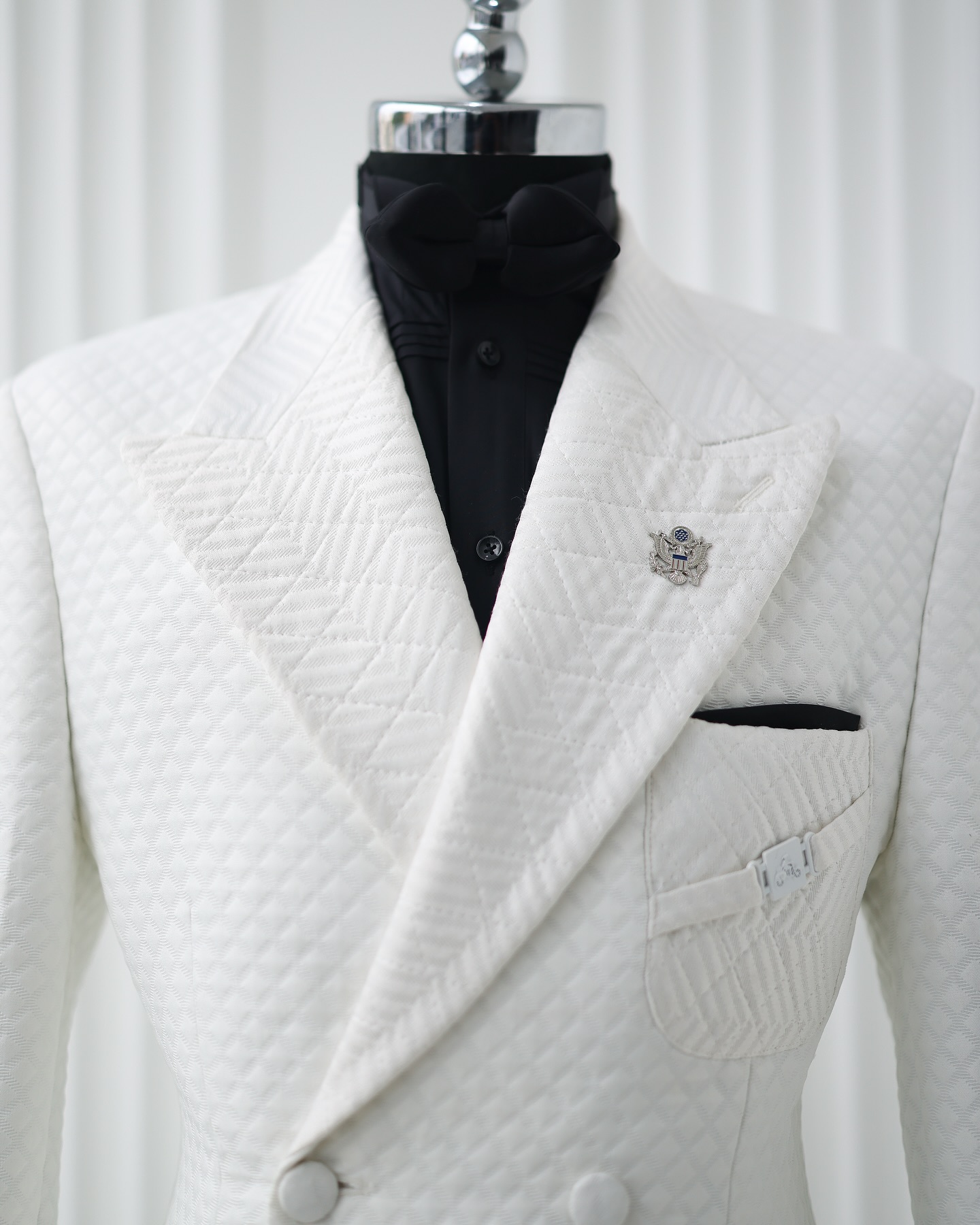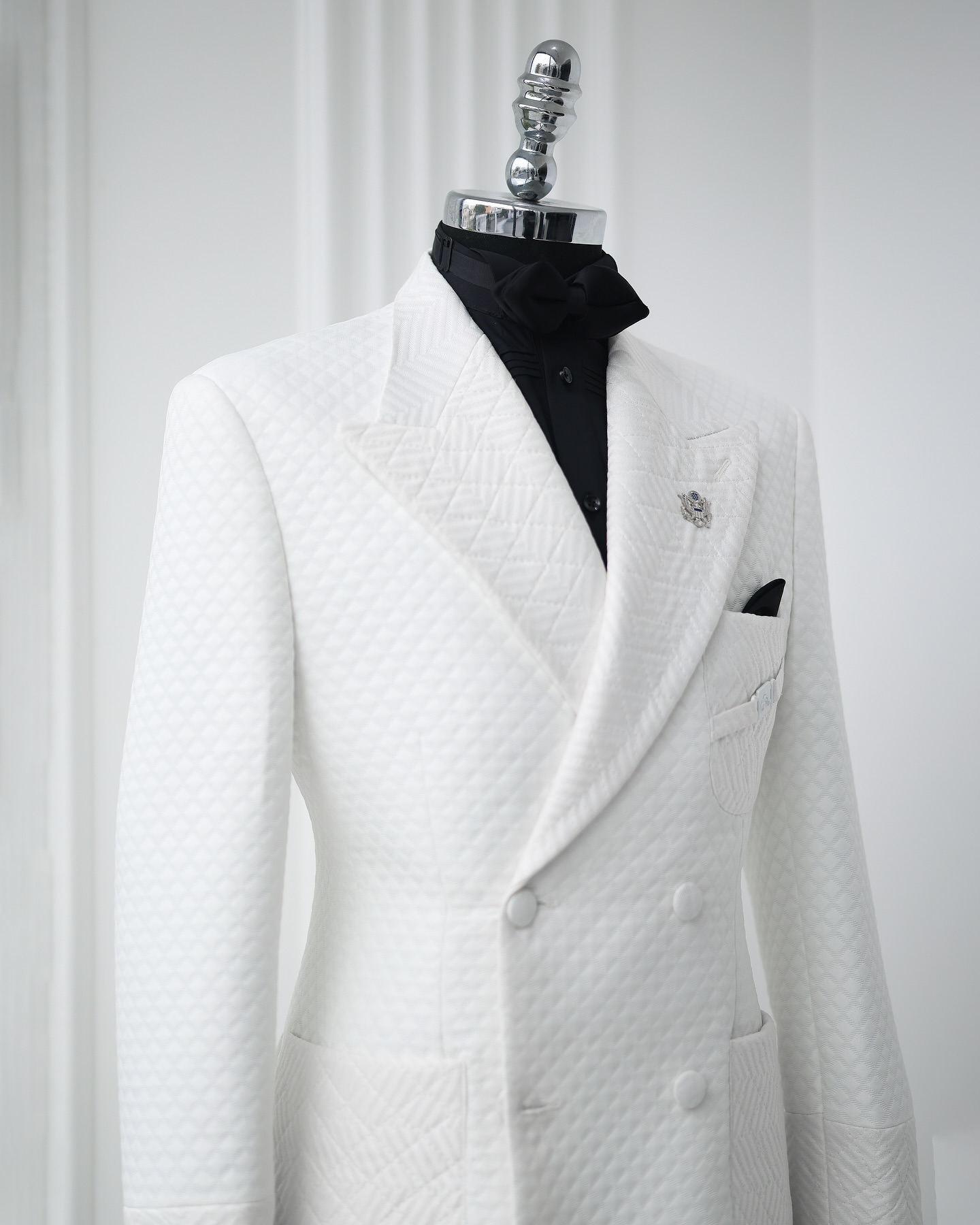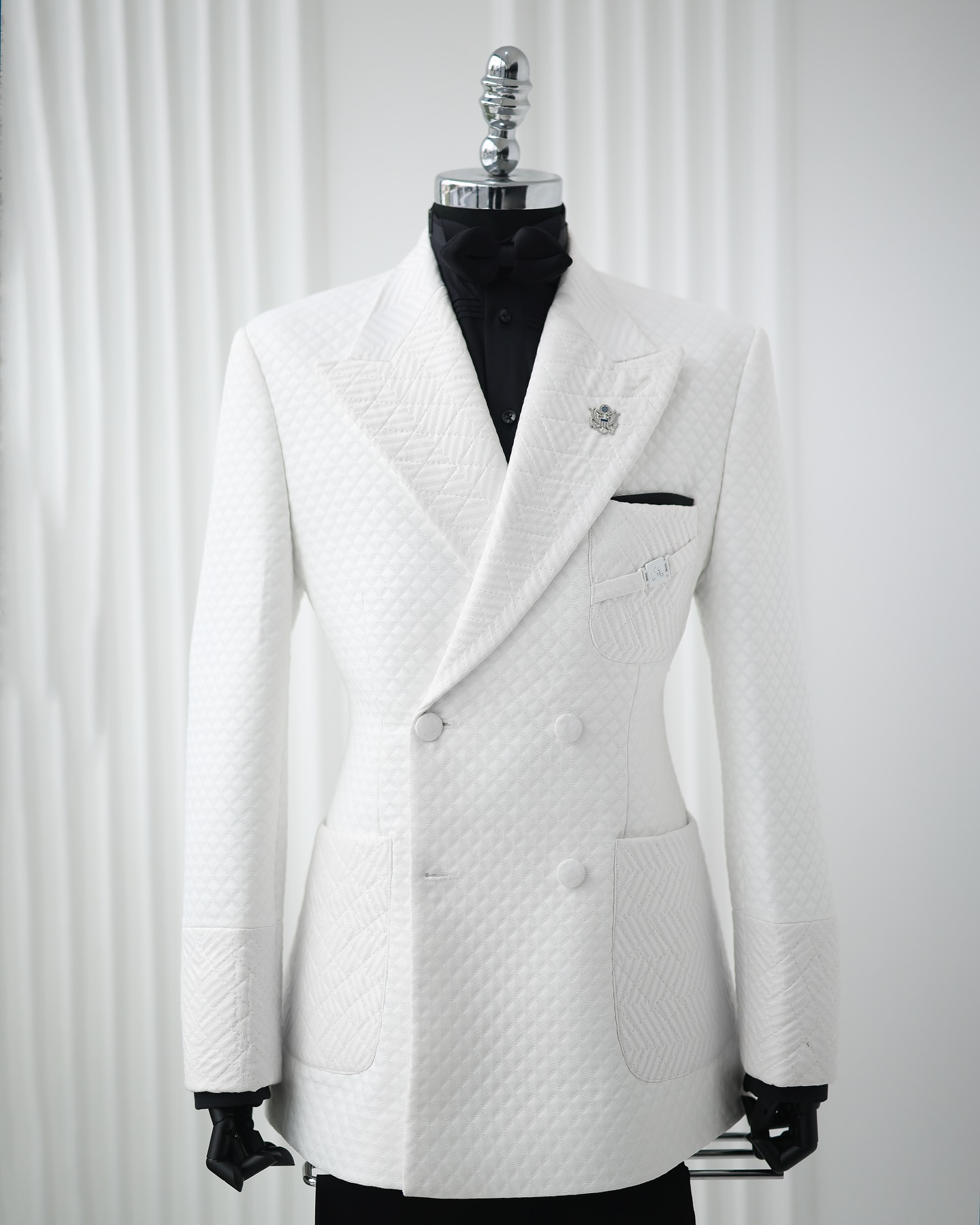 The HEA 4 vs 5 Suit is crafted from a Ivory square patterned jacquard body, contrasted with diamond-quilted velvet accents in Ivory White. This double-breasted jacket features wide velvet lapels, two large patch pockets, and a single chest welt pocket. Perfect for ceremonial events.