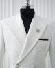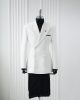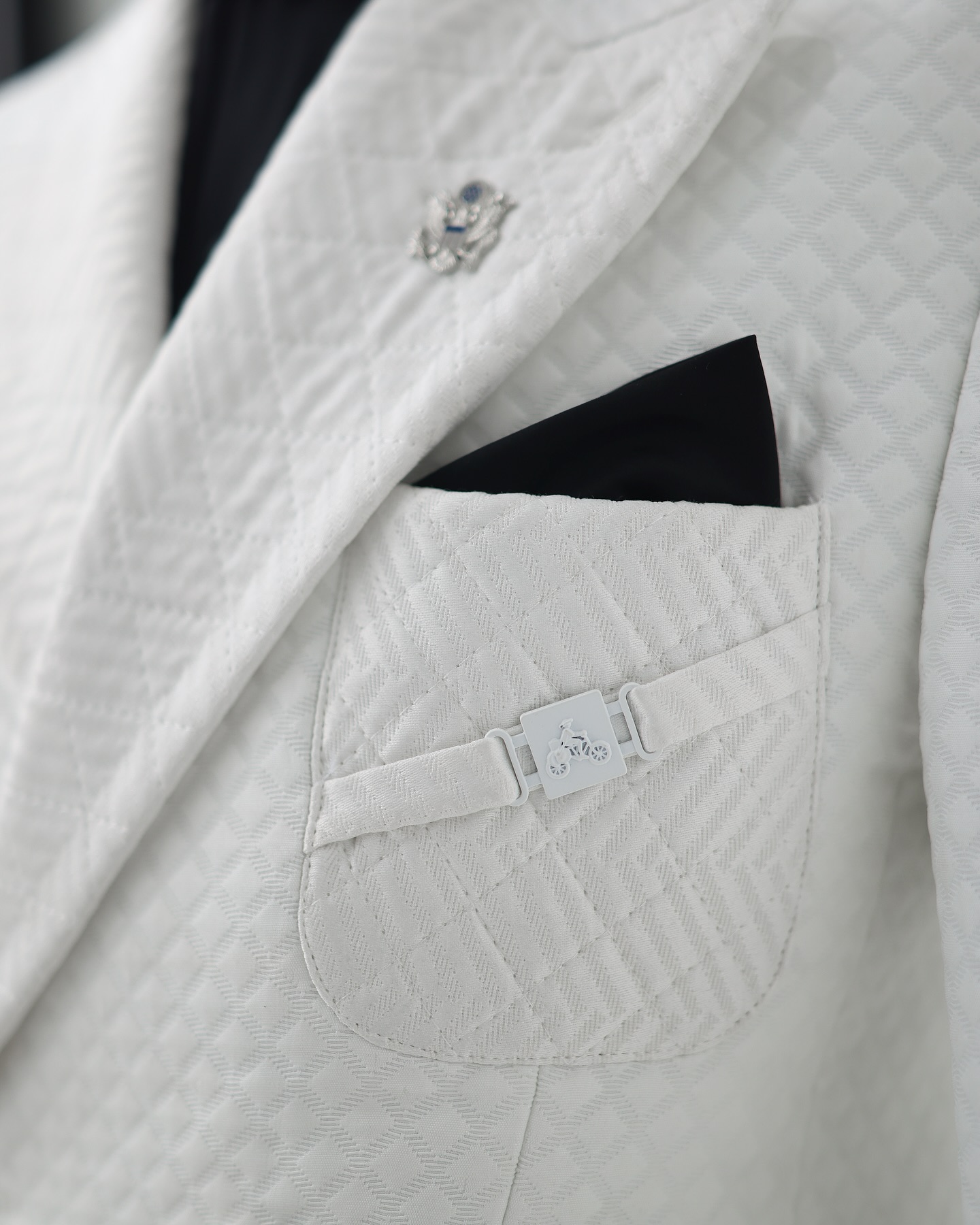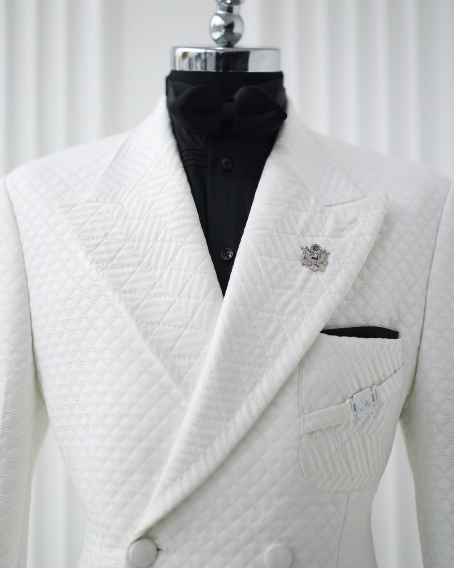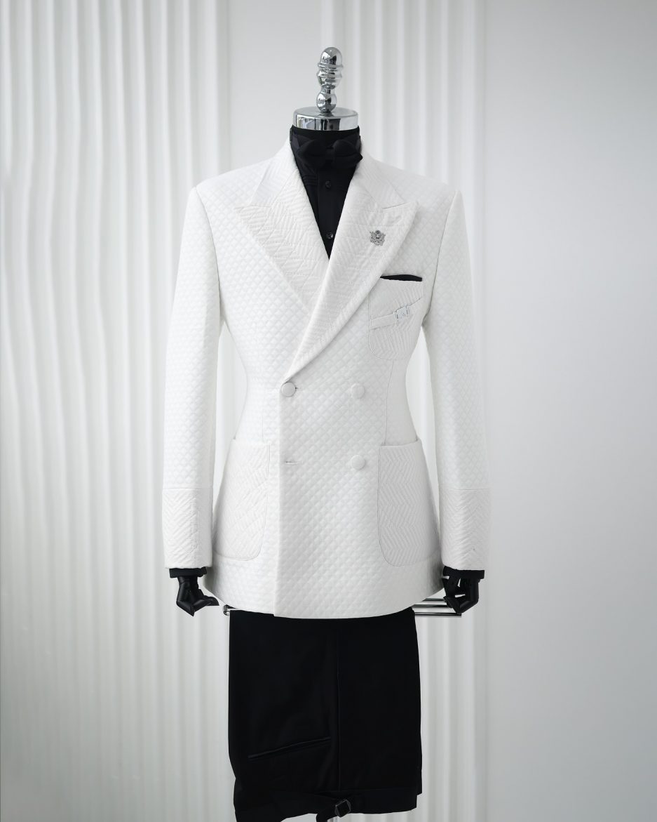 The HEA 4 vs 5 Suit is crafted from a Ivory square patterned jacquard body, contrasted with diamond-quilted velvet accents in Ivory White. This double-breasted jacket features wide velvet lapels, two large patch pockets, and a single chest welt pocket. Perfect for ceremonial events.