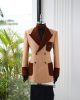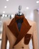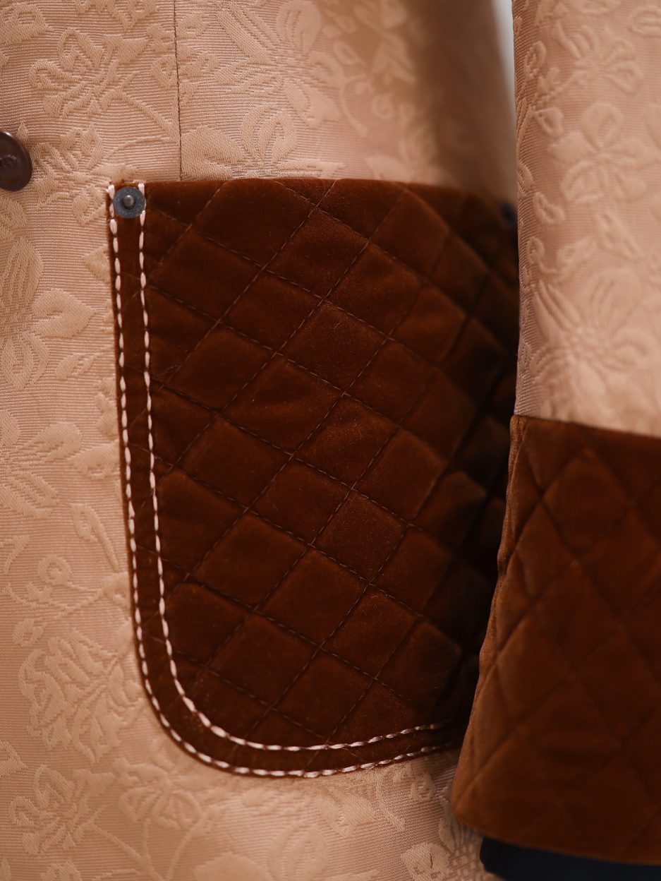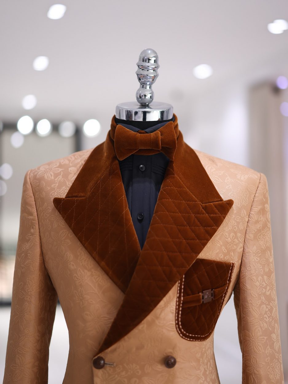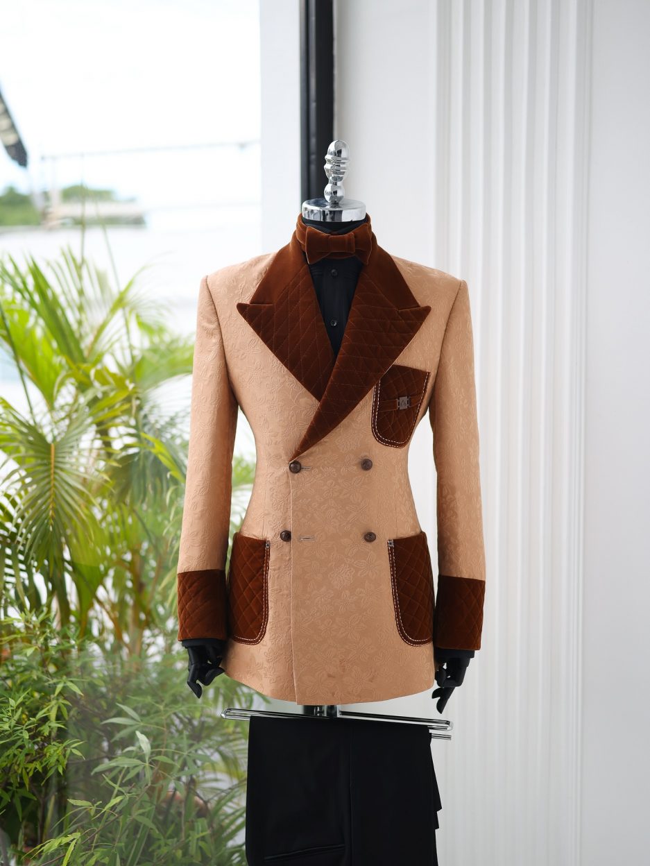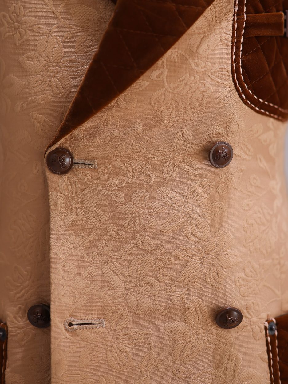 The HEA 4 vs 6 Suit is crafted from a light brown jacquard body, contrasted with diamond-quilted velvet accents in chocolate brown. This double-breasted jacket features wide velvet lapels, two large patch pockets, and a single chest welt pocket. Perfect for ceremonial events.