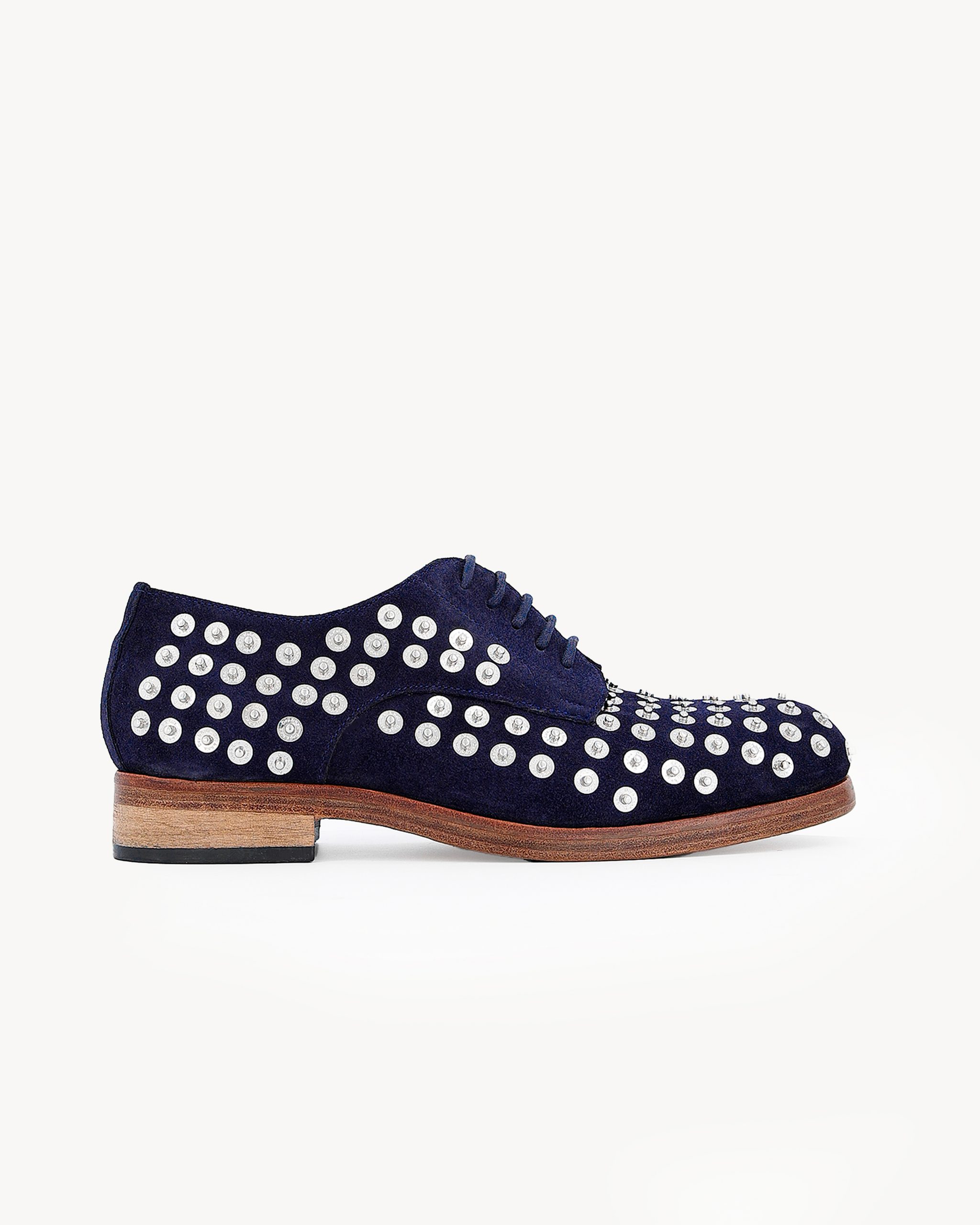 The DKDB 04 – Blue Velvet Derby is a lace-up shoe detailed with silver signature rivets. With open lacing and a clean rounded toe, it delivers the perfect mix of comfort, style, and durability, ideal for parties and special occasions.