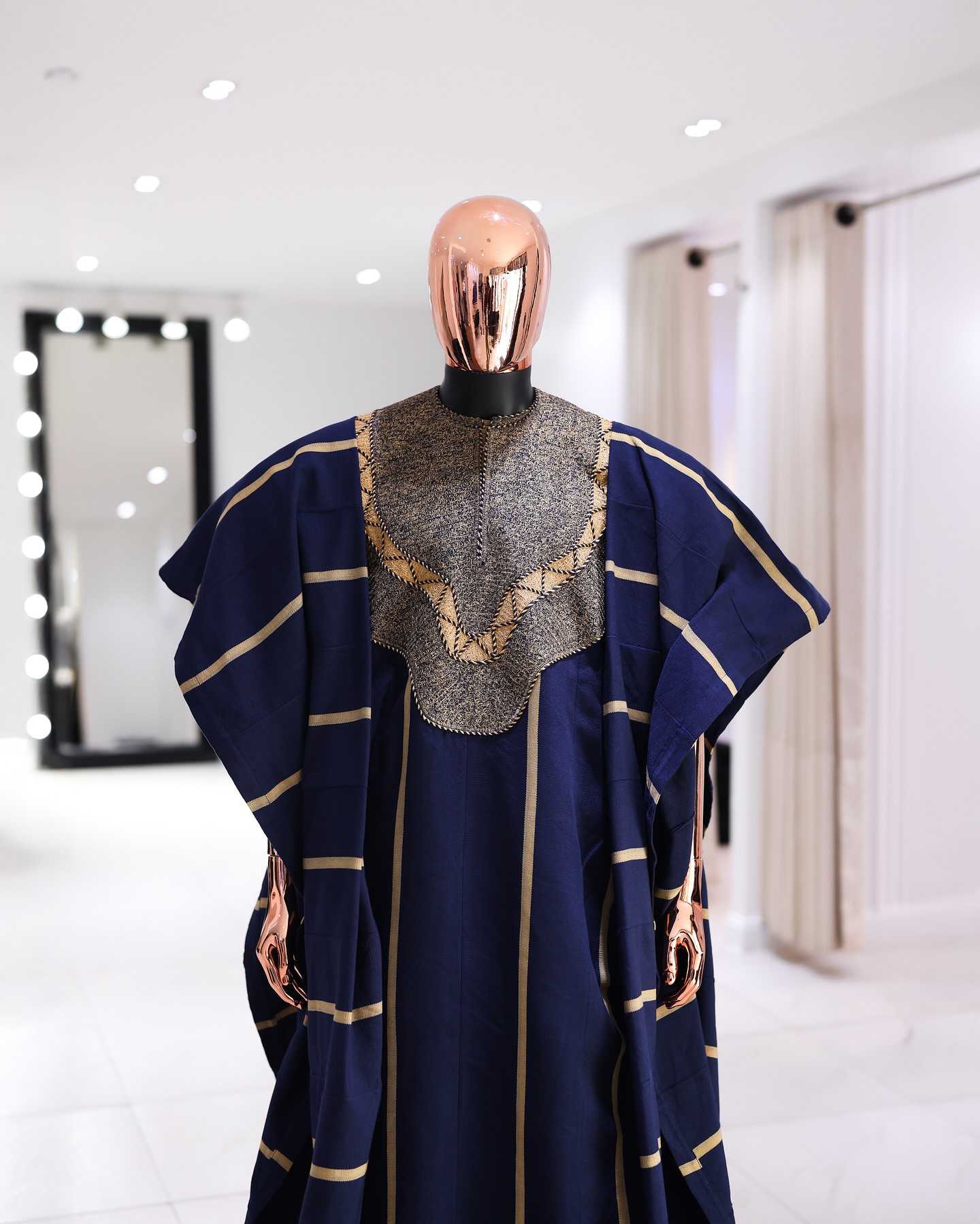 The “ojude” agbada. is crafted from deep navy fabric, detailed with elegant gold stripe embroidery that catches the light beautifully. It comes with a matching kaftan and wide-cut trousers for a relaxed yet refined fit. Perfect for special occasions, it’s a look that speaks of culture, confidence, and effortless style.