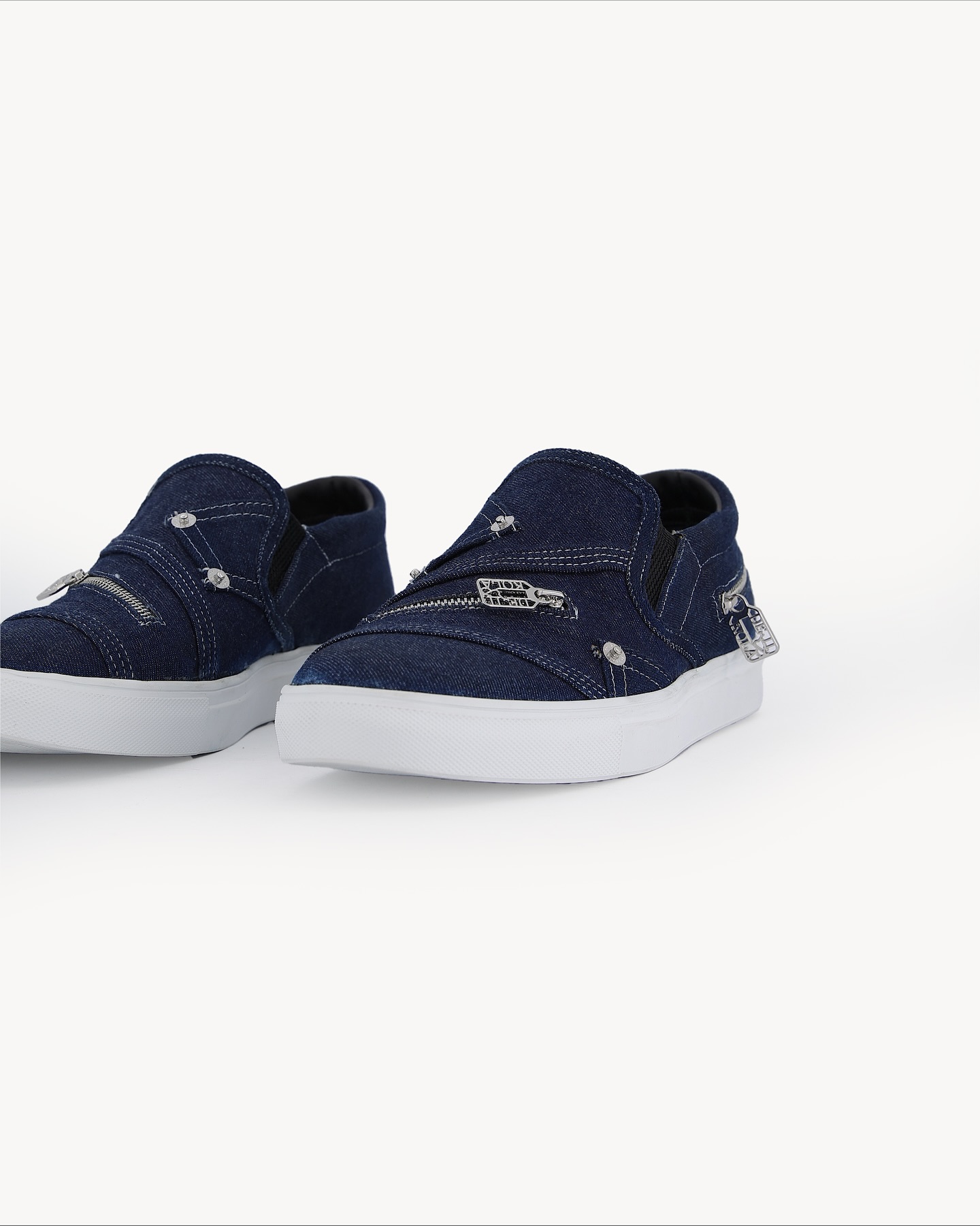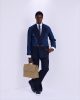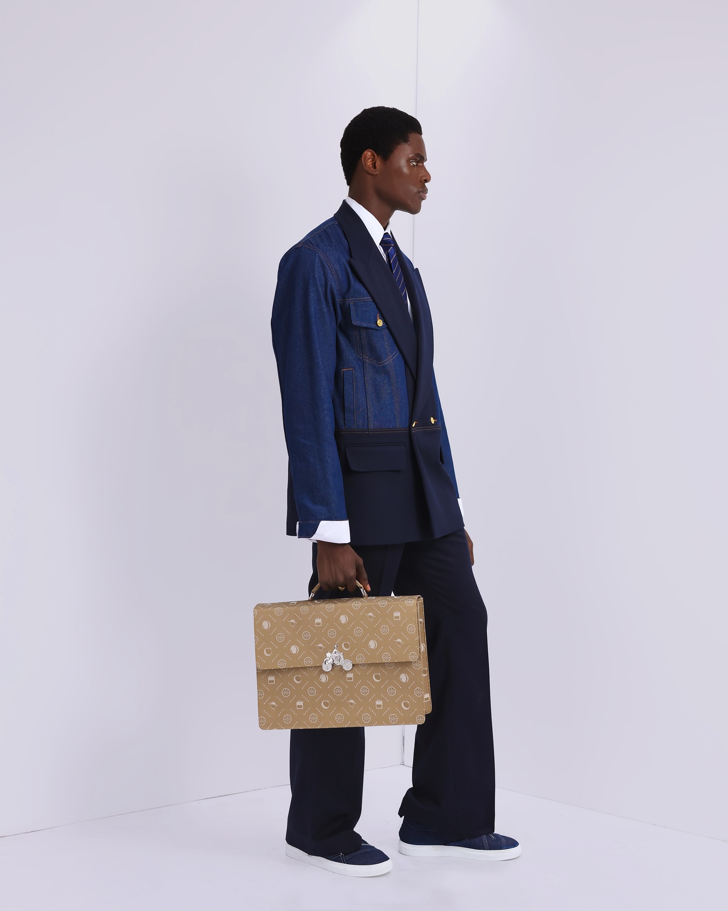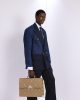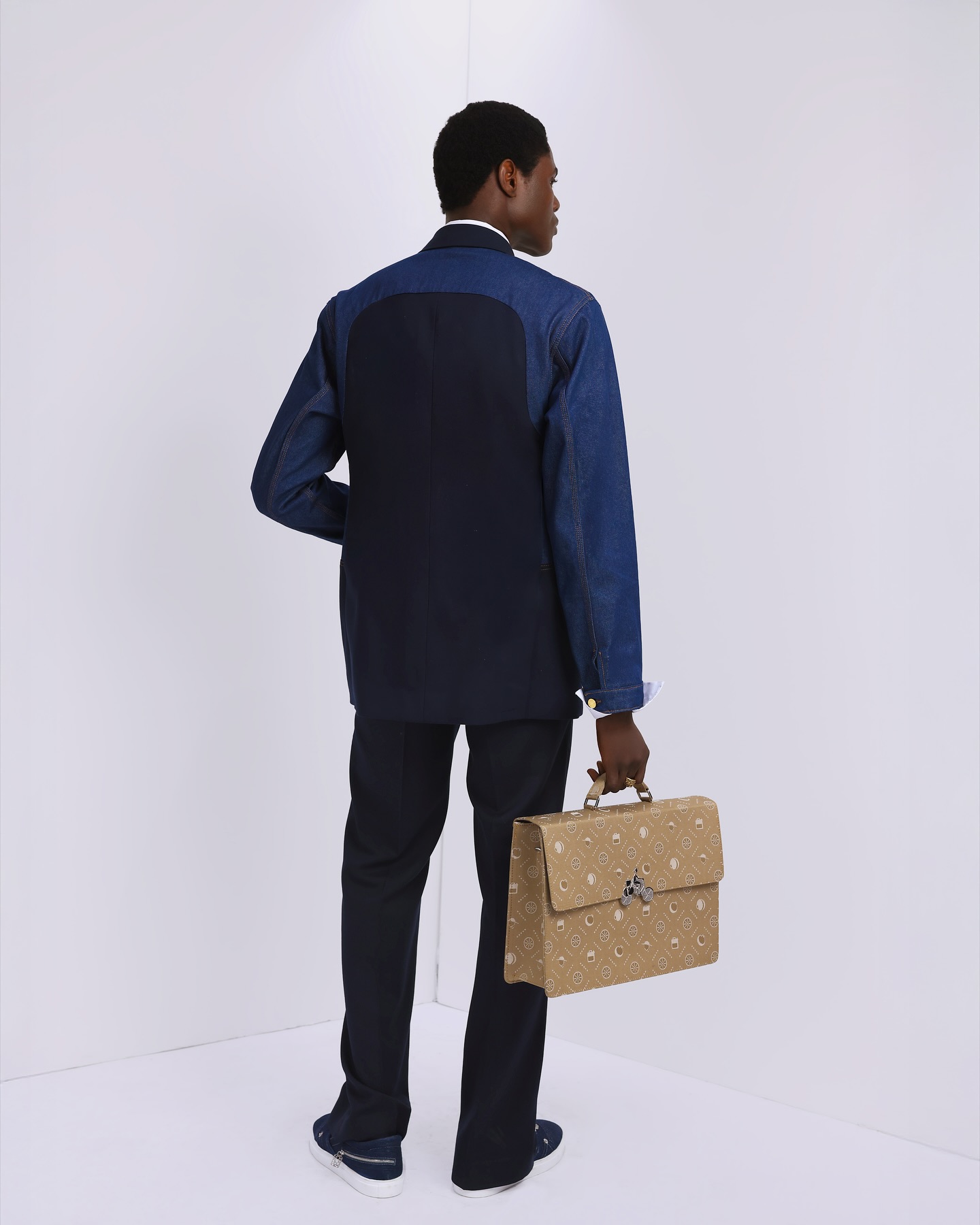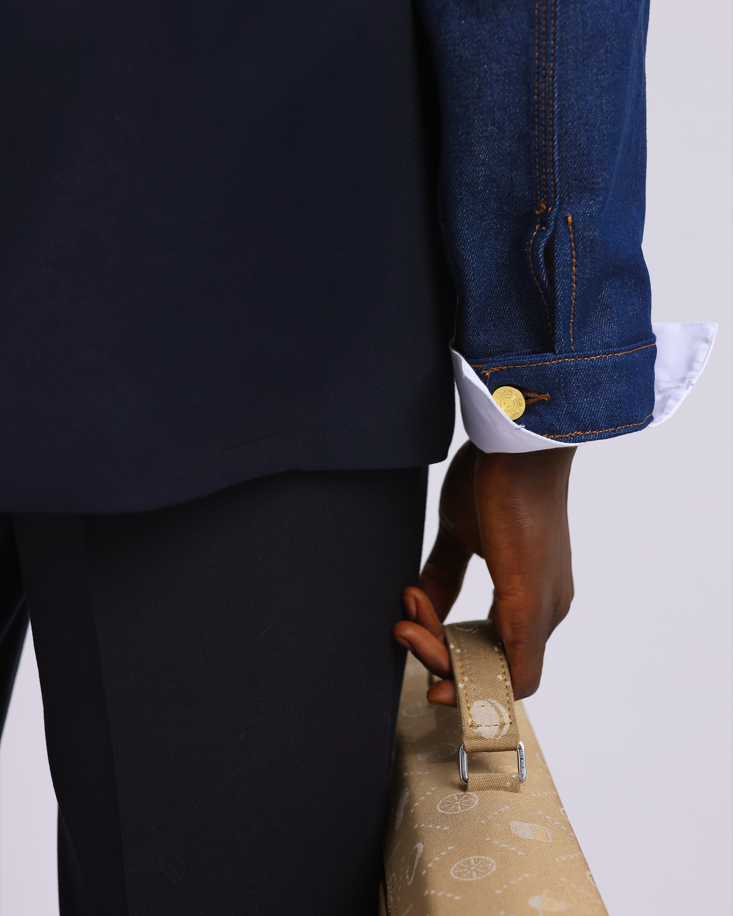 The UC3-LK 10 Jacket is a navy blue double-breasted denim jacket with layered details and gold buttons. It pairs with a wool pant cut in a slight trumpet shape for a comfortable, balanced fit. Clean, structured, and easy to wear together.
