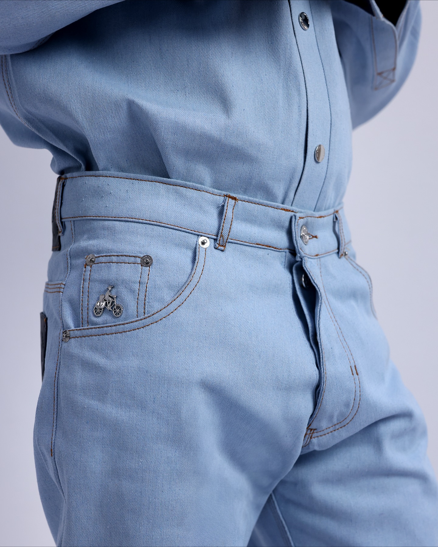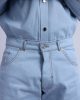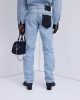 The UC3-LK 12 Denim Pant is A straight cut denim pant in skye blue. It features canvas-embossed leather, silver rivet and snap details, and a leather patch pocket for a clean, practical finish.