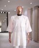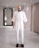 This is a two-piece kaftan set in a crisp white fabric, designed for a clean, tailored look. It features 3/4 length sleeves and a unique geometric stepped placket with a concealed button closure. The set comes complete with matching white trousers. It’s a versatile outfit suitable for special events, ceremonies, or as a sharp, smart-casual option.