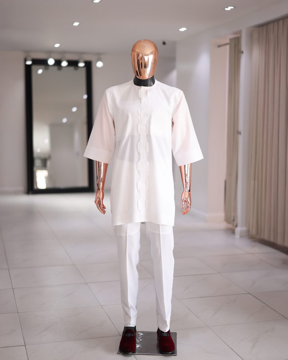 This is a two-piece kaftan set in a crisp white fabric, designed for a clean, tailored look. It features 3/4 length sleeves and a unique geometric stepped placket with a concealed button closure. The set comes complete with matching white trousers. It’s a versatile outfit suitable for special events, ceremonies, or as a sharp, smart-casual option.