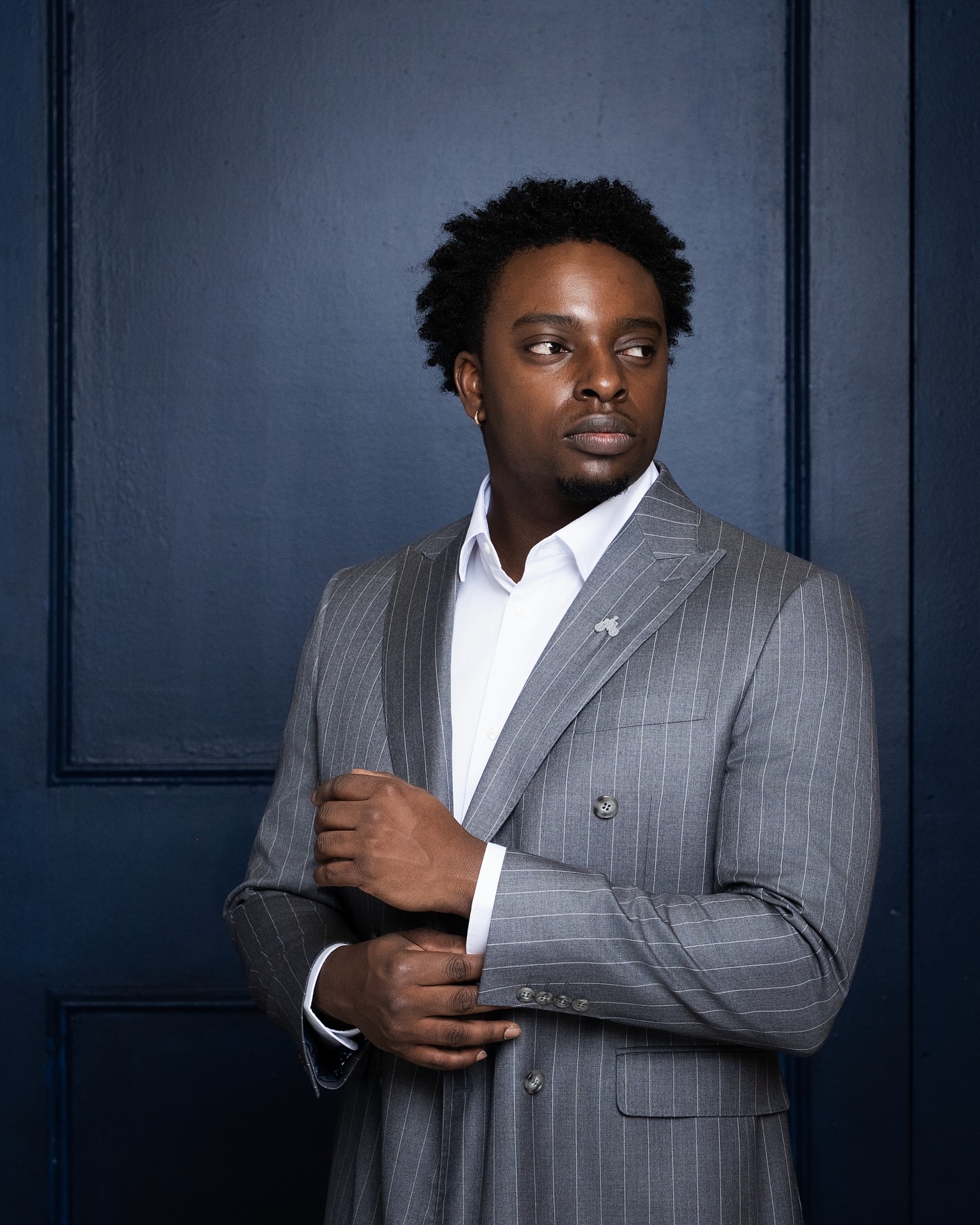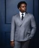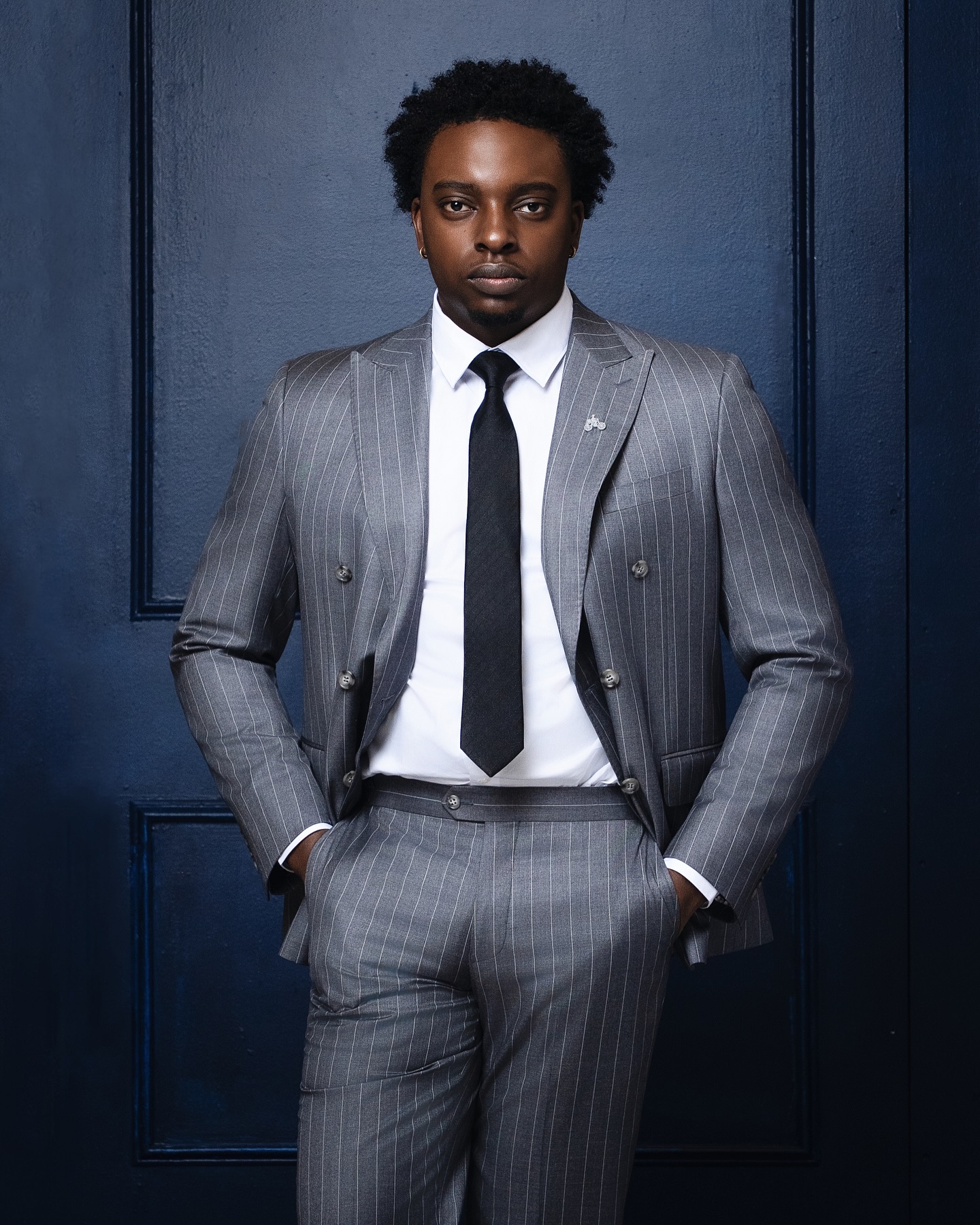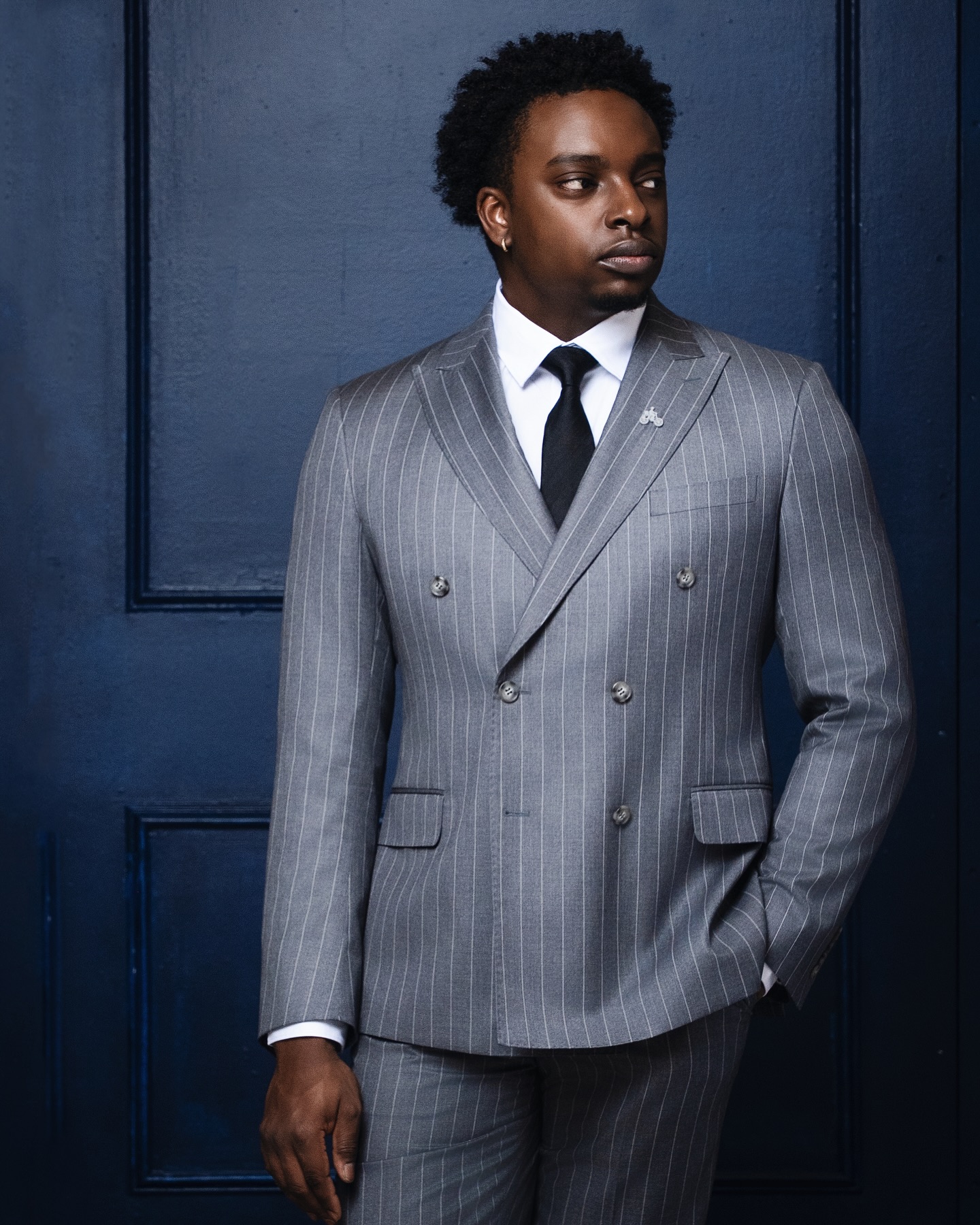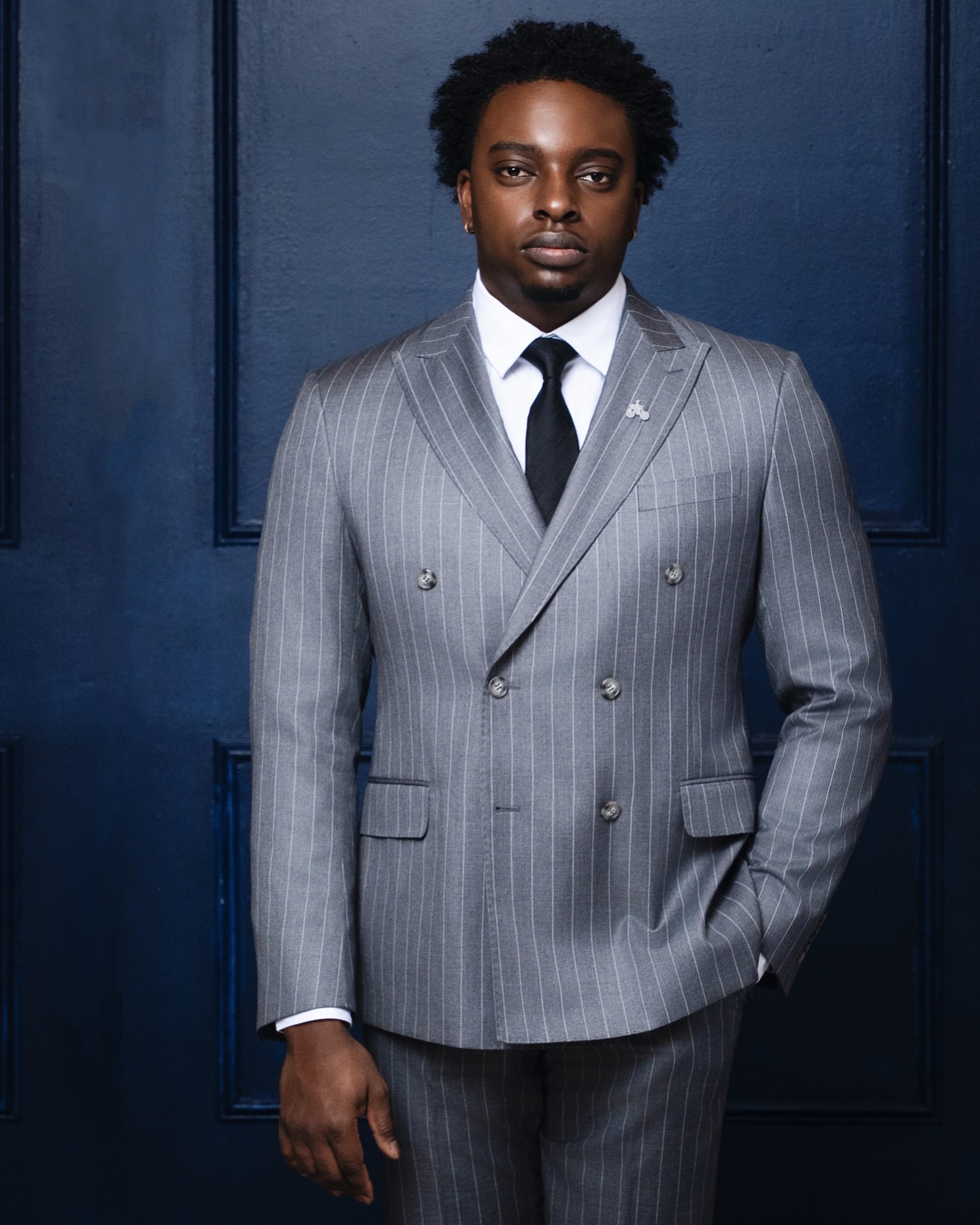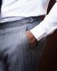 The Businessman suit is crafted from grey pencil stripes. This double-breasted design features a peak lapel for a polished look, paired with matching trousers for a clean, professional finish. Perfect for meetings, presentations, or any occasion where you want to look confident and put-together.